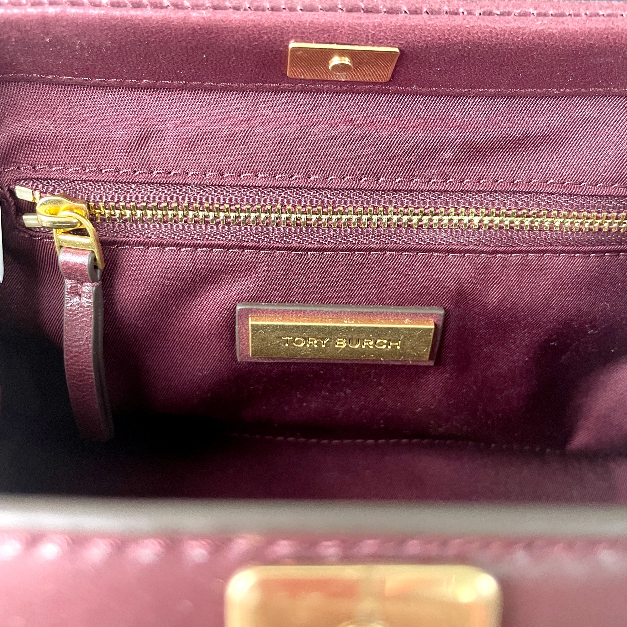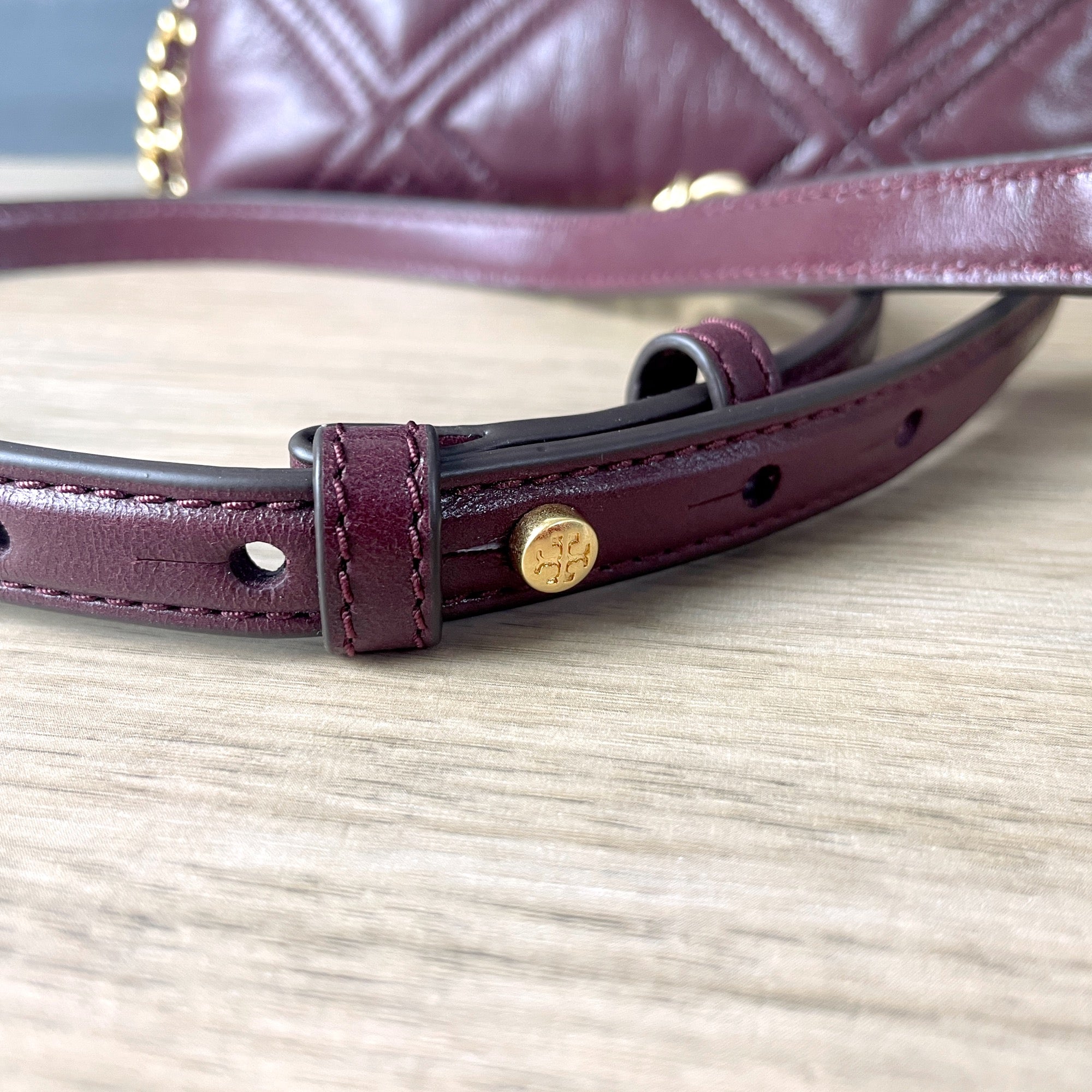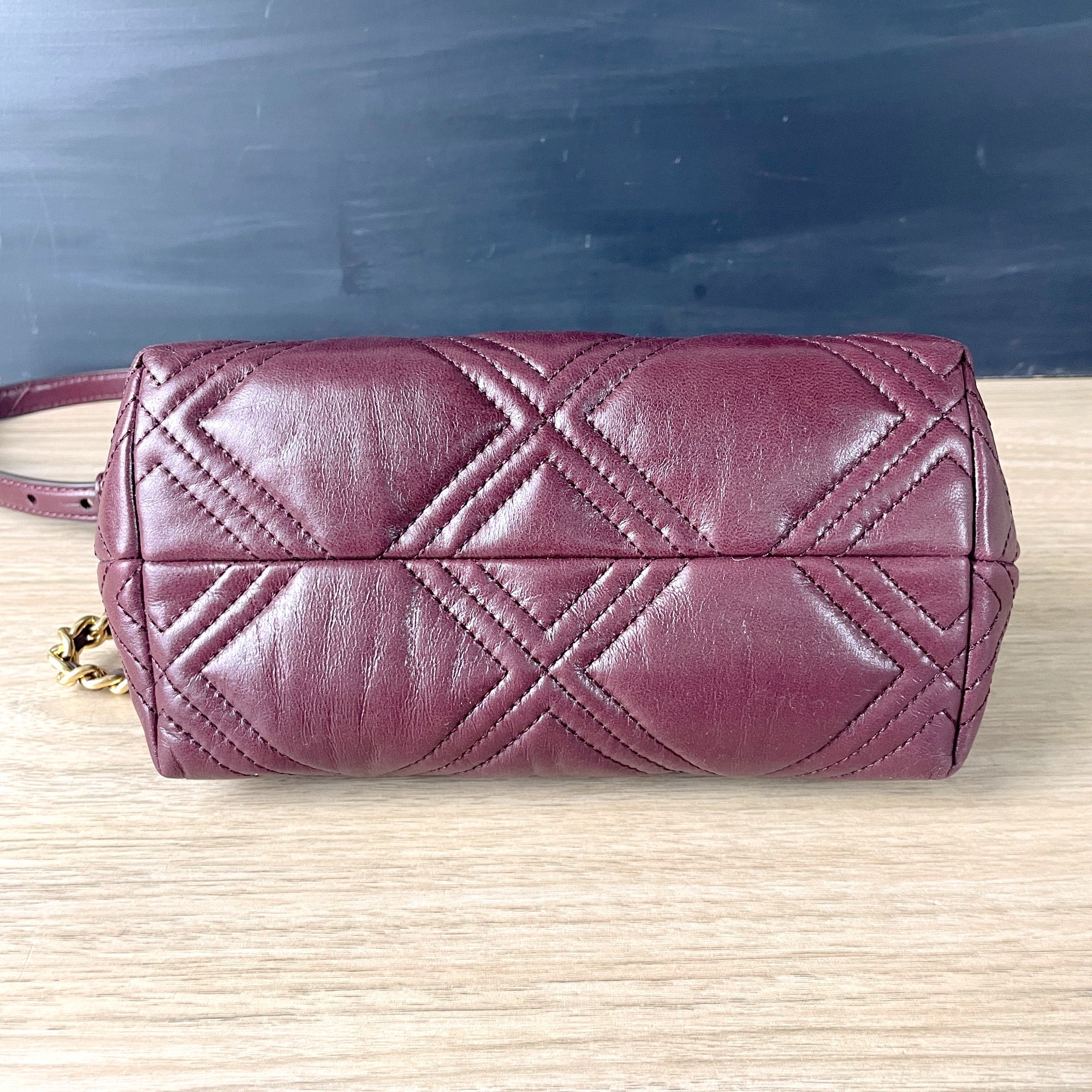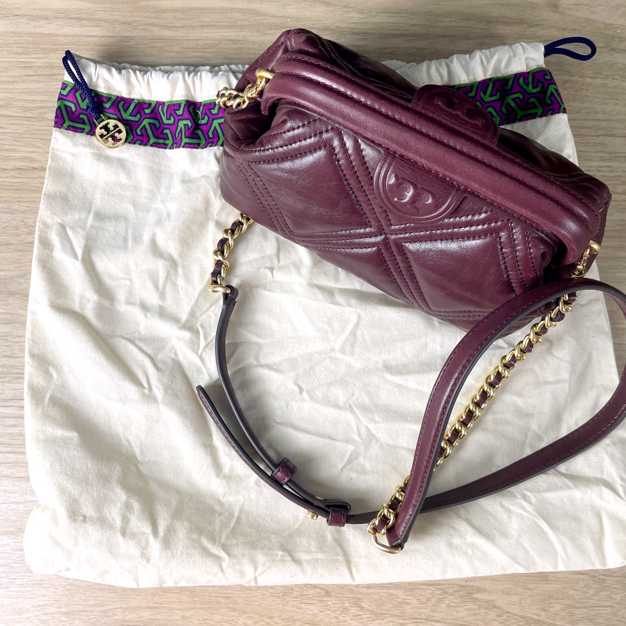 Like new Tory Burch Fleming leather soft frame shoulder bag. Pretty merlot colored quilted leather with embossed T on flaps on both sides. Magnetic snap closure. Adjustable and detachable strap, a combo of metal chain and leather. Textile lined with one zipper and one slip pocket. With dust bag. Retail $598.