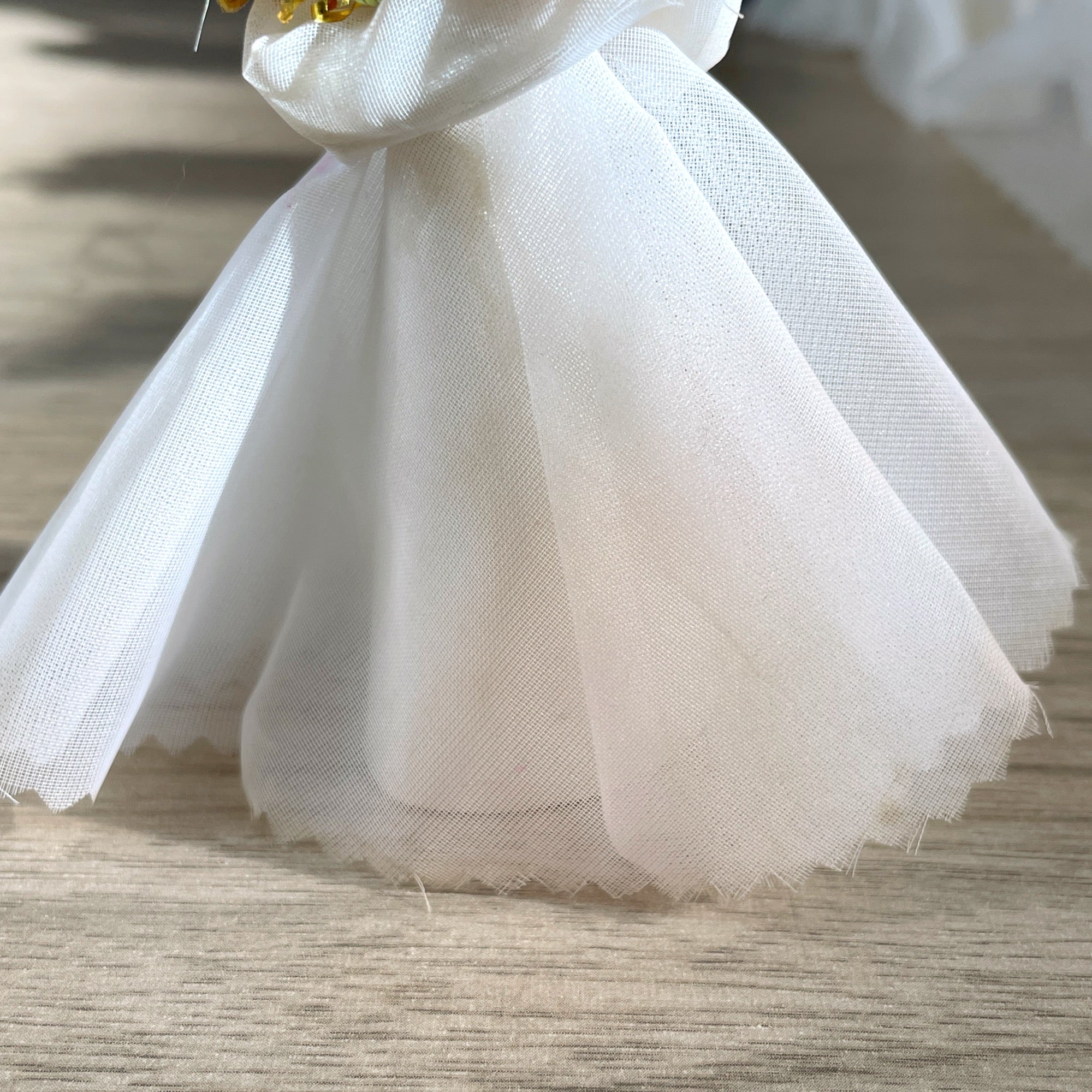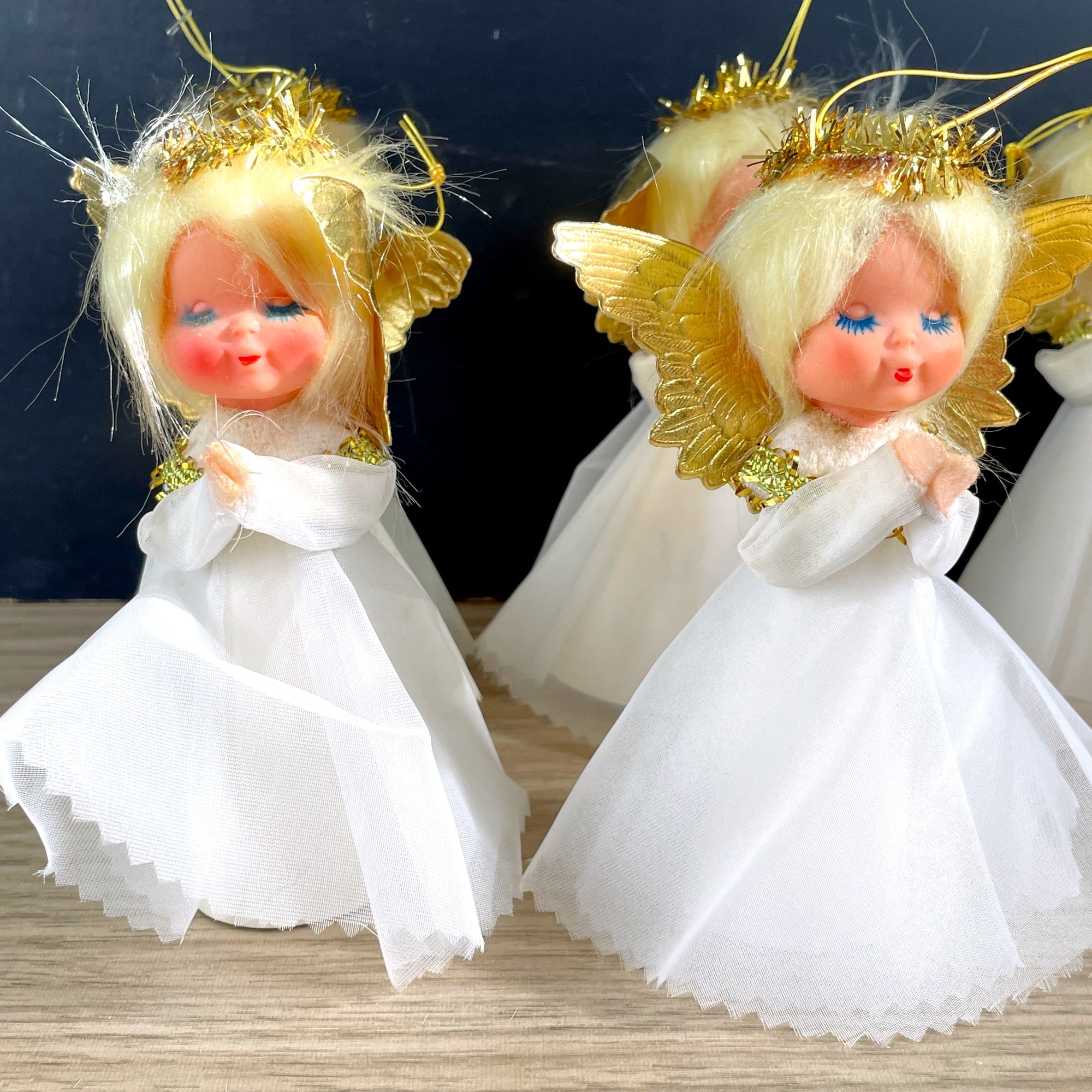 CONDITION Ornaments are sturdy. There is some discoloring on the white organza and collars, some have it more than others. You can see it for sure if you're looking for it but not at a distance. See pix. The boss angel had gold stars under her skirt on her plastic cone and two are gone. We're not sure they added much anyway. We would stick on some glittery stars because, you know, glitter.
