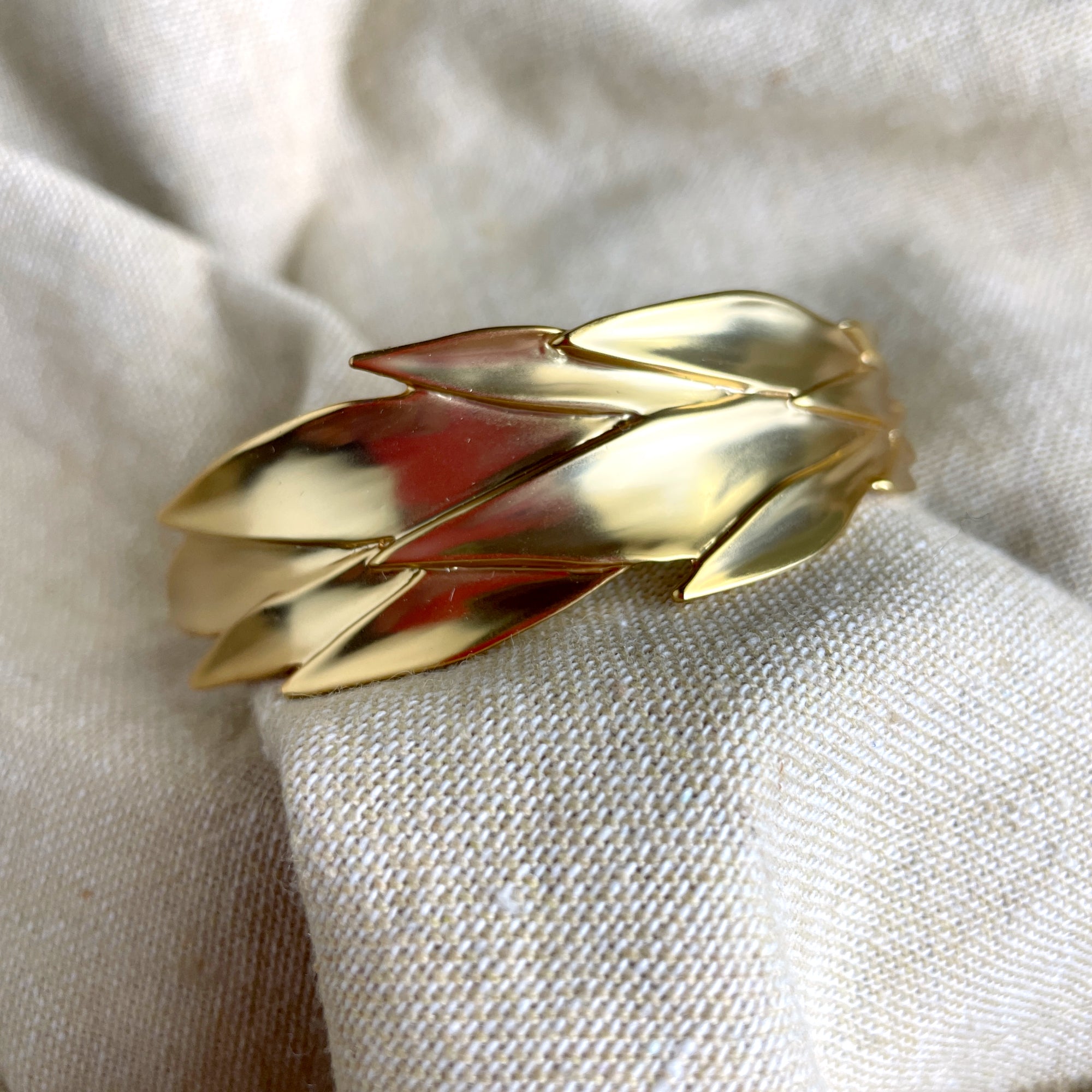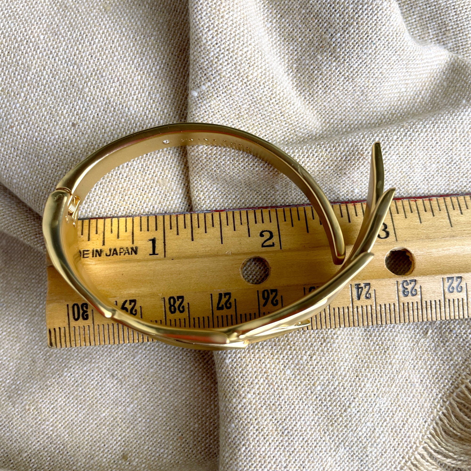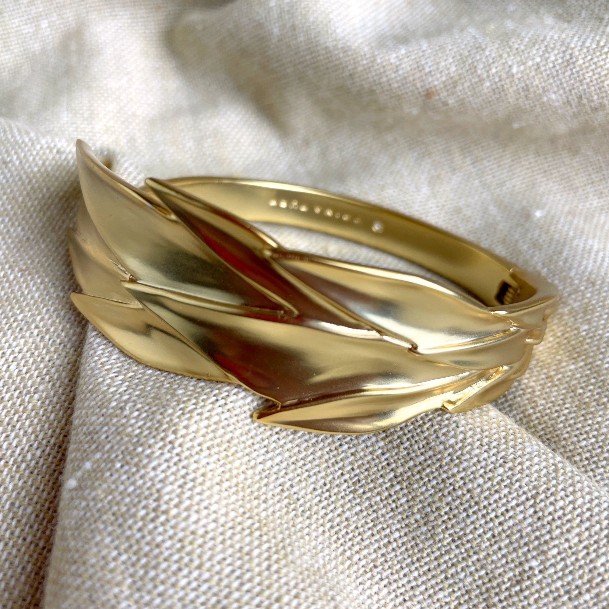 Trina Turk goldtone hinged leaf cuff bracelet. The leaf pattern is 4.5 inches long from hinge to tip. The bottom band is 1/4" wide. Stamped Trina Turk on the inside.
