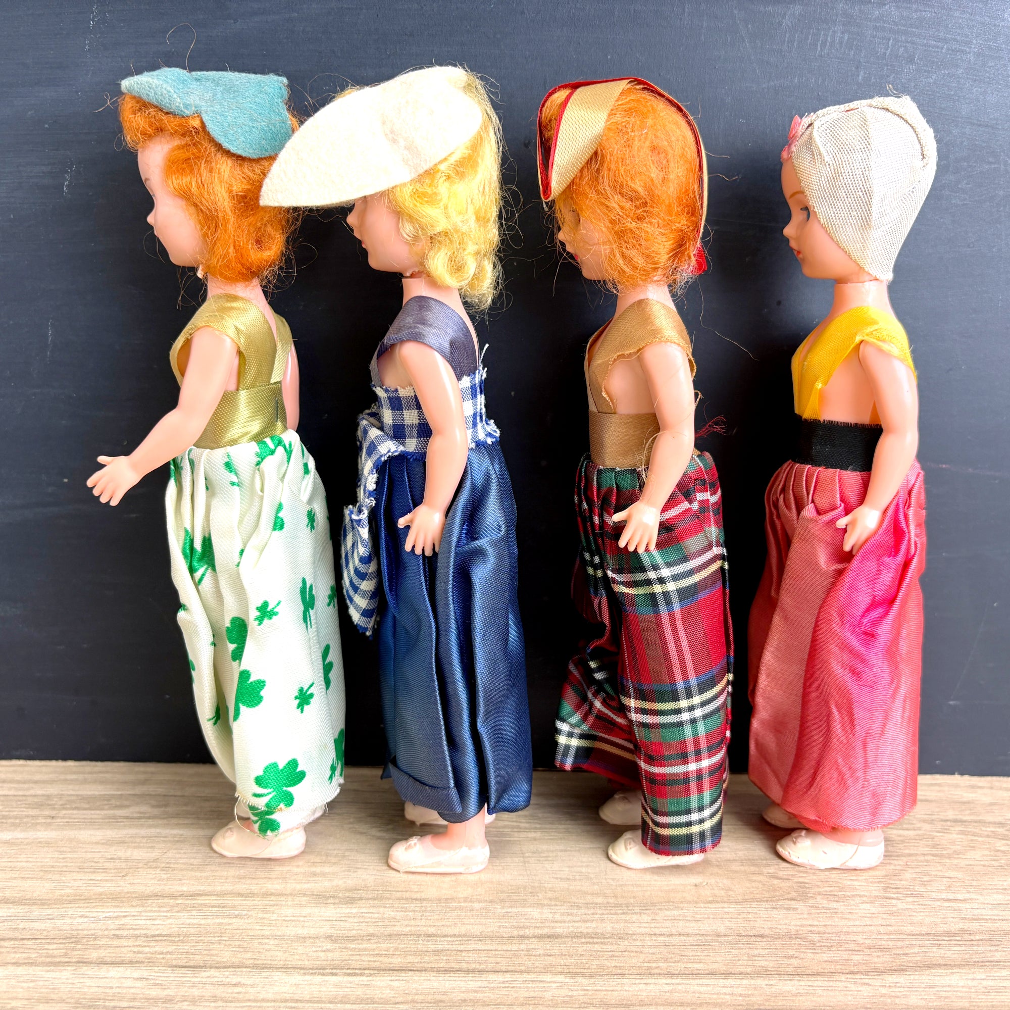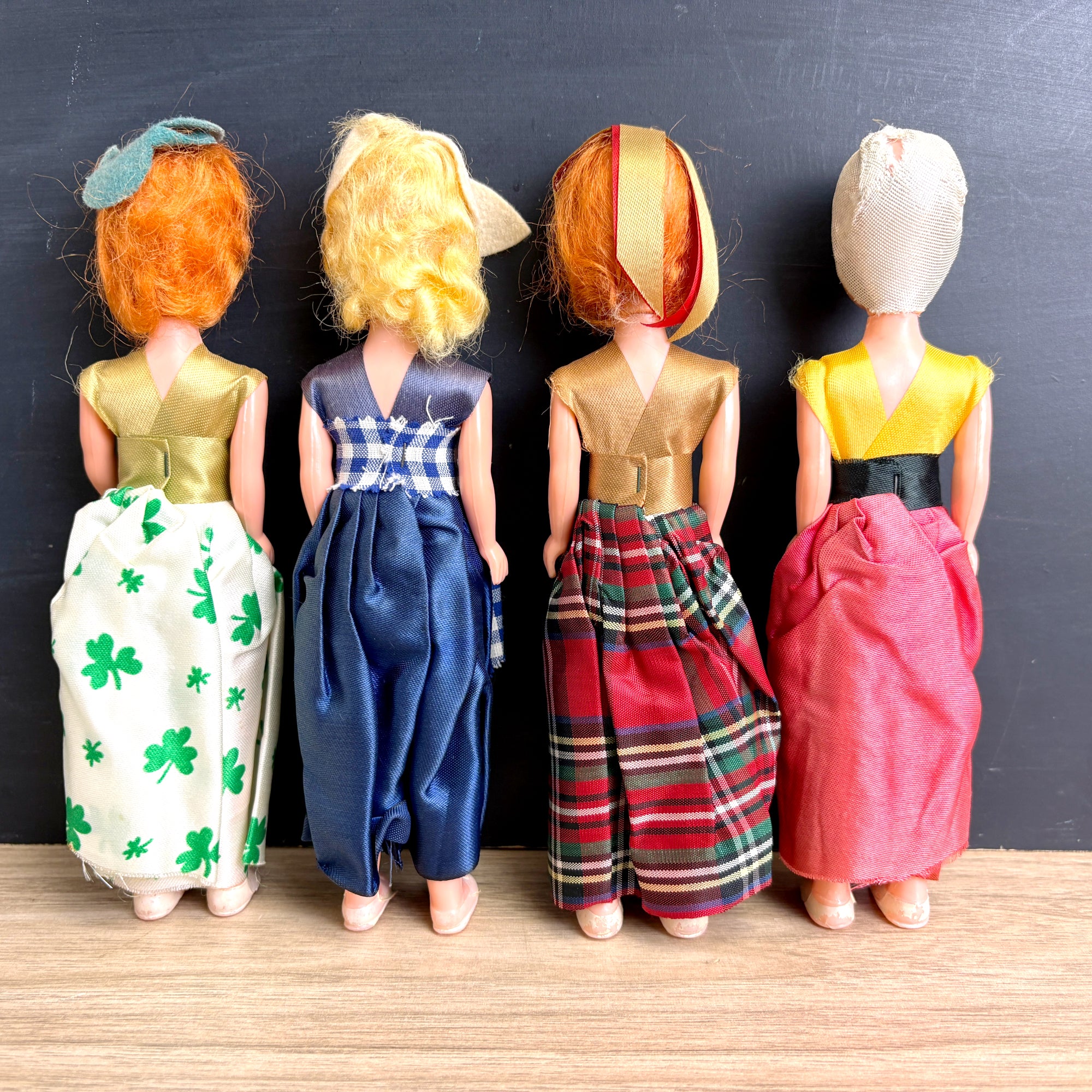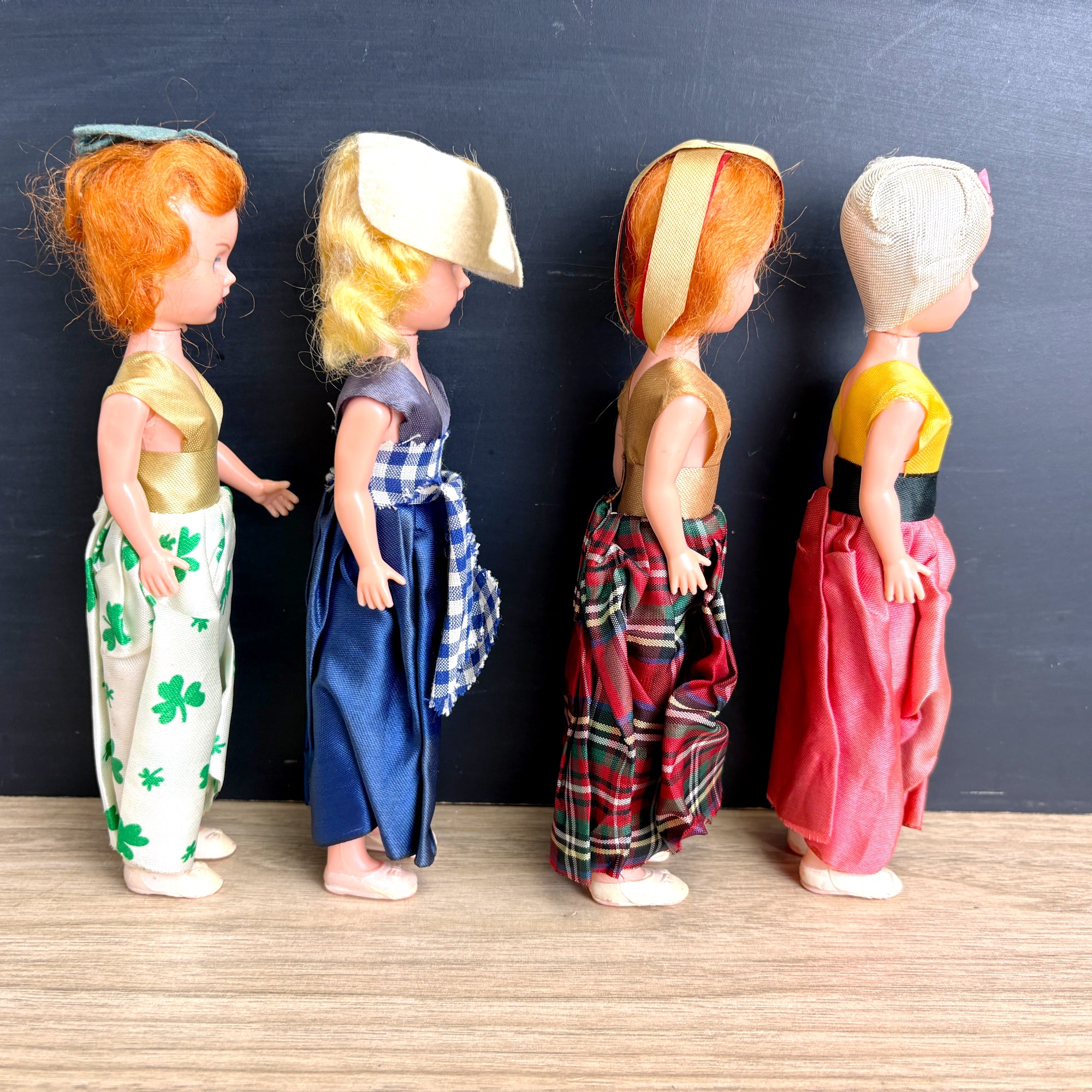Set of 4 vintage international dolls, each dressed in traditional costumes from around the world. These 8-inch plastic dolls were made in Japan in the 1950s and feature movable arms and blue sleep eyes that open and close.
