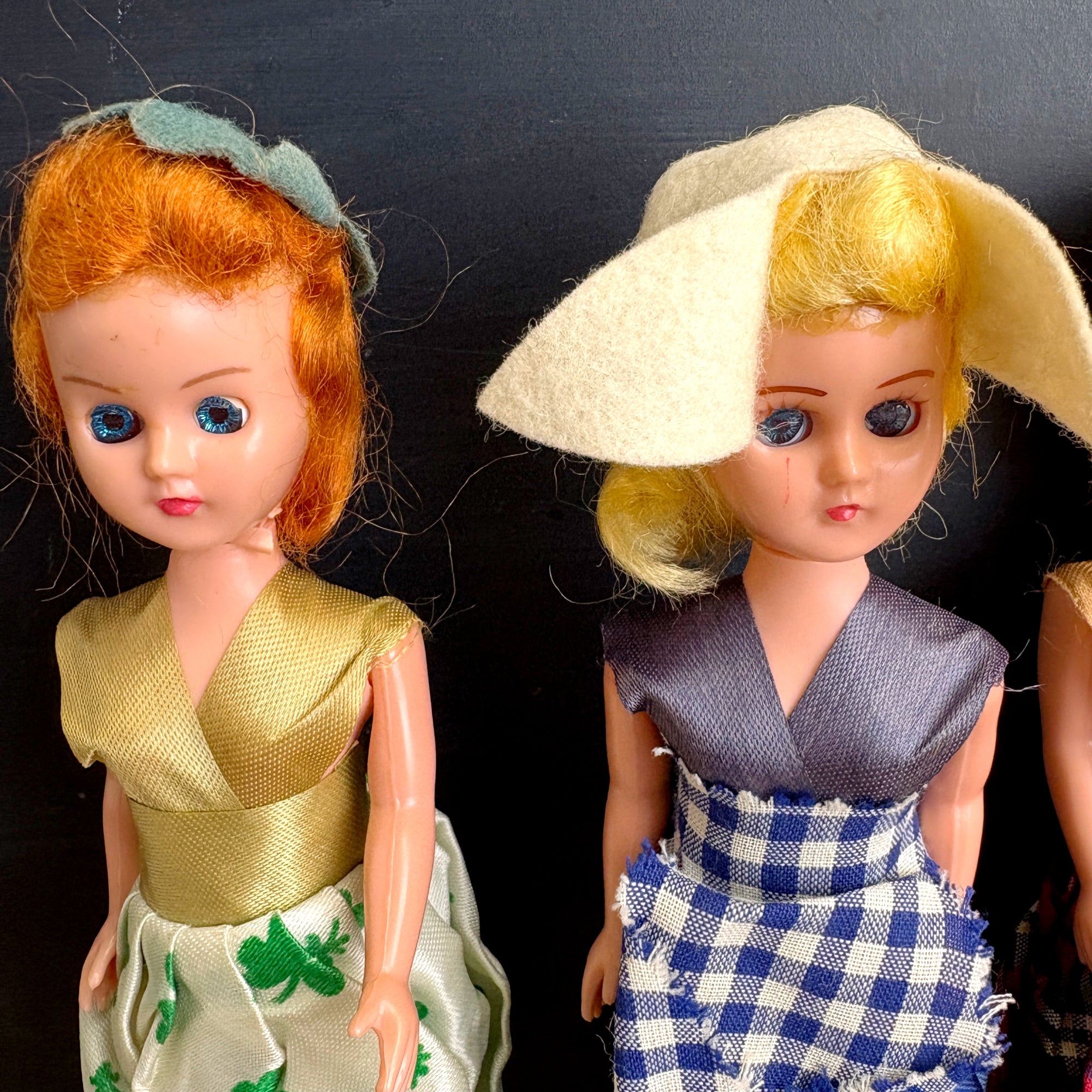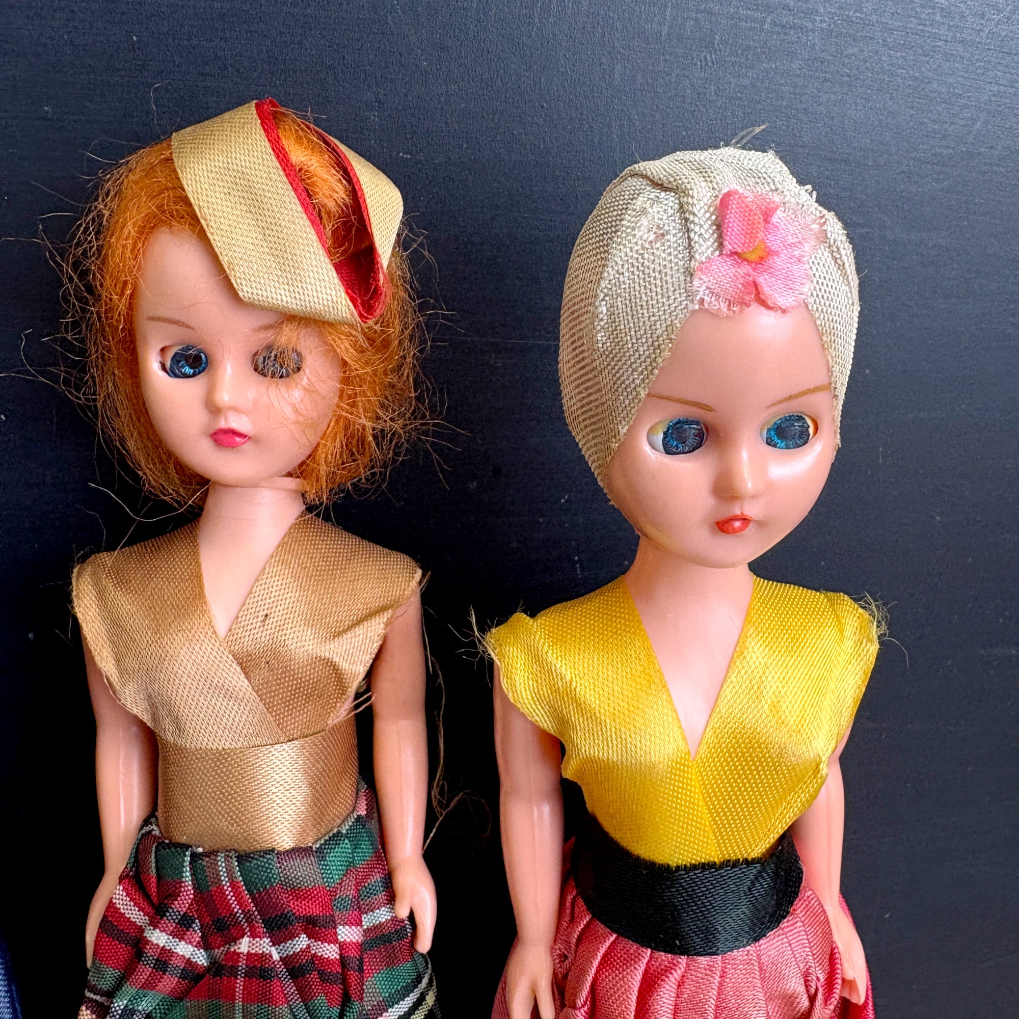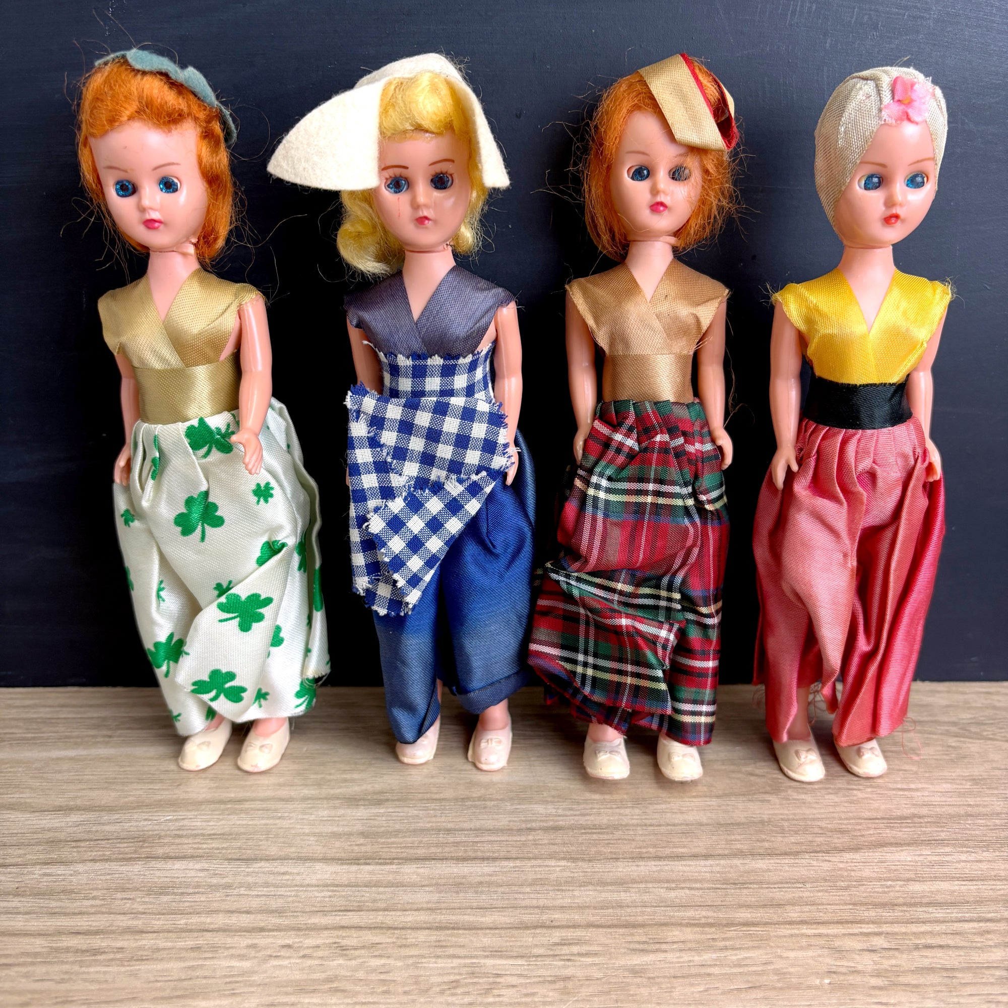 Set of 4 vintage international dolls, each dressed in traditional costumes from around the world. These 8-inch plastic dolls were made in Japan in the 1950s and feature movable arms and blue sleep eyes that open and close.