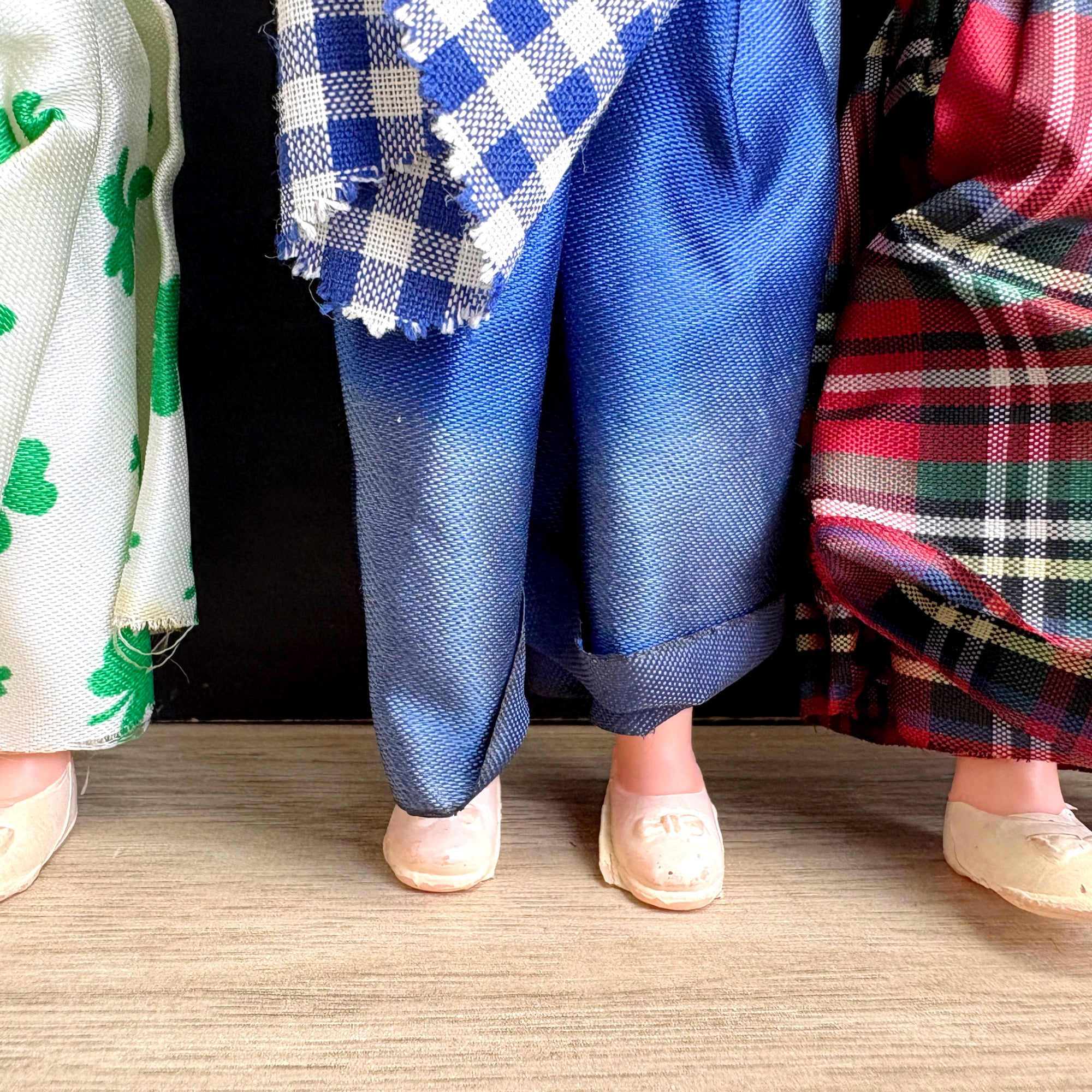 Each doll wears simple culturally inspired outfits with painted on shoes, perfect for display, doll collectors, or vintage crafting projects. Novelty quality, made more for display than for play.