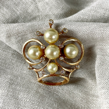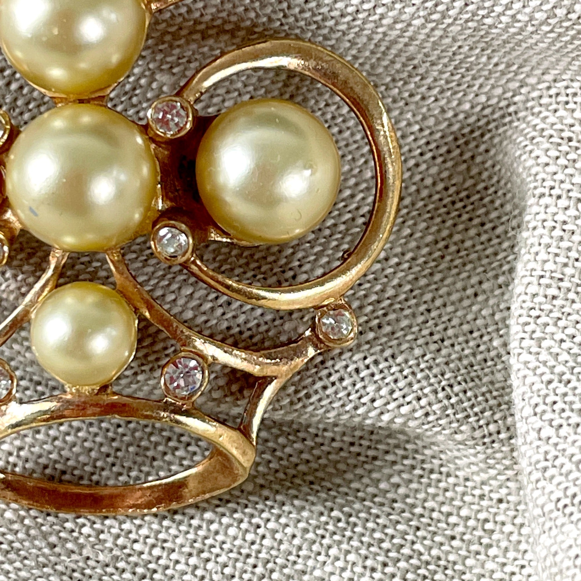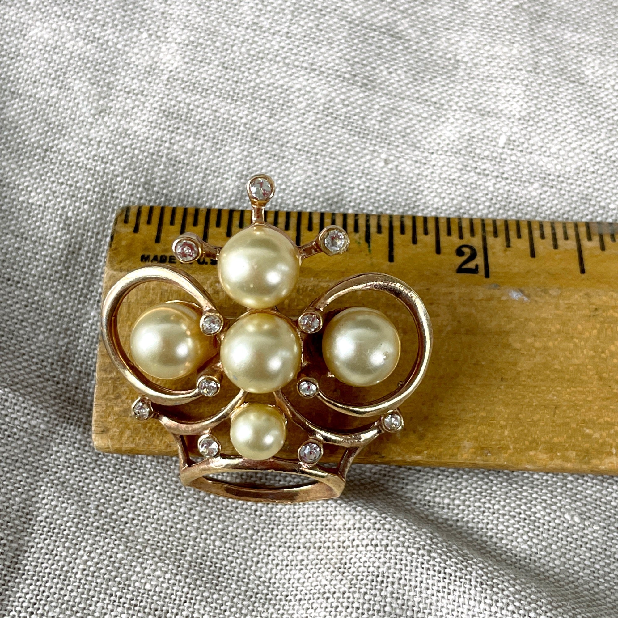 Vintage 1950s goldtone crown brooch with atomic style. Large cream faux pearls and crystals. No markings, alas.
