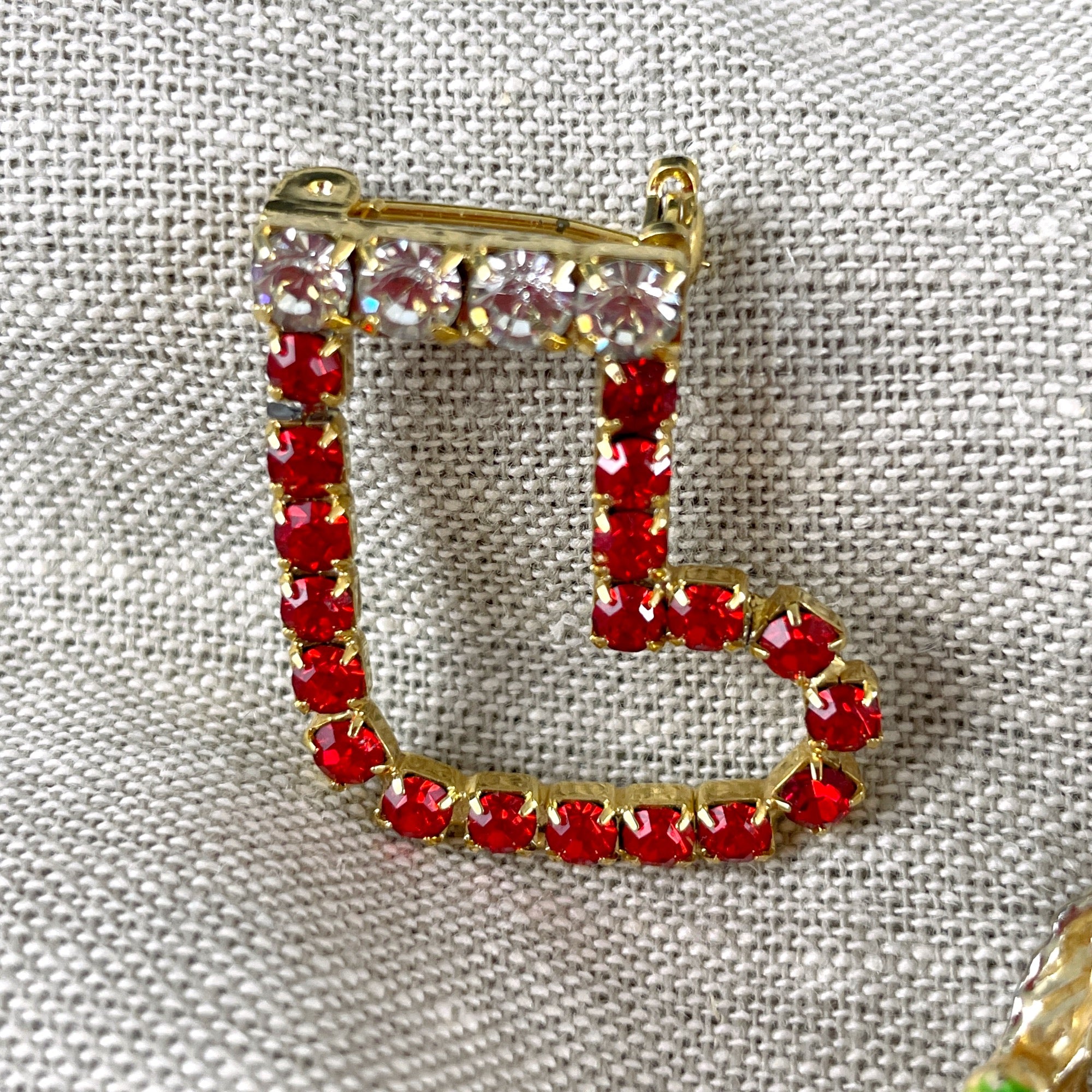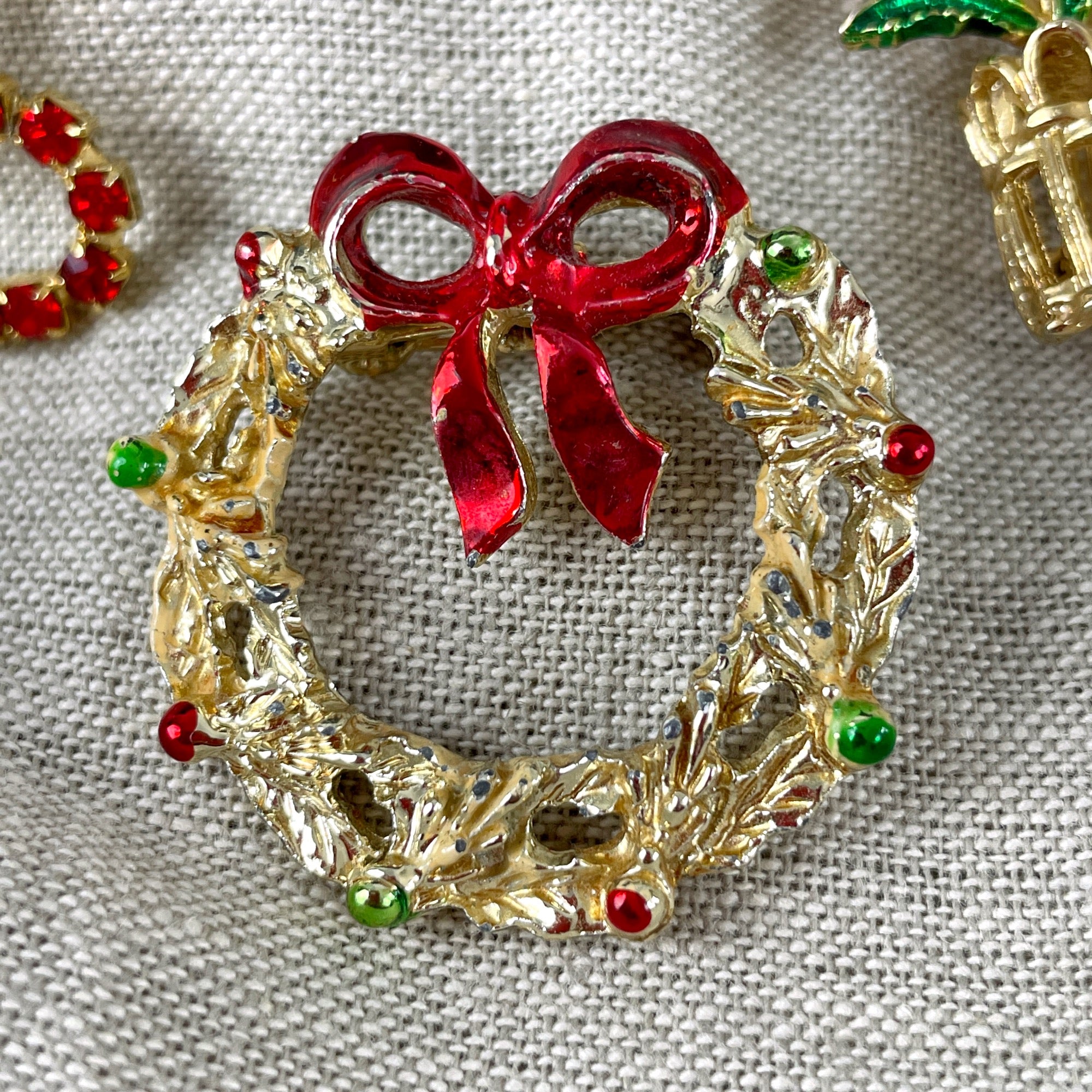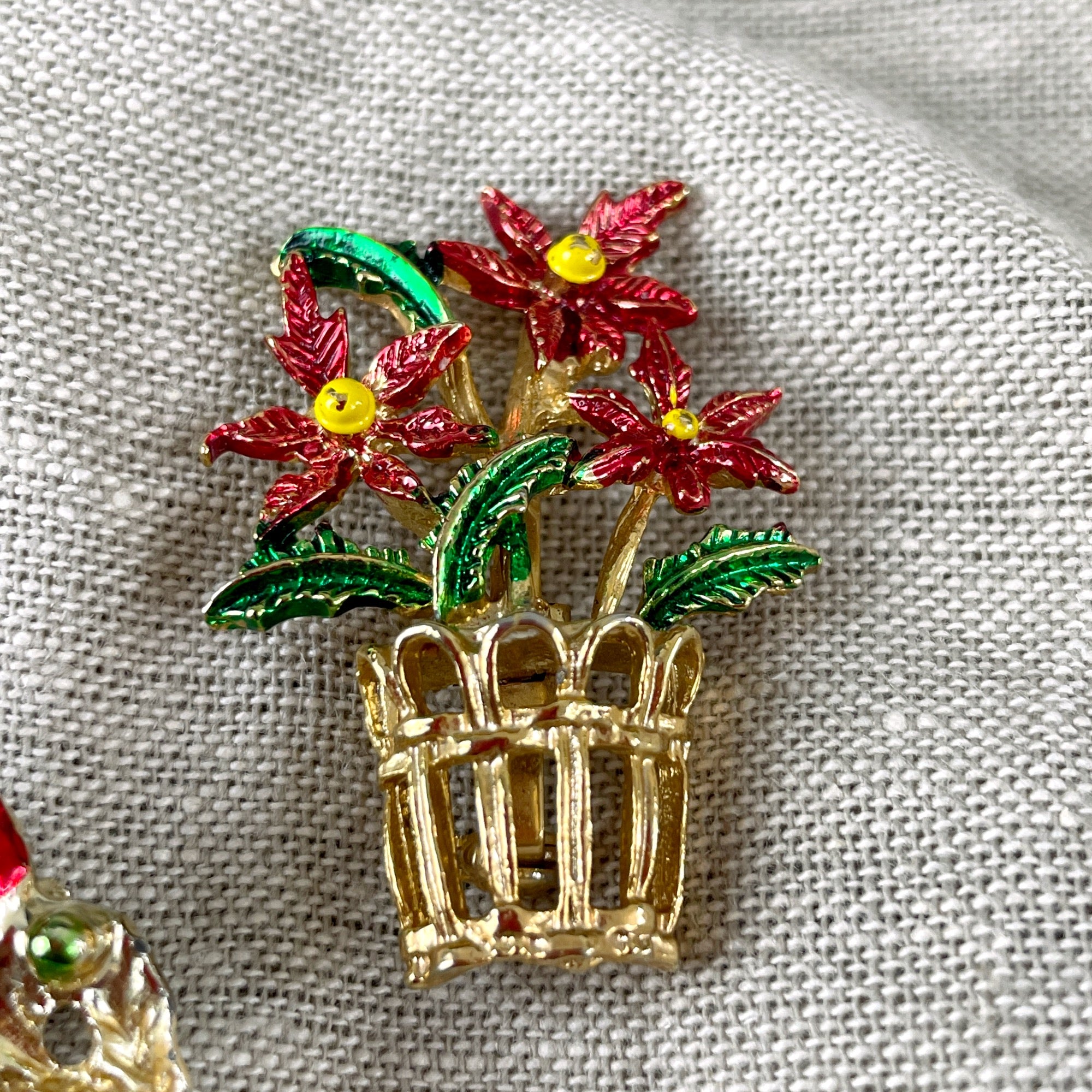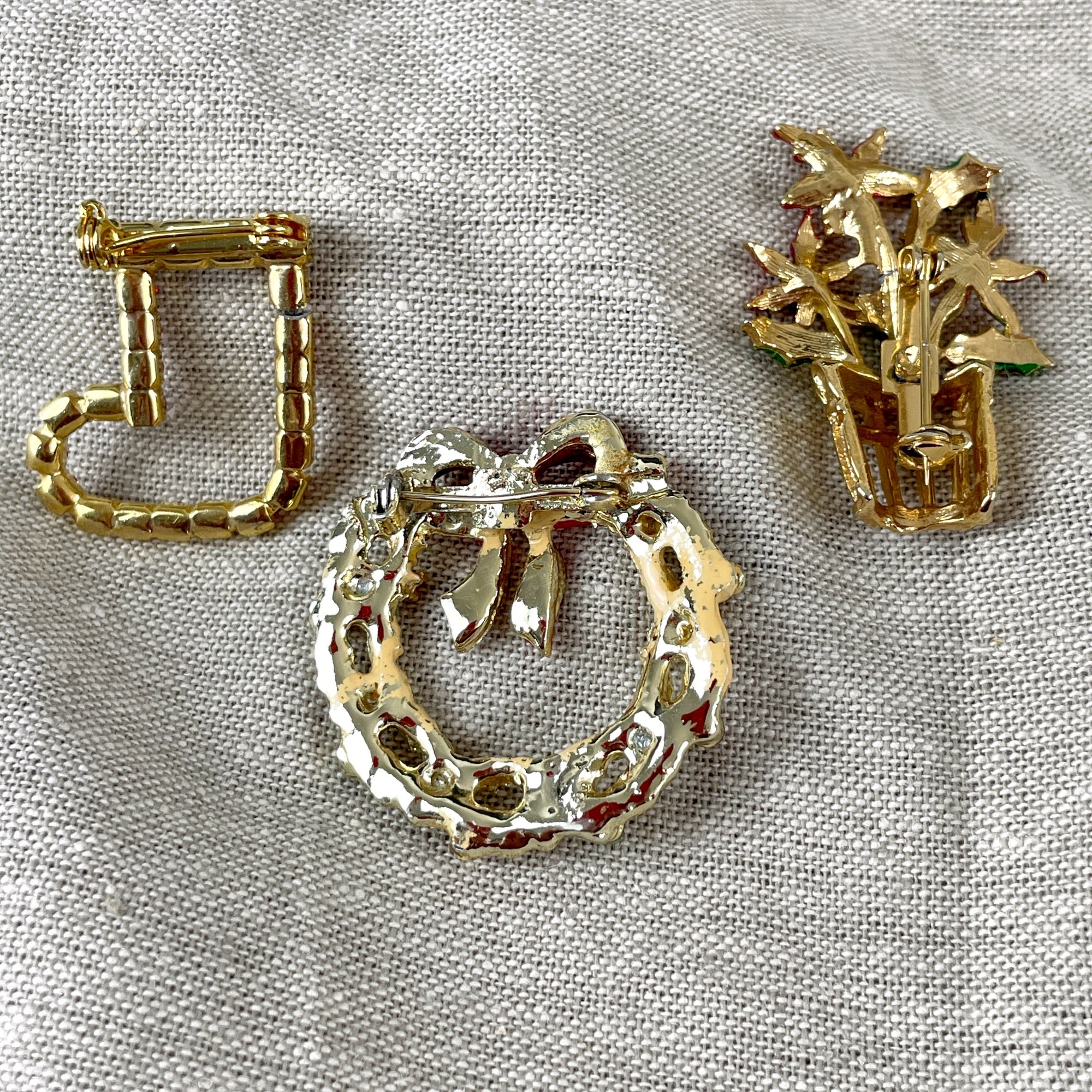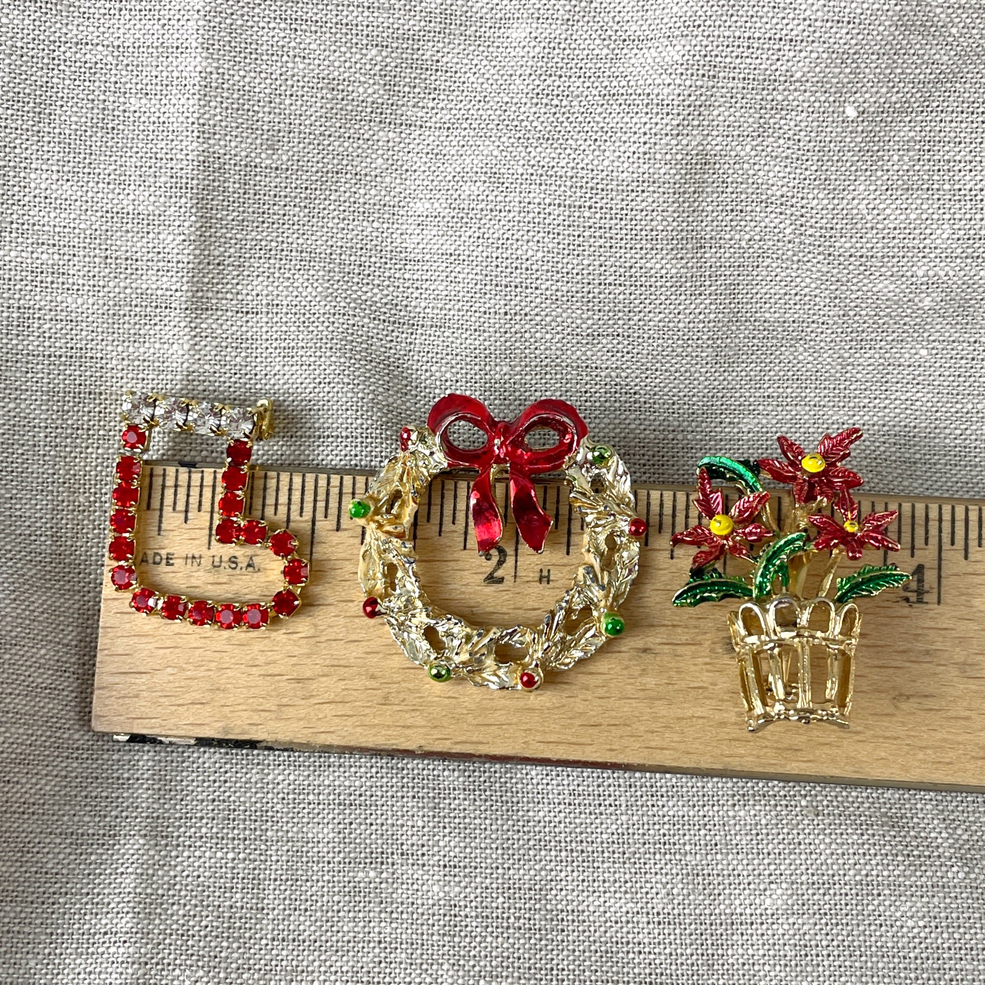 Set of 3 vintage holiday Christmas pins. Stocking has red and white rhinestones. Wreath has a red bow and red and green painted ornaments. Basket of poinsettias has green leaves and yellow painted centers. All are gold metal.