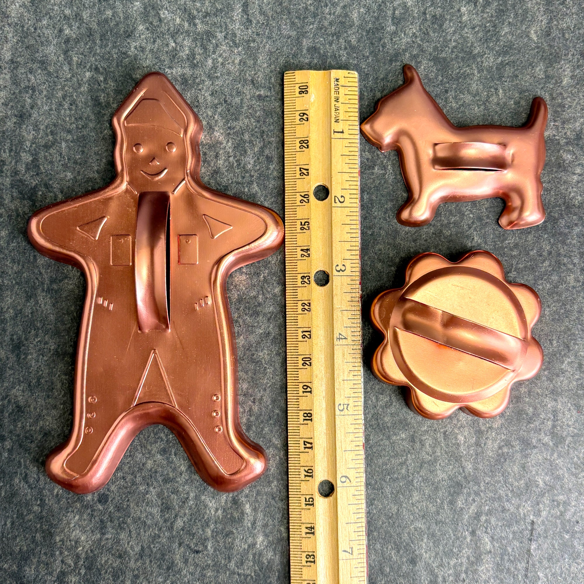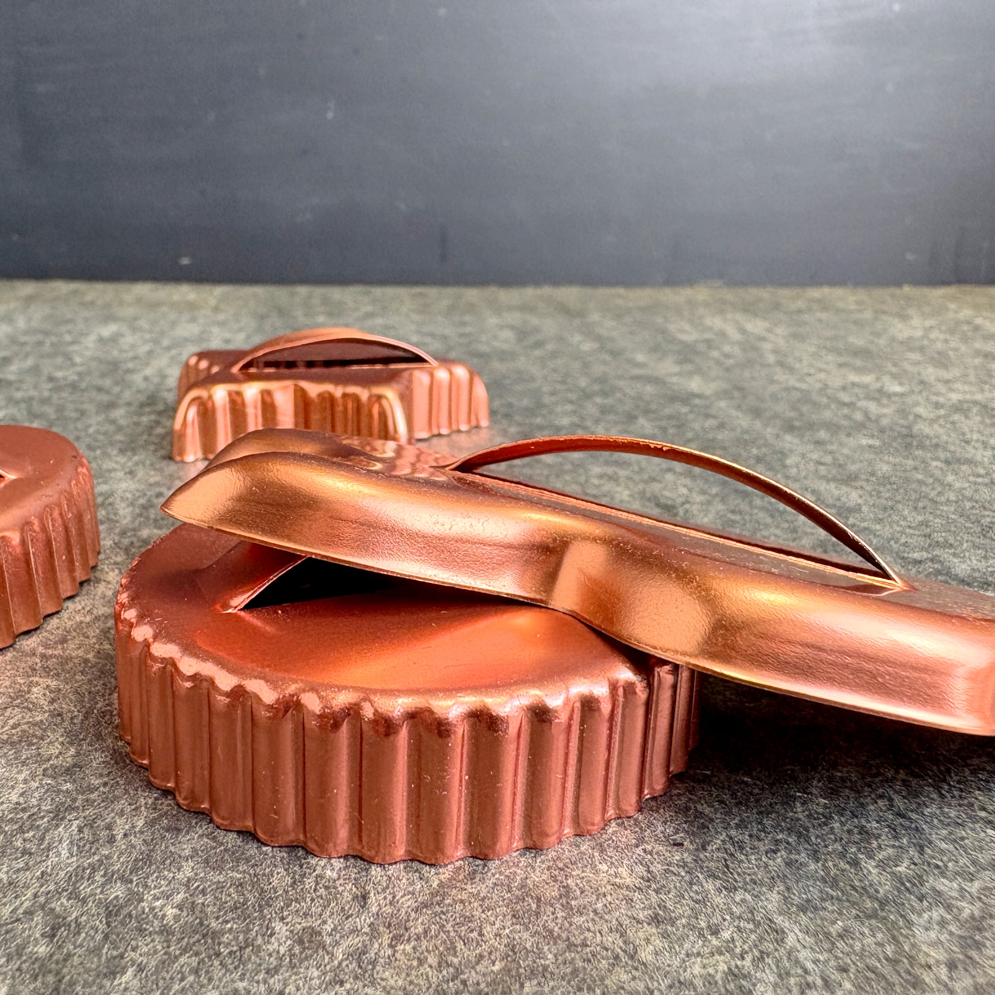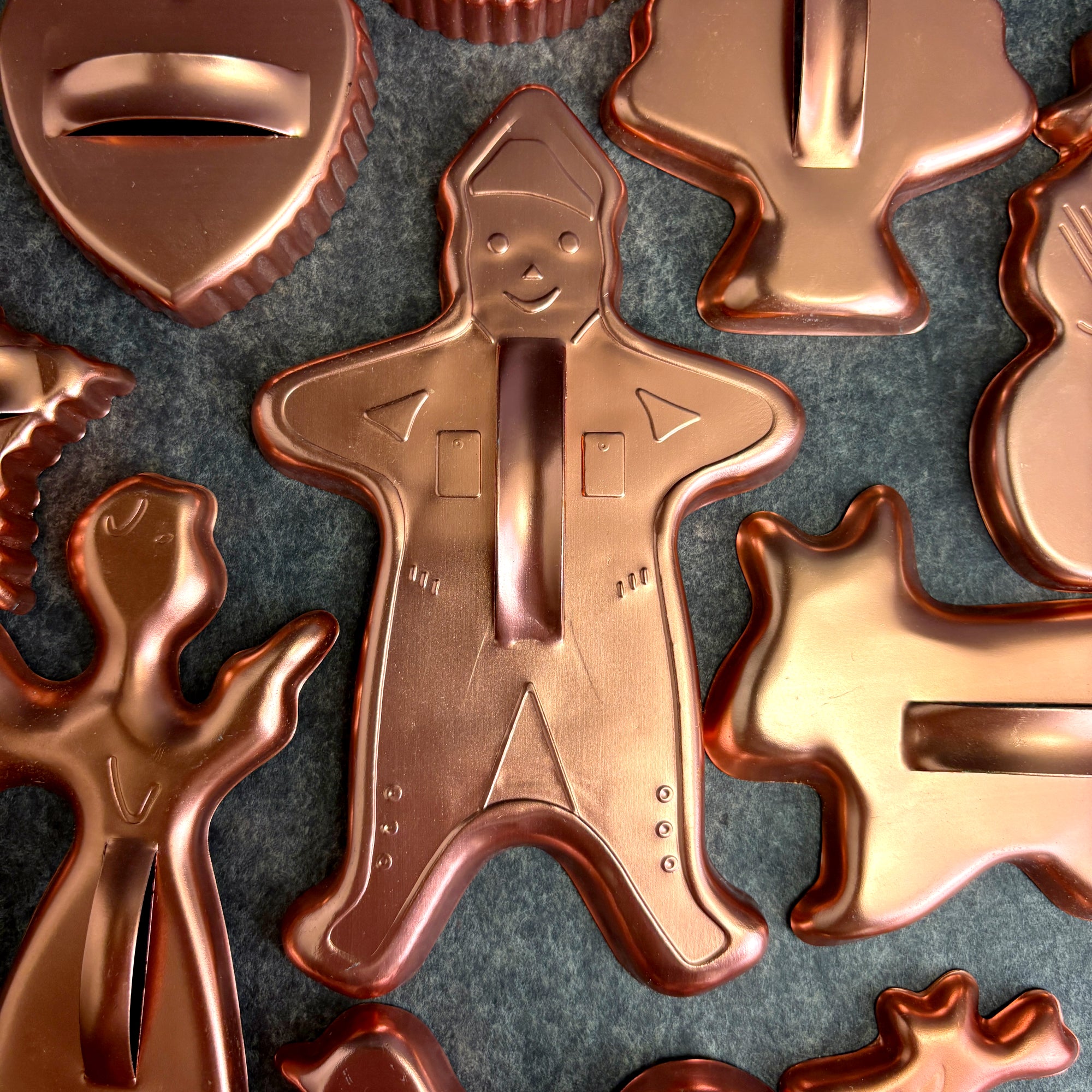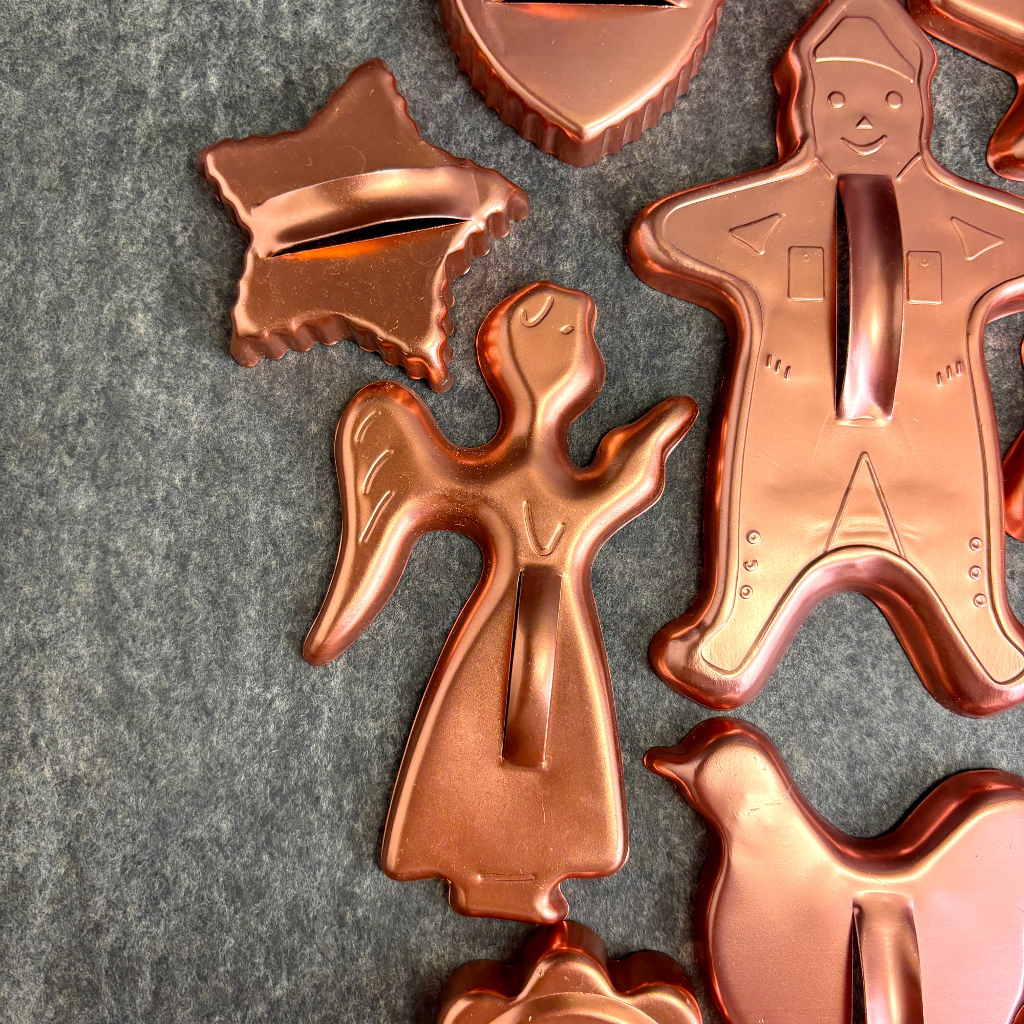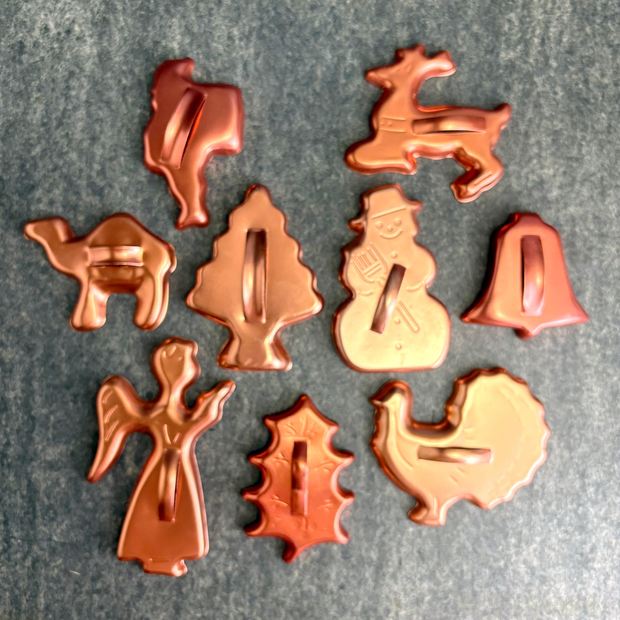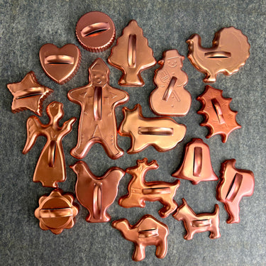 Vintage set of 17 copper-colored anodized aluminum cookie cutters. Lightweight yet sturdy, each cutter features a raised handle for easy pressing and cutting. Perfect for holiday baking, retro kitchen decor, or even play dough fun with kids.