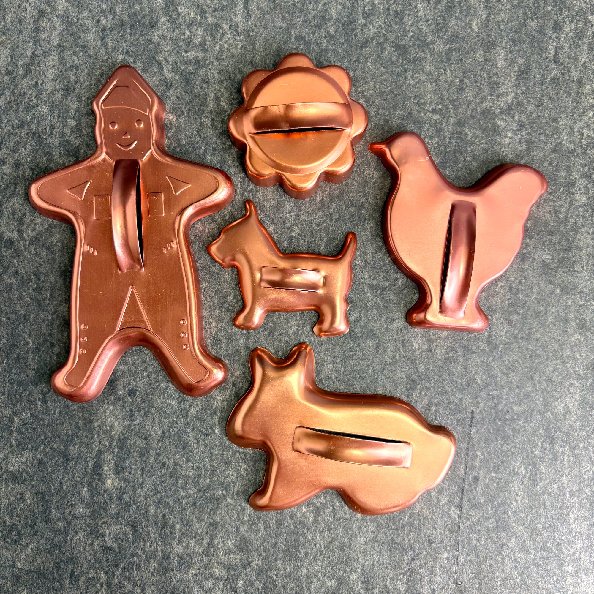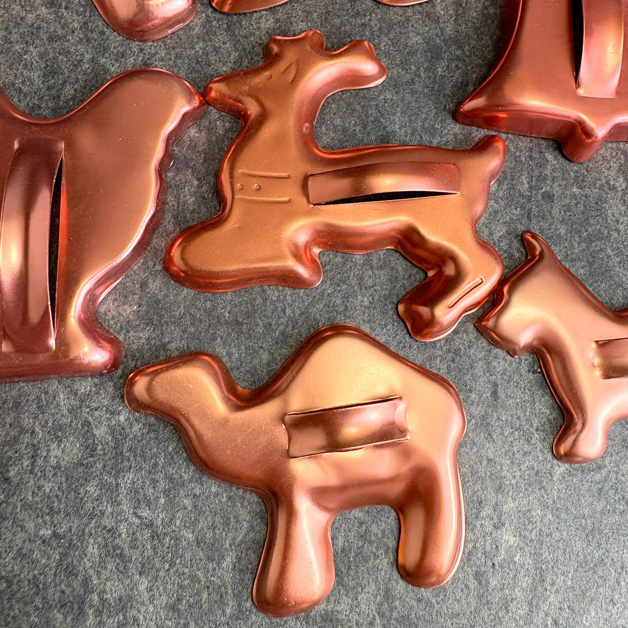 Vintage copper anodized aluminum cookie cutter set of 17 – holiday & animal shapes – 1950s-60s kitchen baking