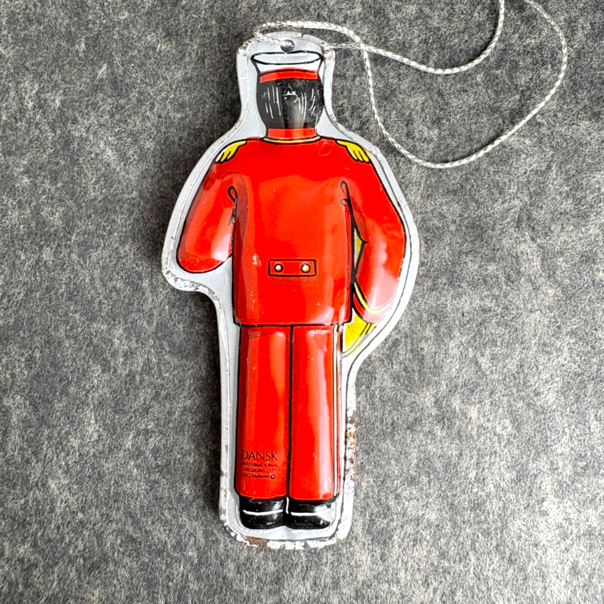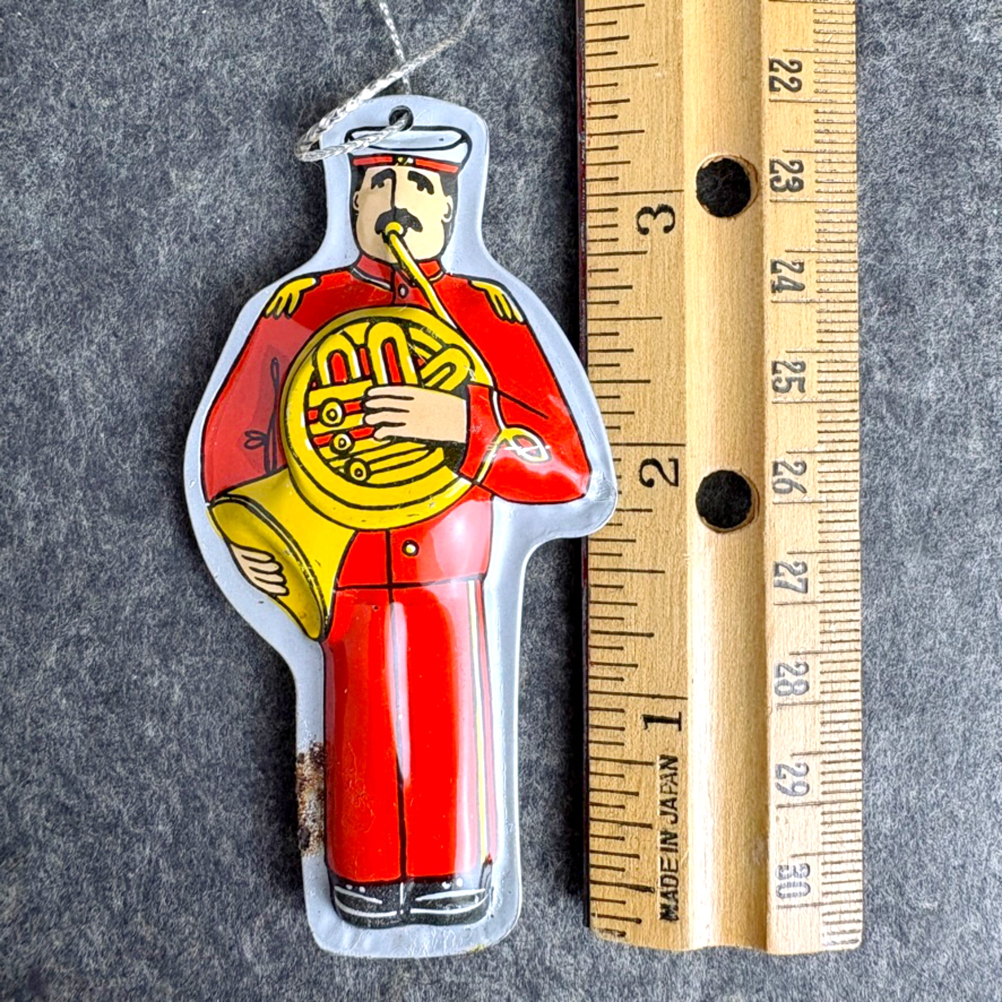 Vintage Dansk tin lithographed ornament featuring a French horn player from the Swedish Navy marching band. The ornament has a 3-dimensional front and back design and hangs from a silver cord, showcasing Dansk’s signature clean lines and European craftsmanship.