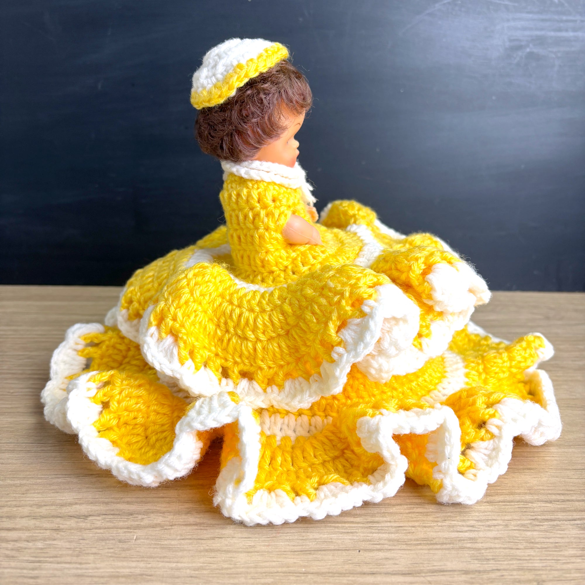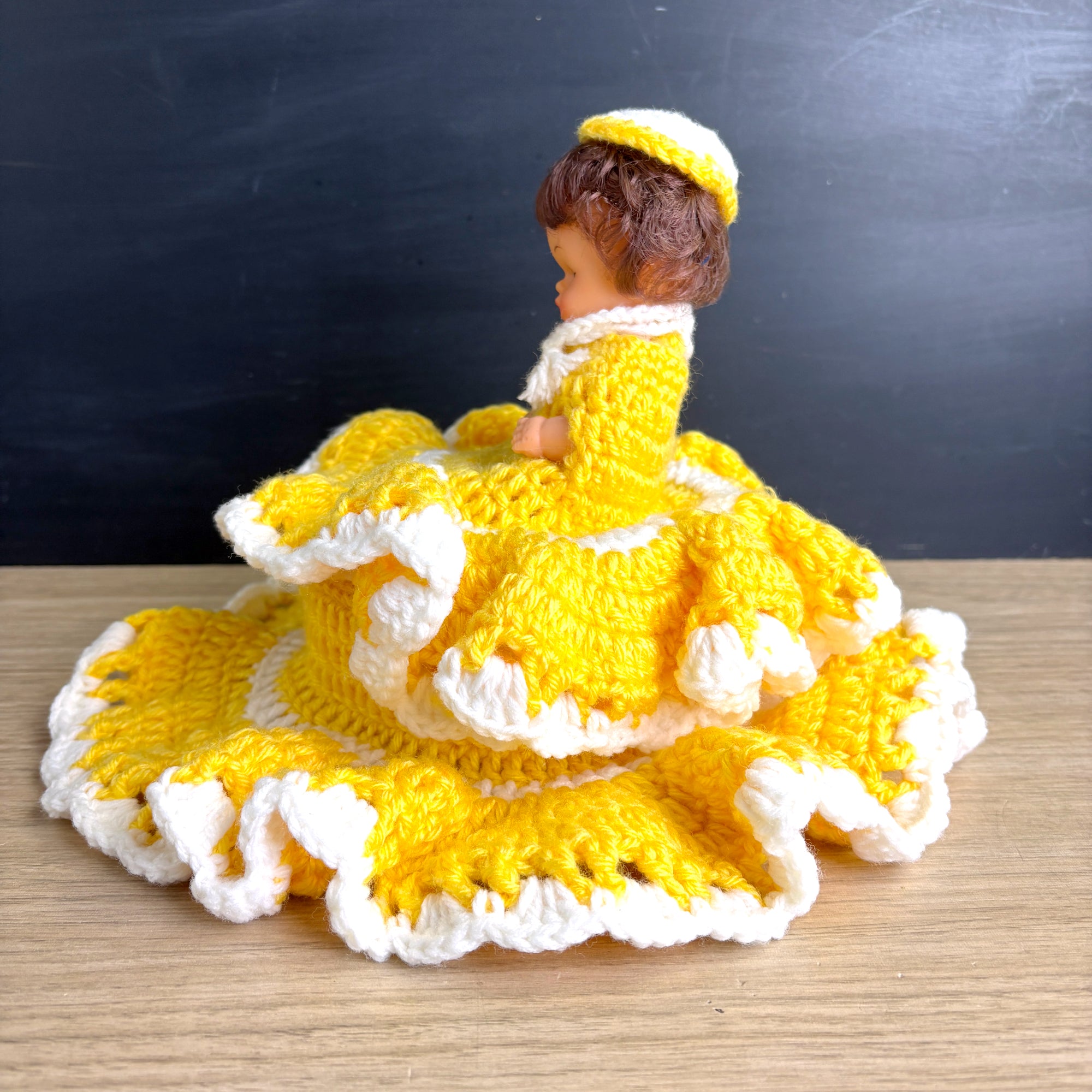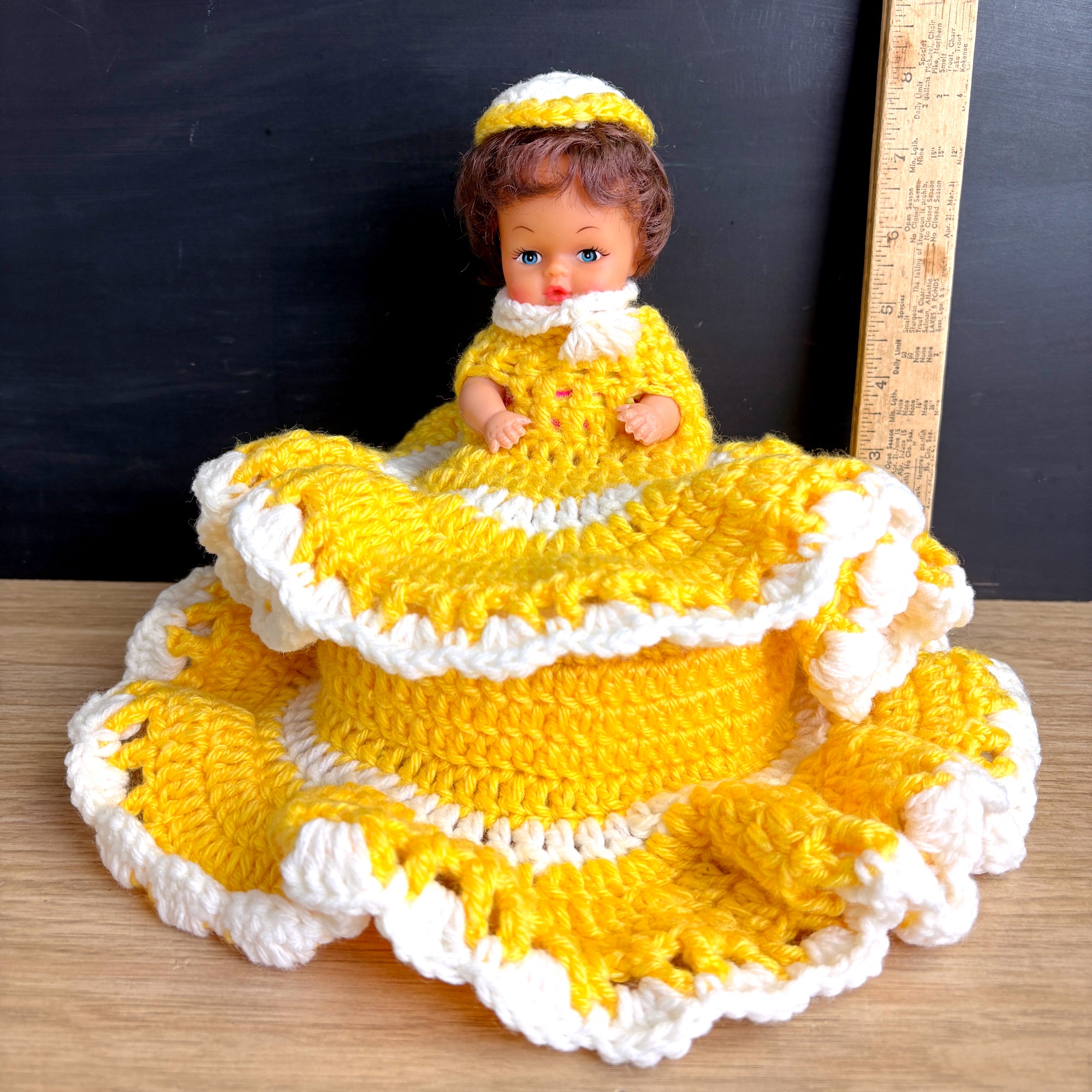 Vintage doll with secret storage - hand crocheted yellow and white dress