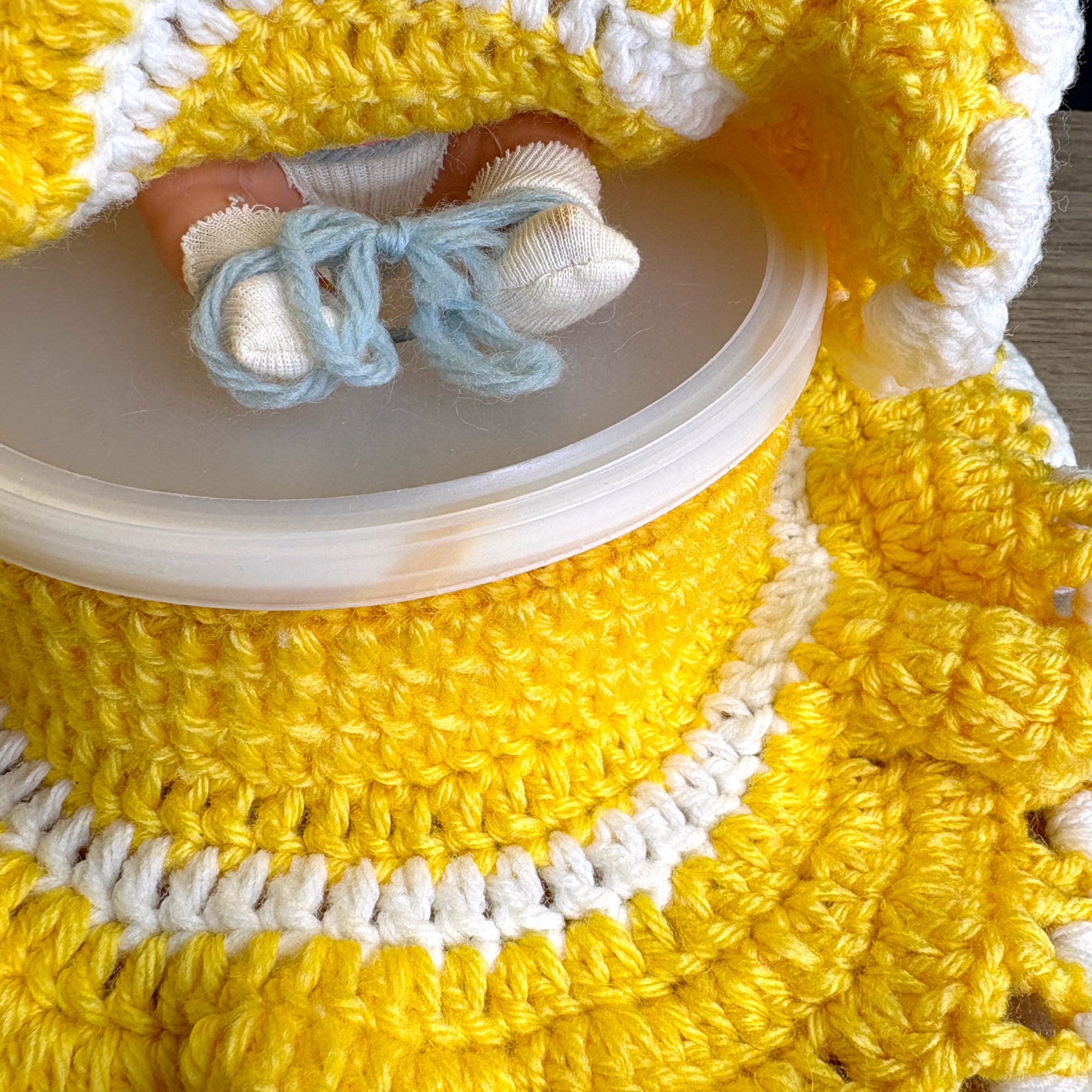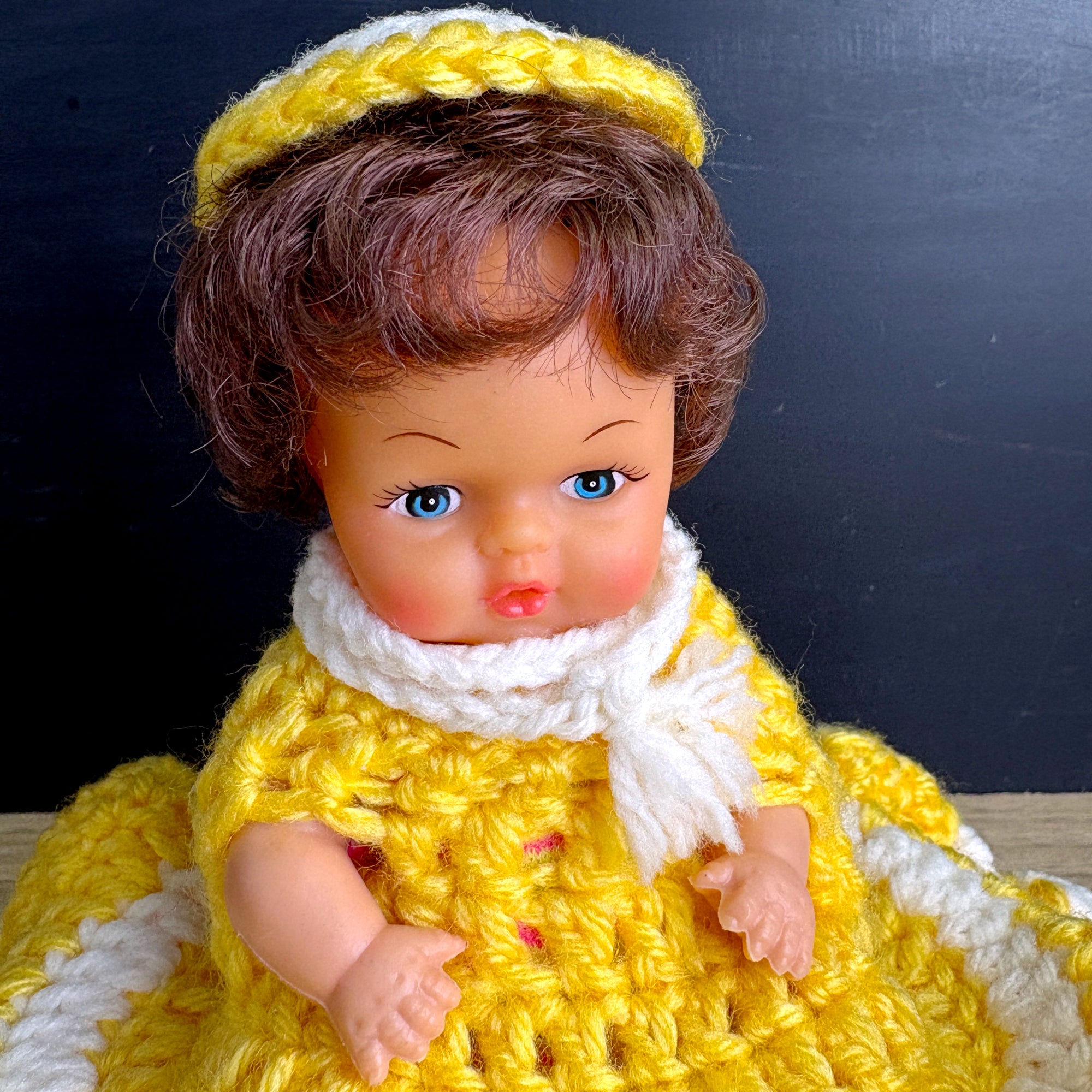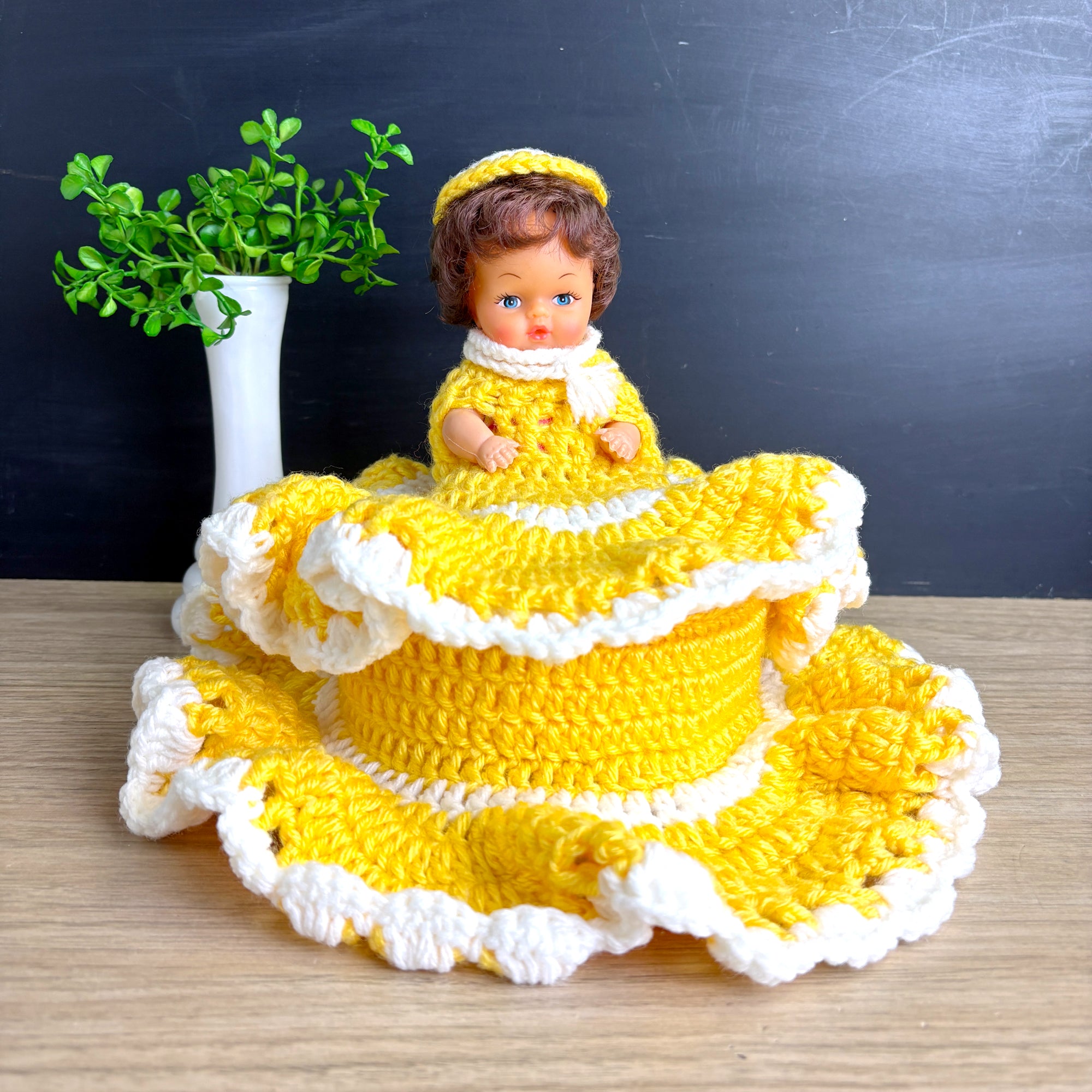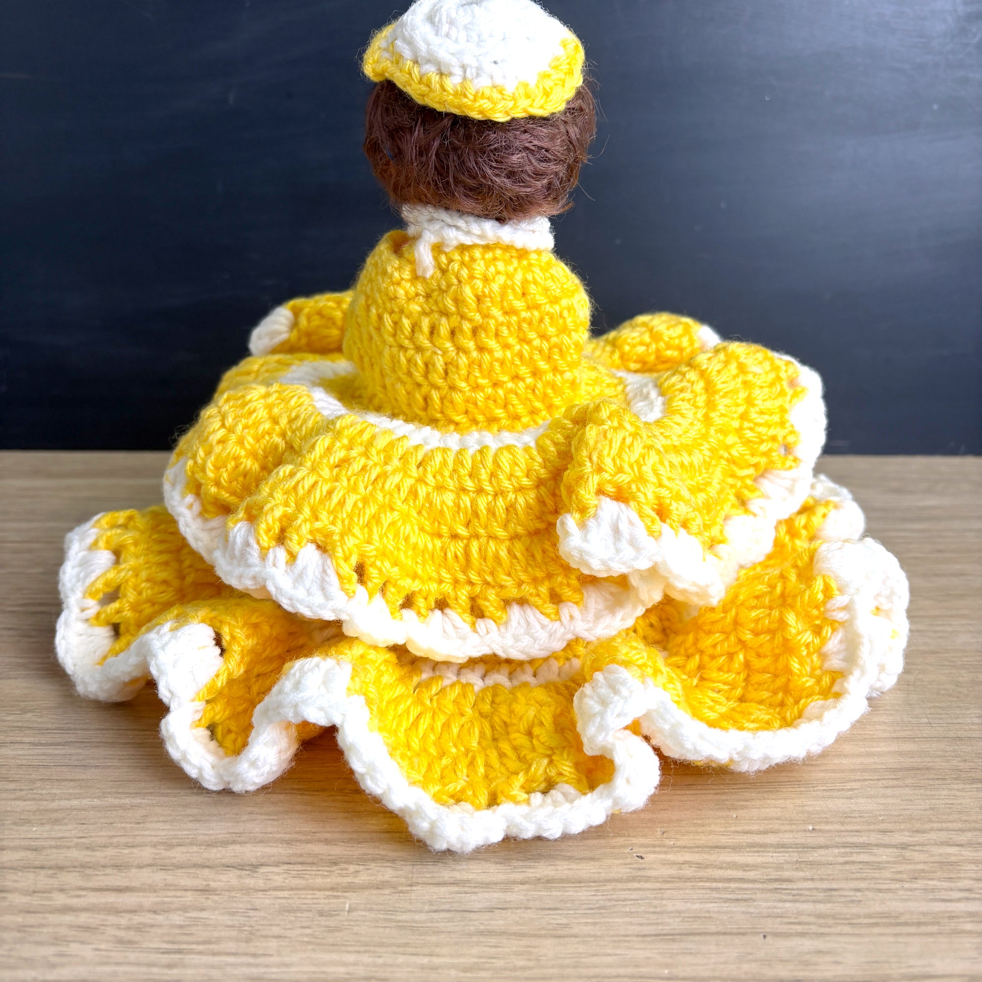 Vintage doll with secret storage - hand crocheted yellow and white dress