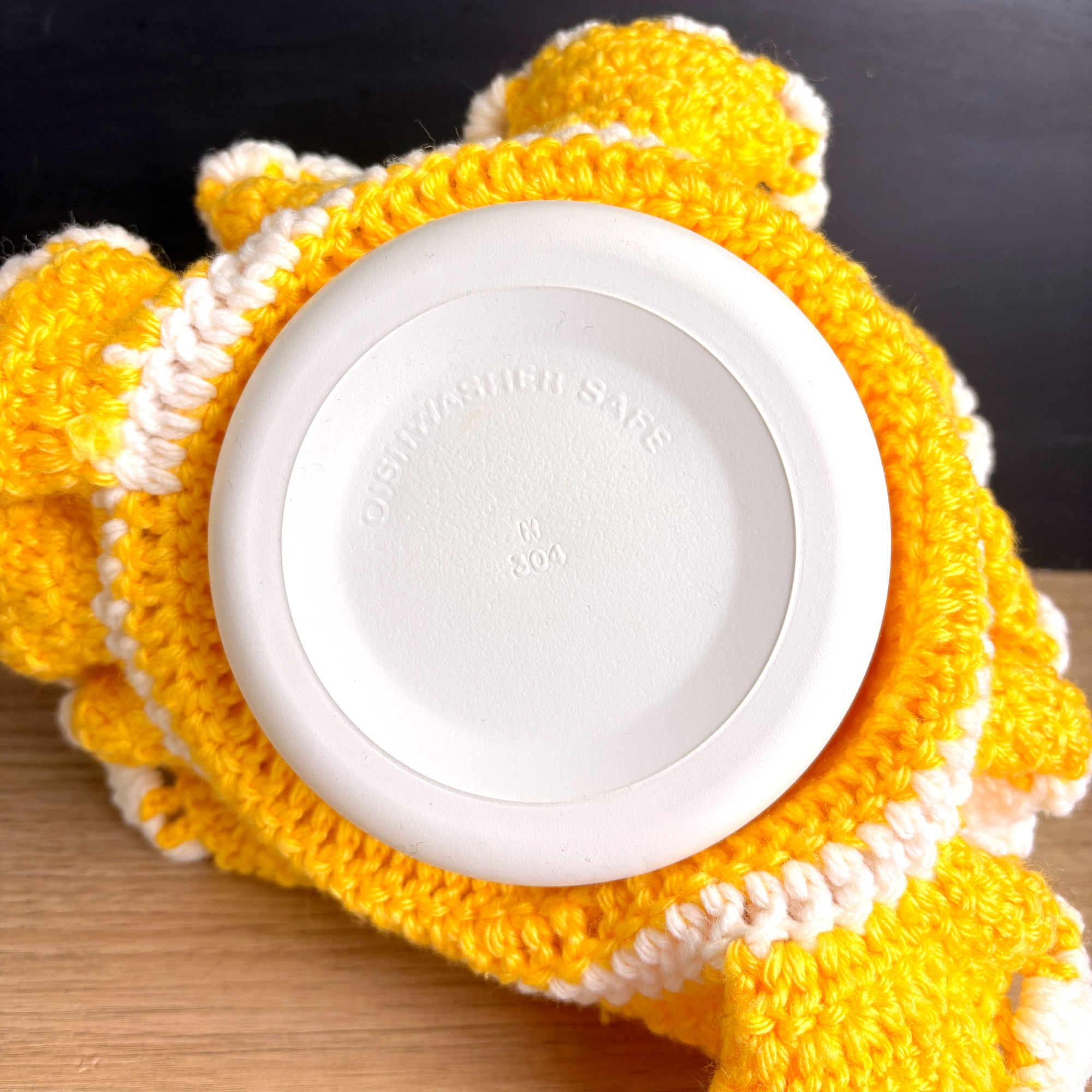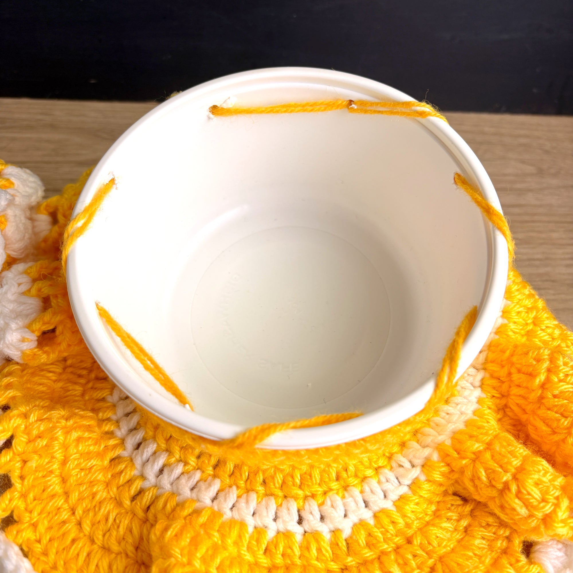 Vintage doll with secret storage under her skirt. She's wearing a hand crocheted yellow and white dress with a matching hat and white scarf. The doll is stitched to the top of what is most likely a Cool Whip container. A crocheted skirt is attached along the rim of the bottom of the container to give the dress tiers. The top of the container can be removed! She could be used as a hiding place or to store small trinkets! Lovely bright and cheery decoration.
