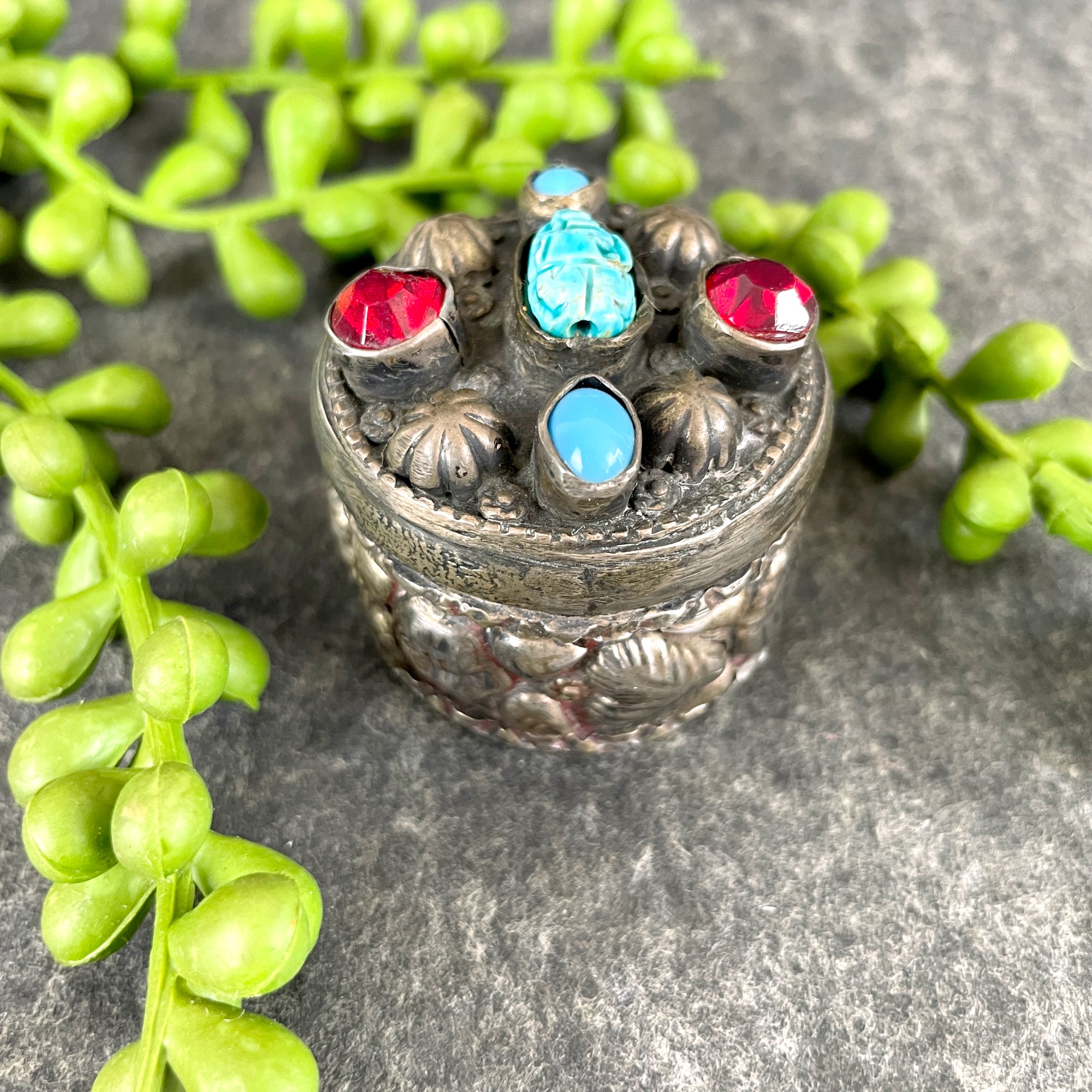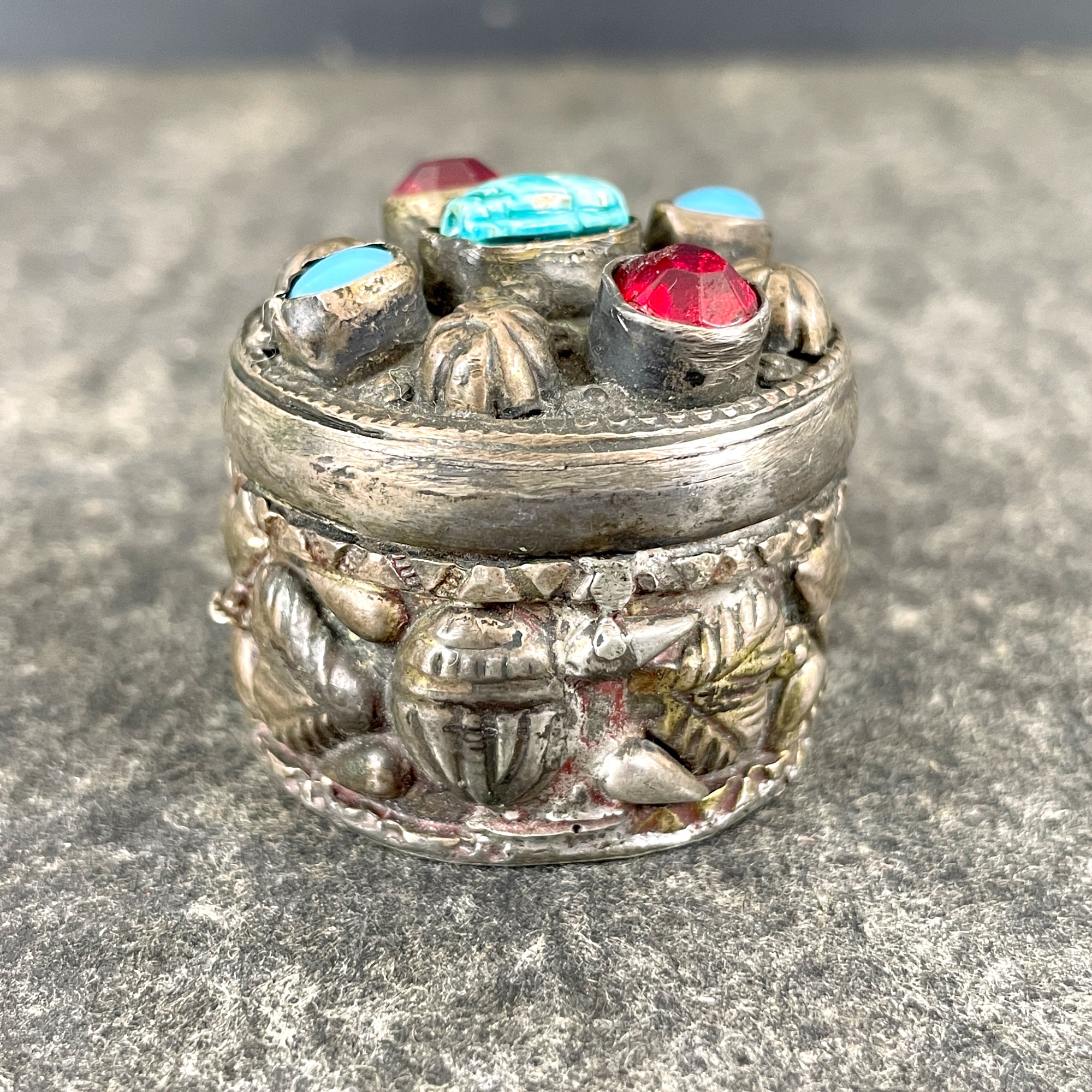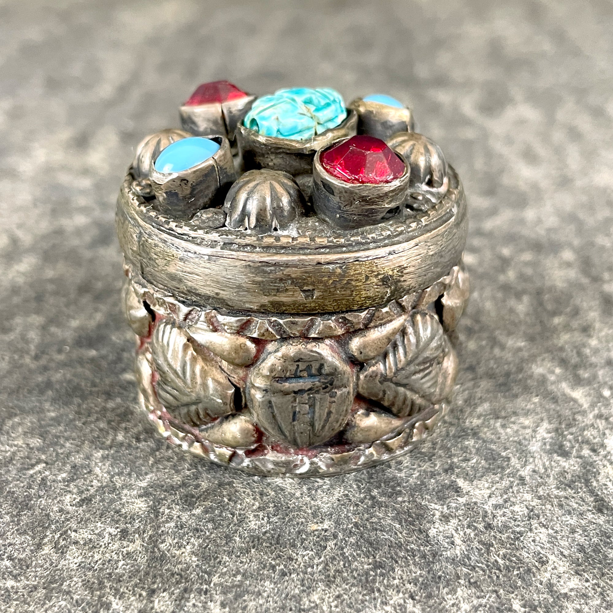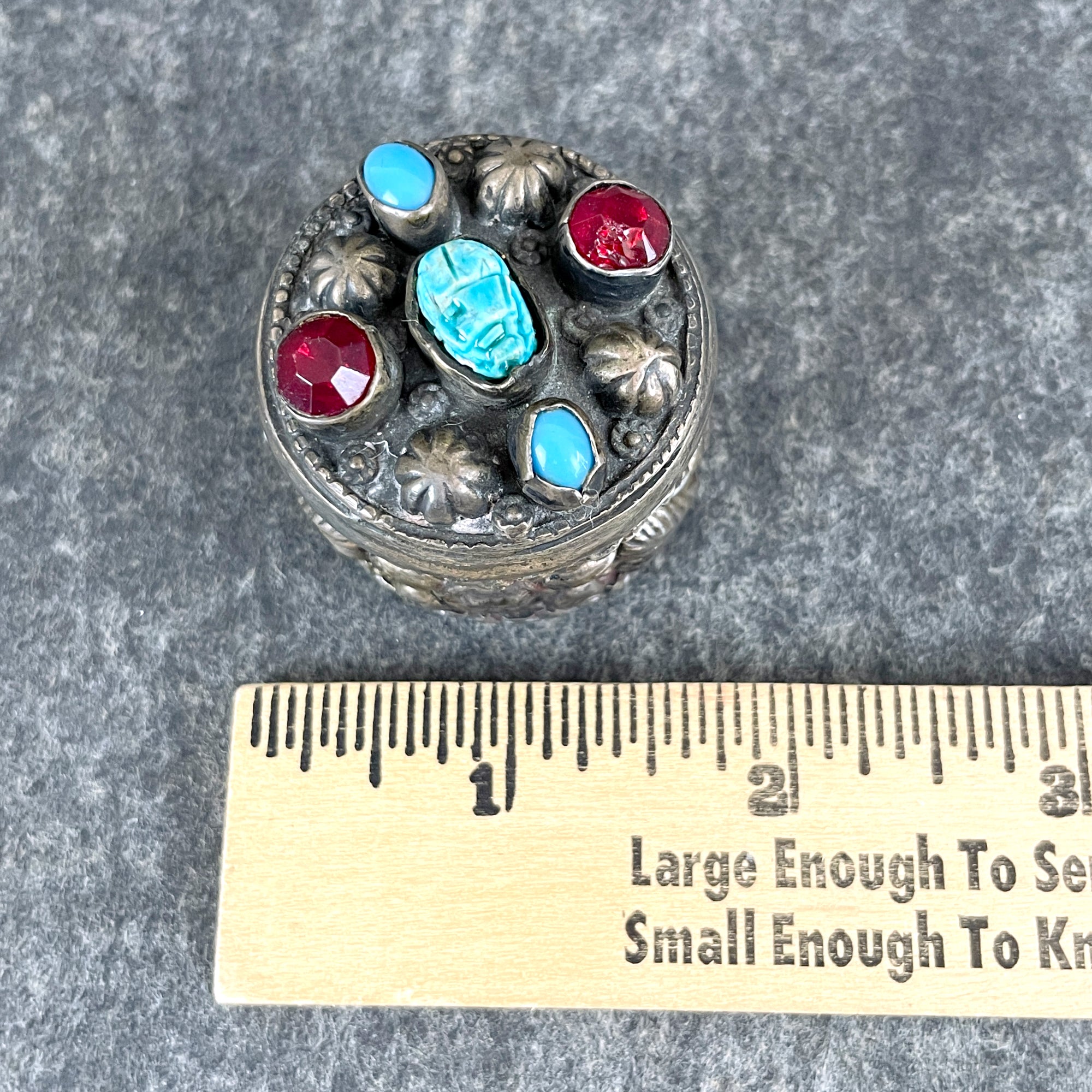 Vintage hand made silver Egyptian snuff or trinket box decorated with a turquoise blue scarab on lid center with ruby and turquoise glass beads surrounding. Body is decorated with images of leaves, scarabs and pharaohs. Hallmark on bottom, unable to identify because we're good but sometimes we're not good enough. Souvenir quality.
