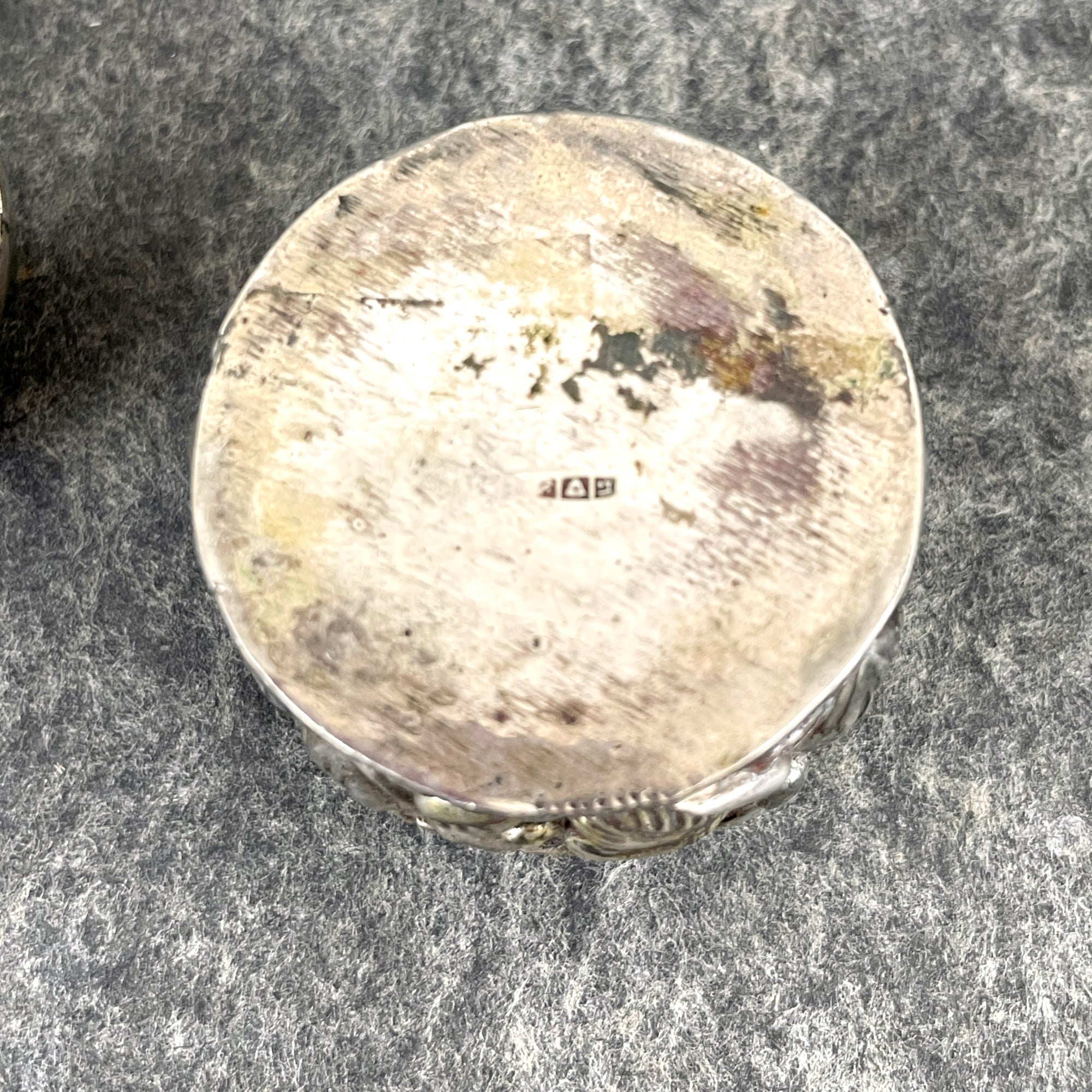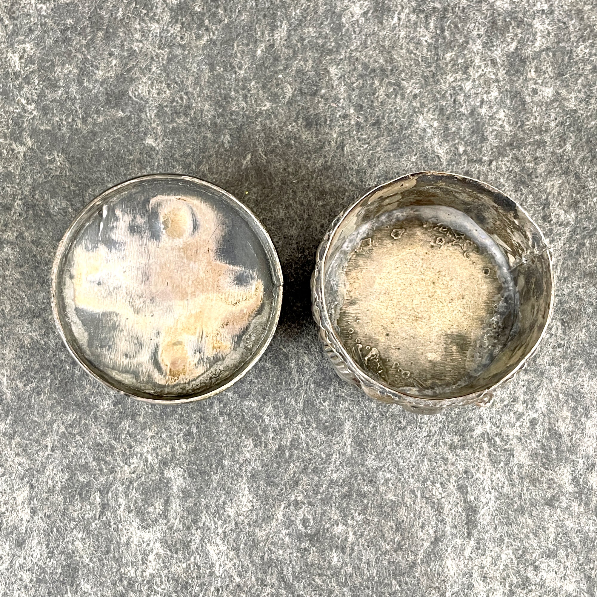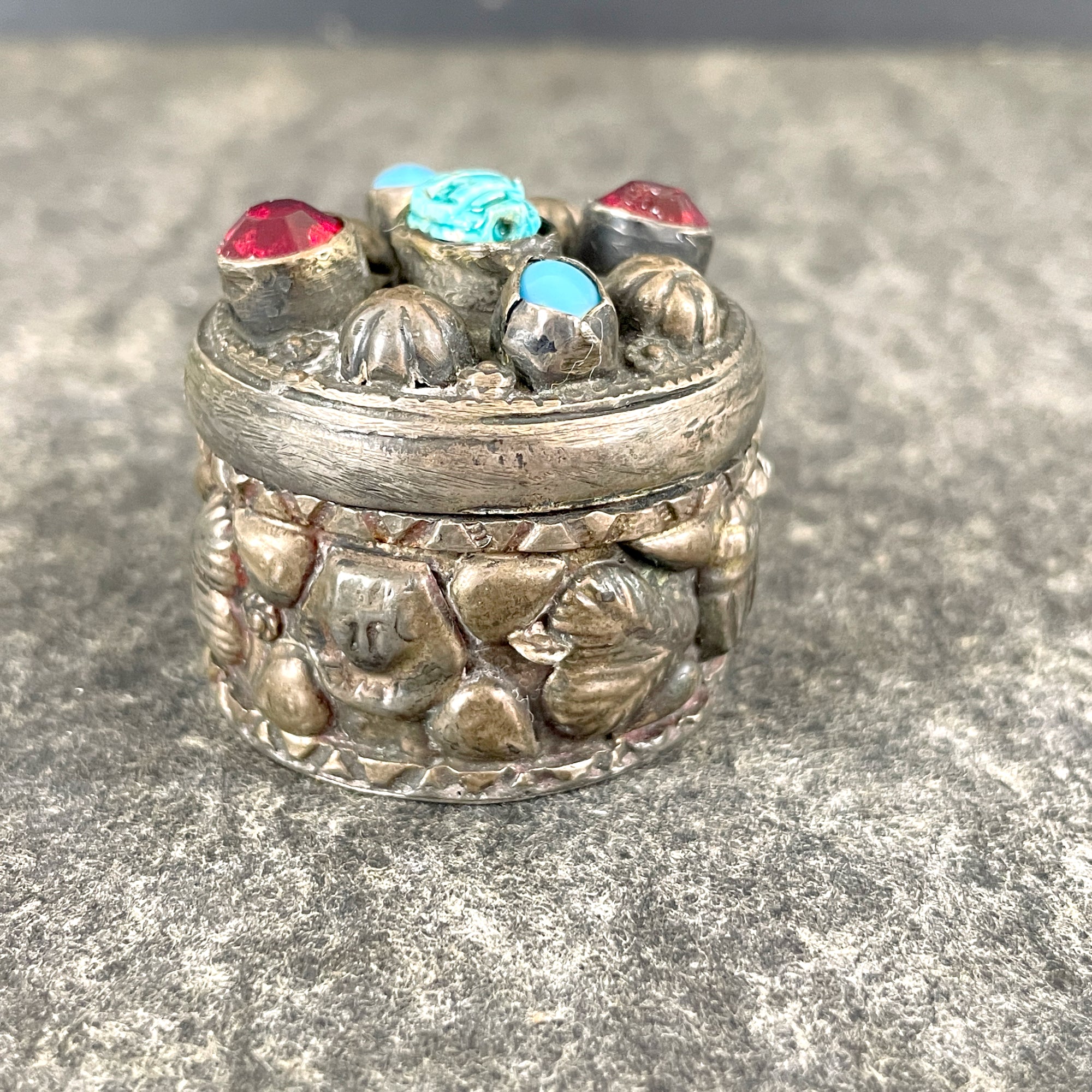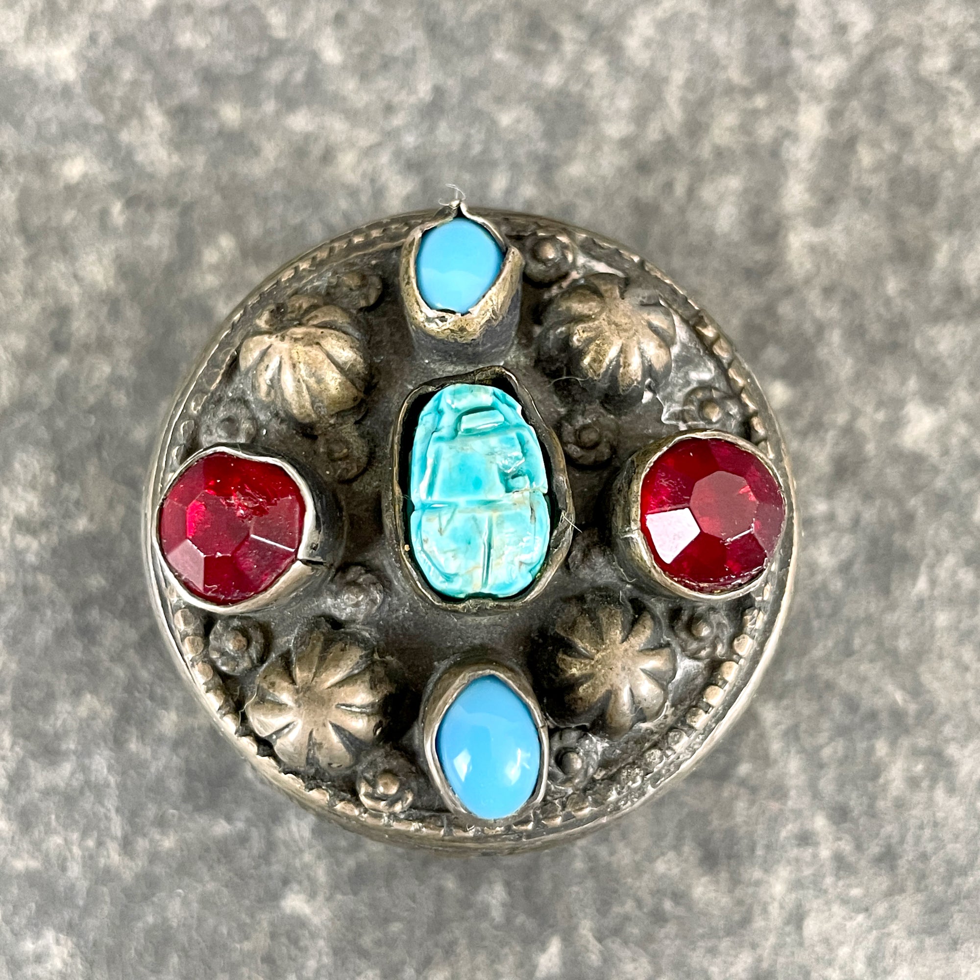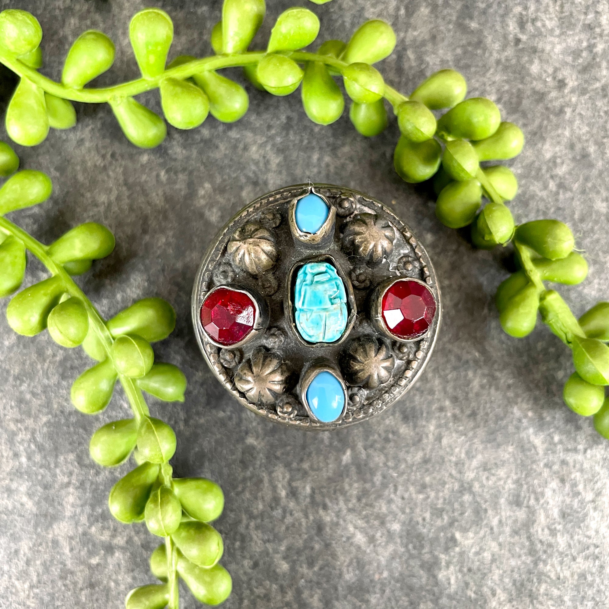 Vintage hand made silver Egyptian snuff or trinket box decorated with a turquoise blue scarab on lid center with ruby and turquoise glass beads surrounding. Body is decorated with images of leaves, scarabs and pharaohs. Hallmark on bottom, unable to identify because we're good but sometimes we're not good enough. Souvenir quality.