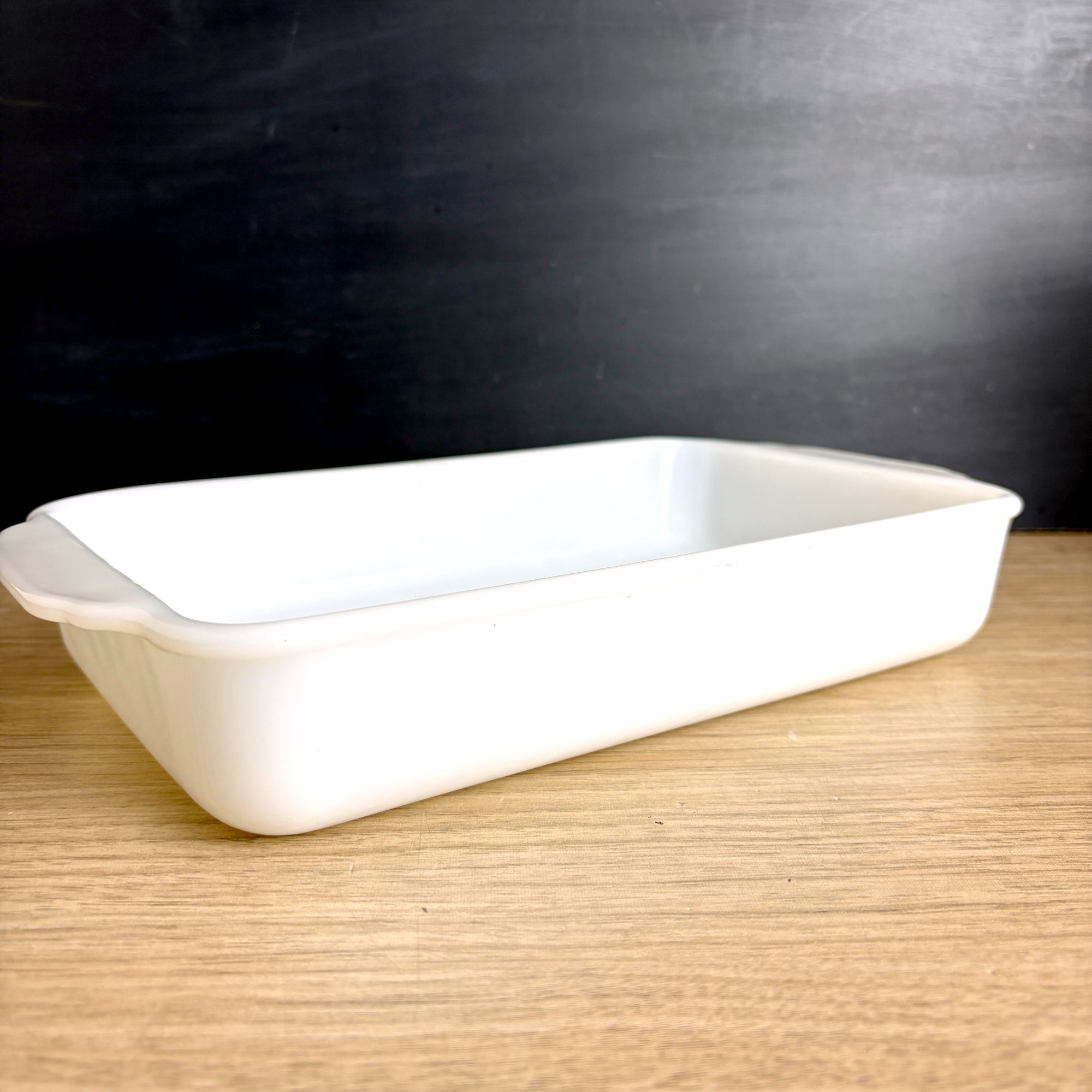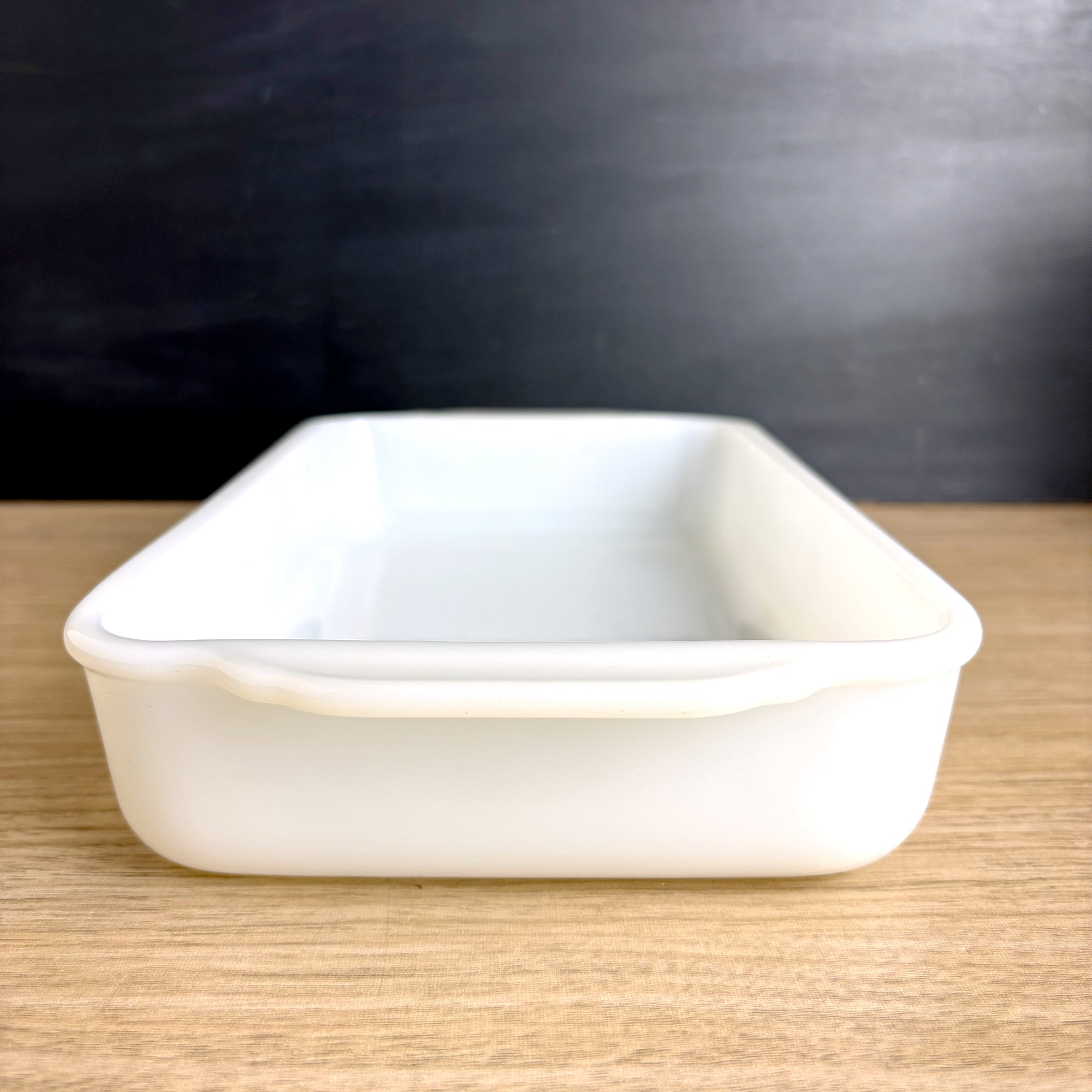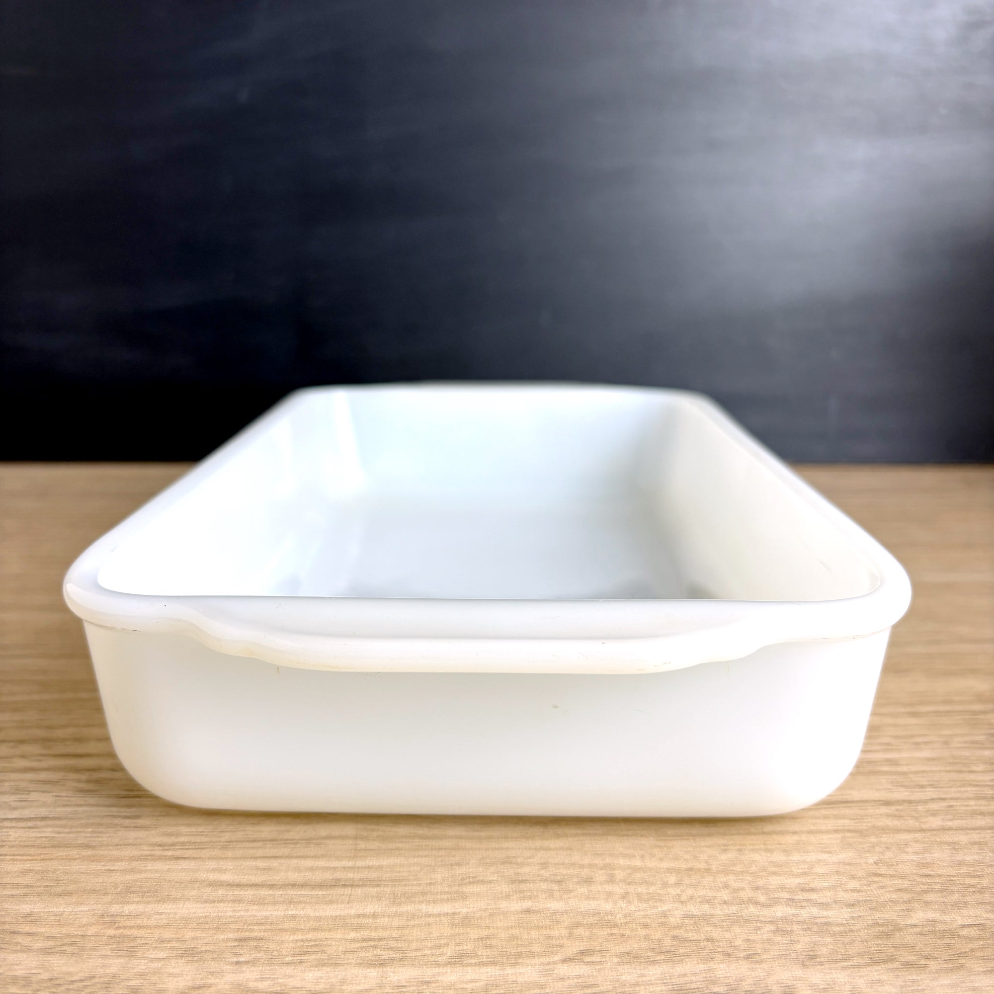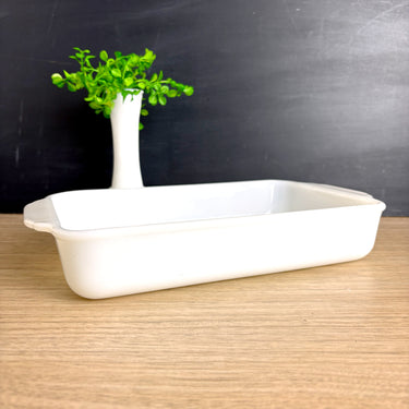 Vintage Fire King milk glass baking dish still has seen little, if any use. Rectangular casserole dish has a 1.5-quart capacity. Marked with the Fire King logo on the bottom. Perfect for baking, serving, or display. A must-have for fans of mid-century modern kitchenware. Made in the USA.