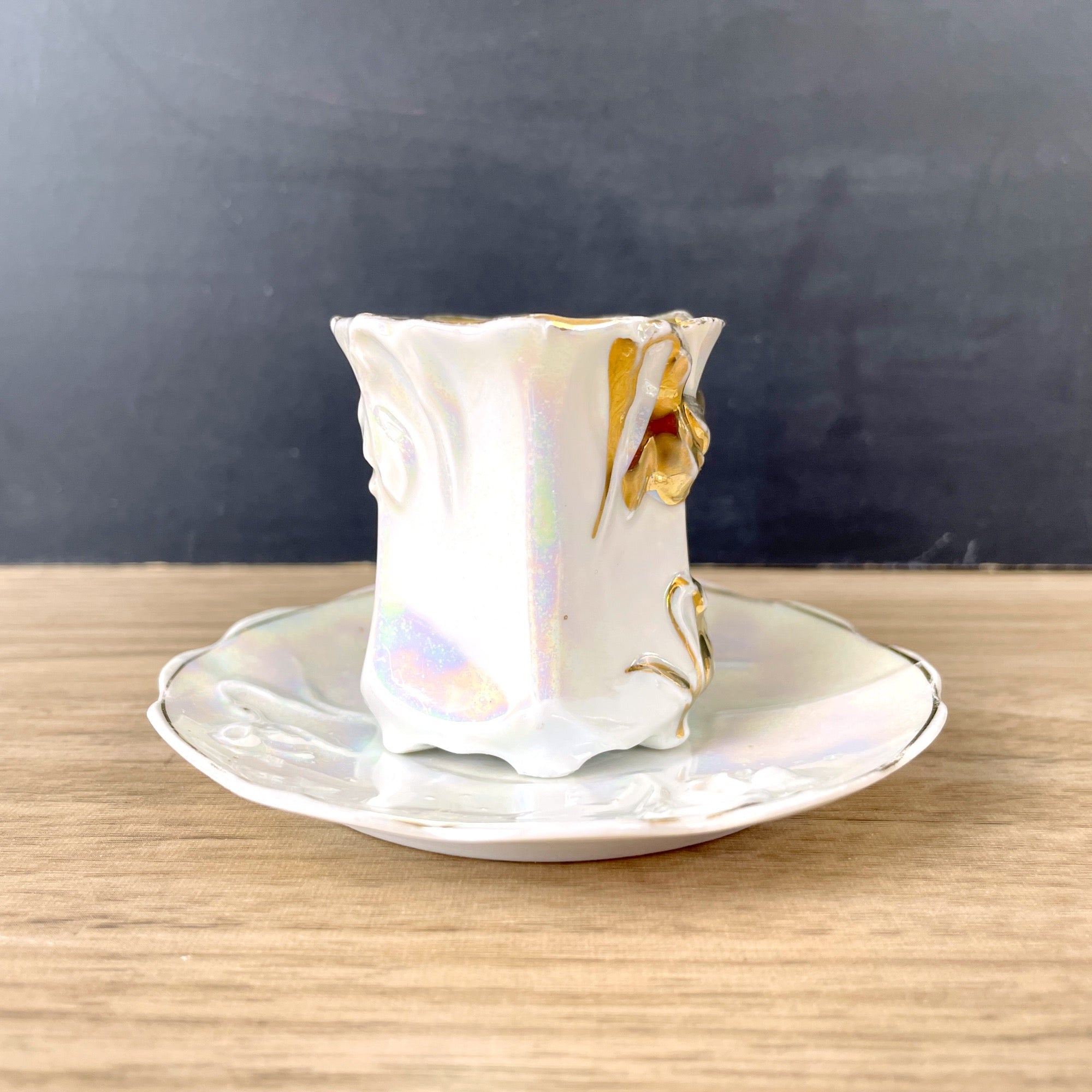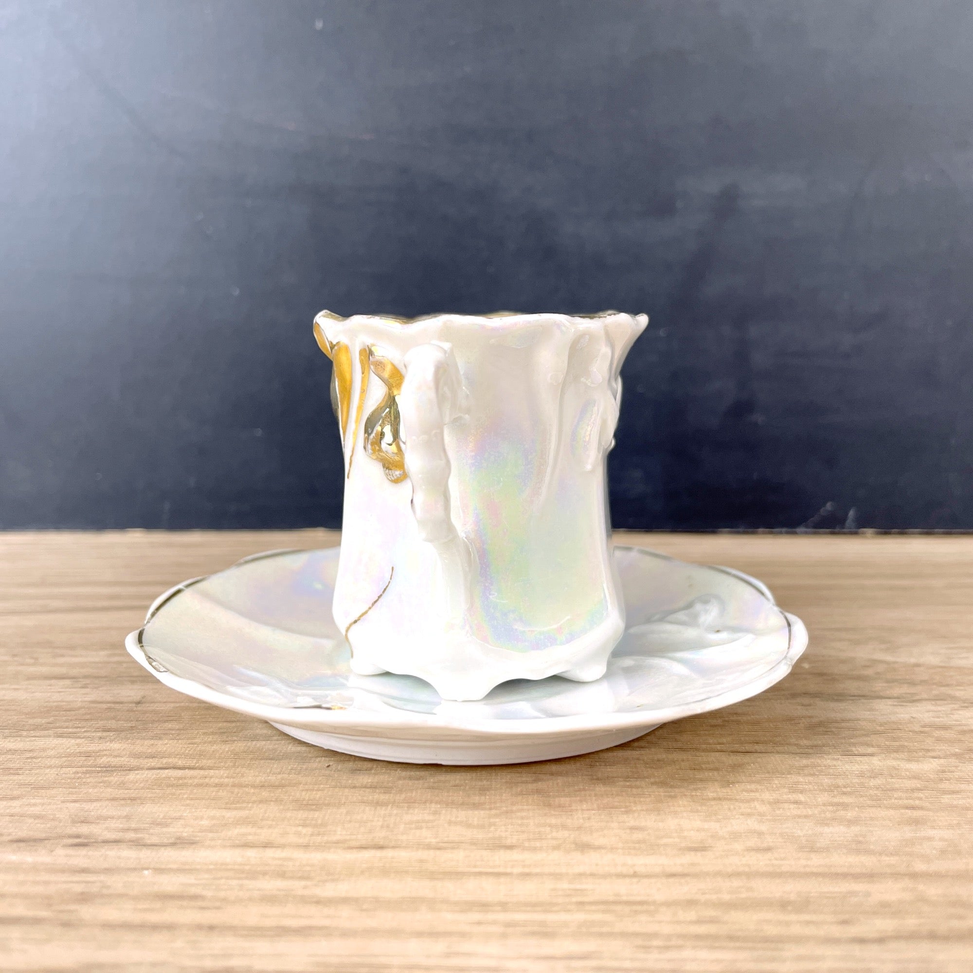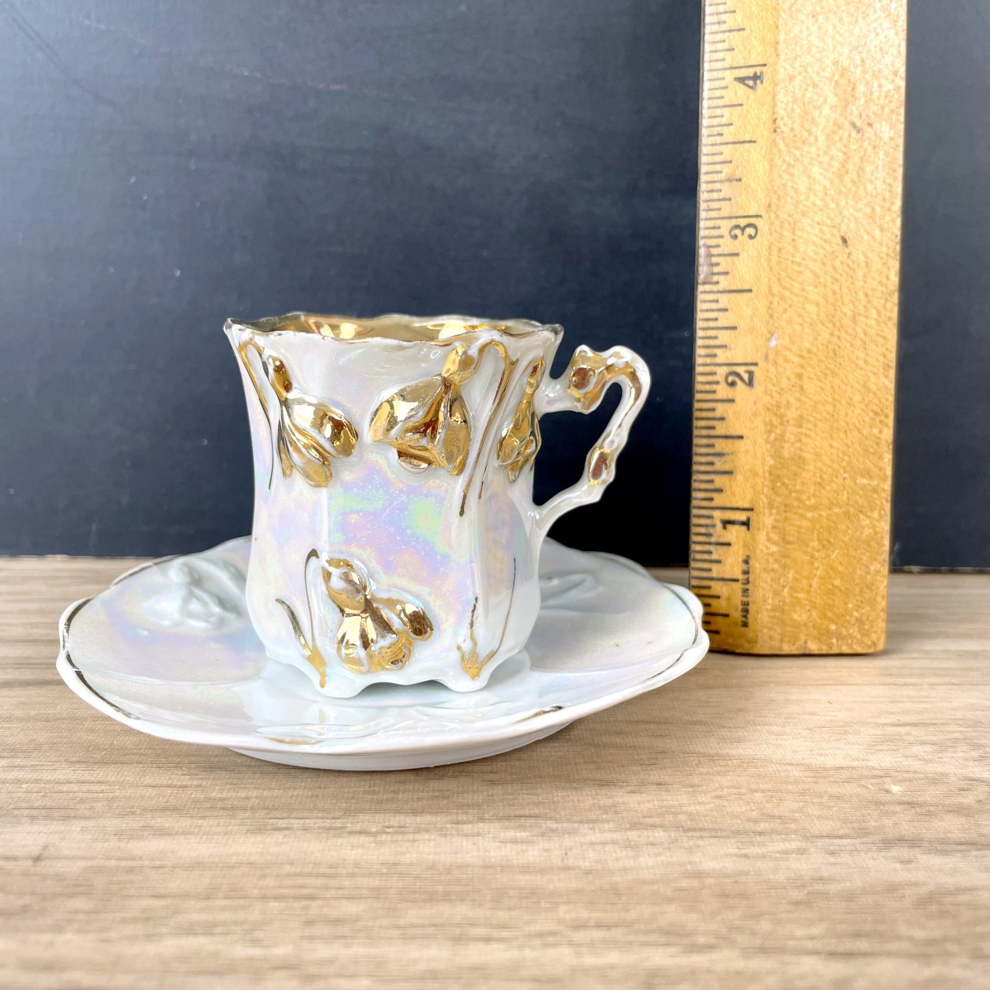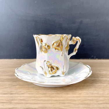 Lovely little vintage demitasse and saucer, iridescent with hand painted gold interior and bell flowers. No makers marks, alas. A beautiful and charming addition to any tea cup collection or a splendid vessel for your nightly espresso.