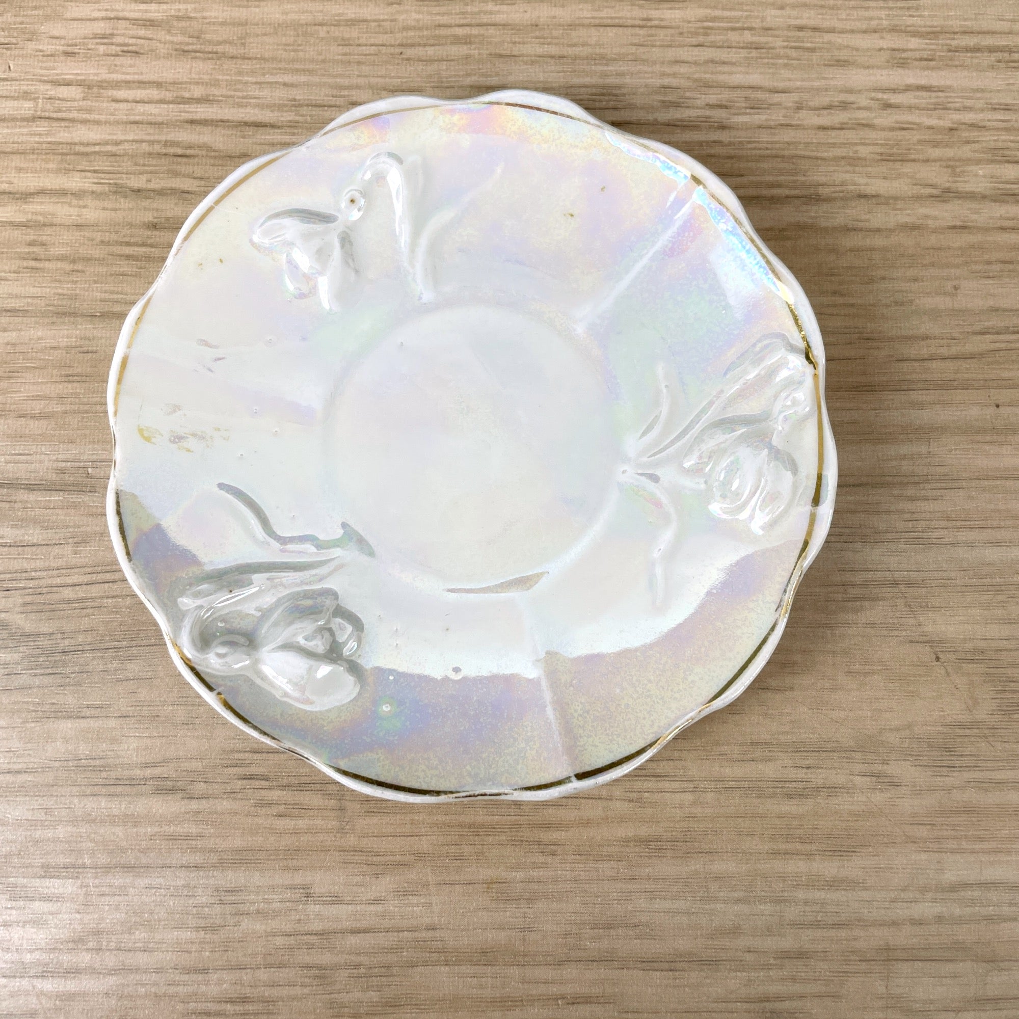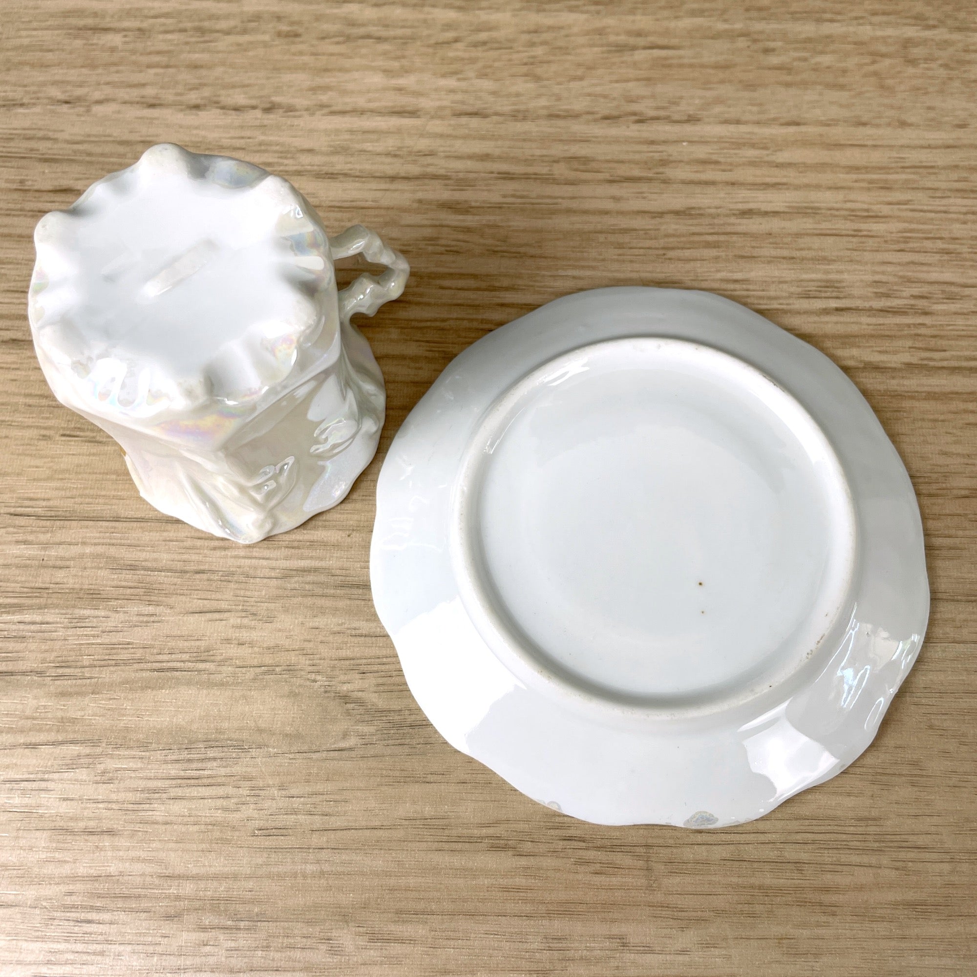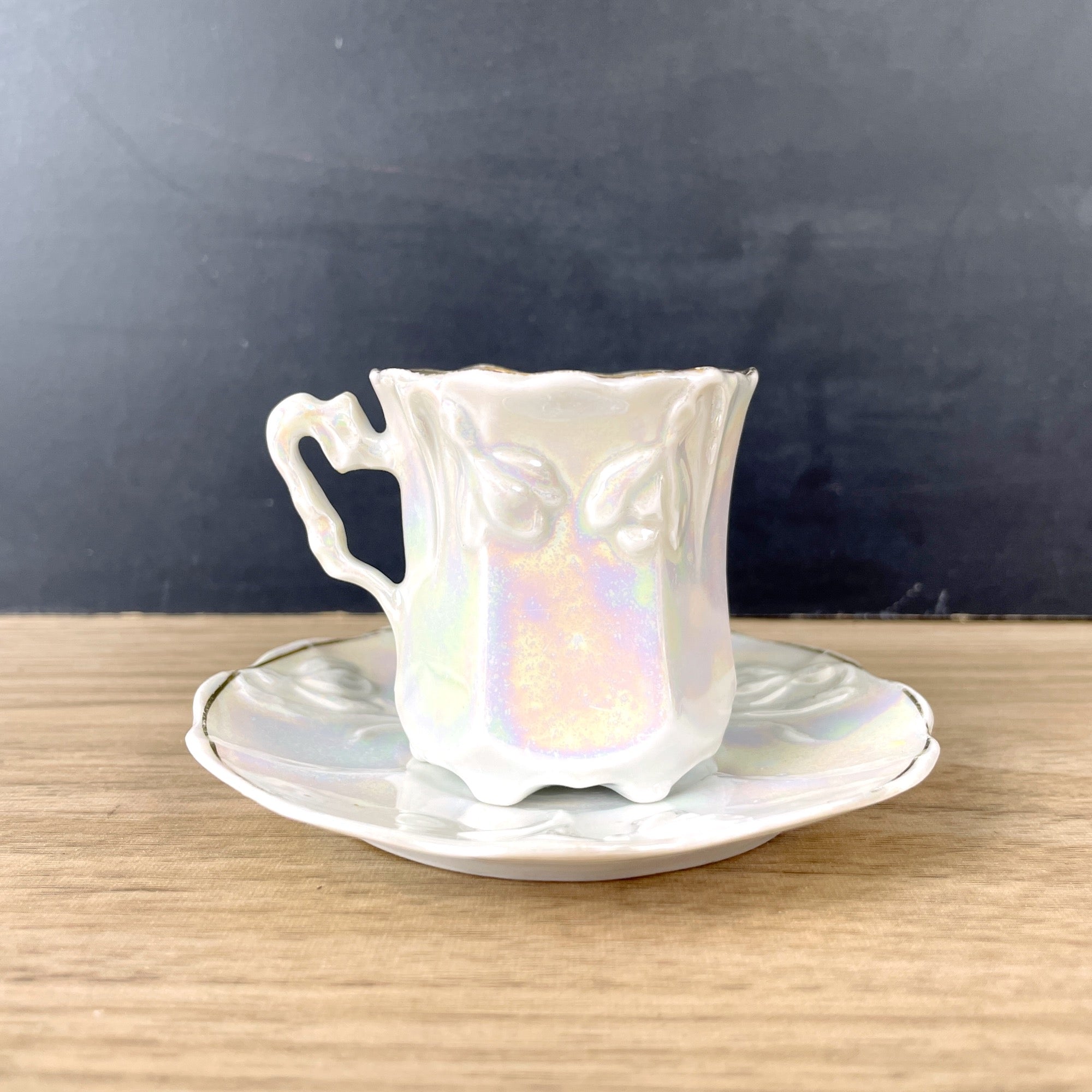 Lovely little vintage demitasse and saucer, iridescent with hand painted gold interior and bell flowers. No makers marks, alas. A beautiful and charming addition to any tea cup collection or a splendid vessel for your nightly espresso.