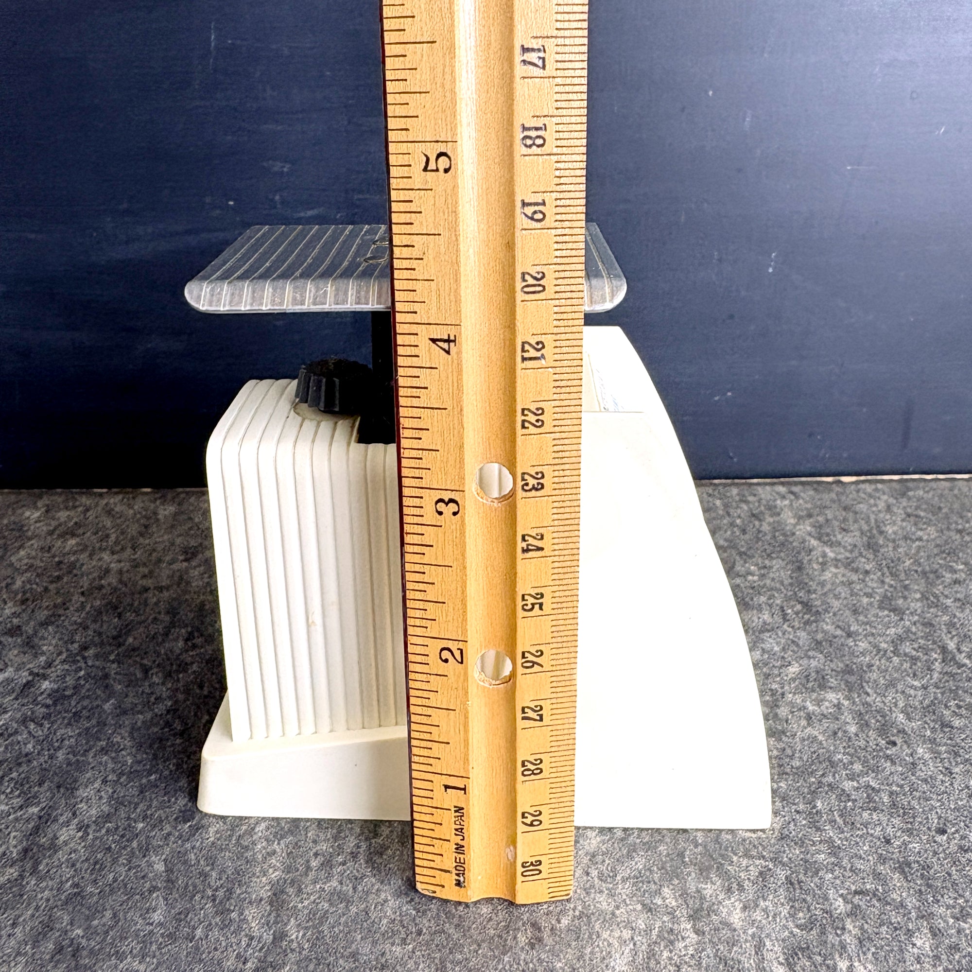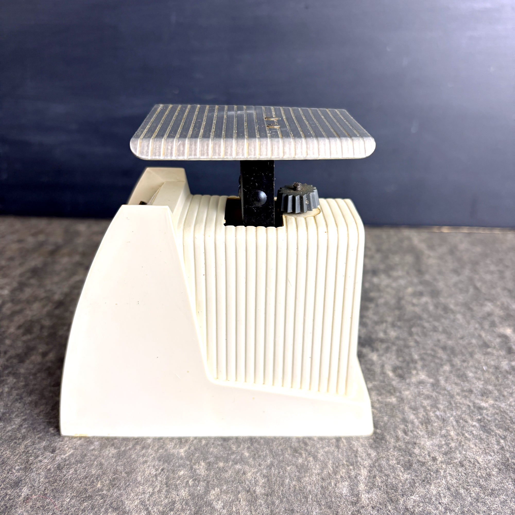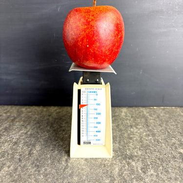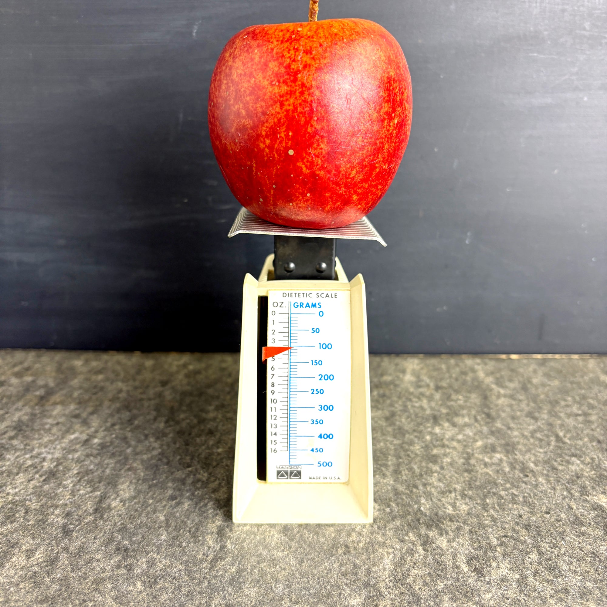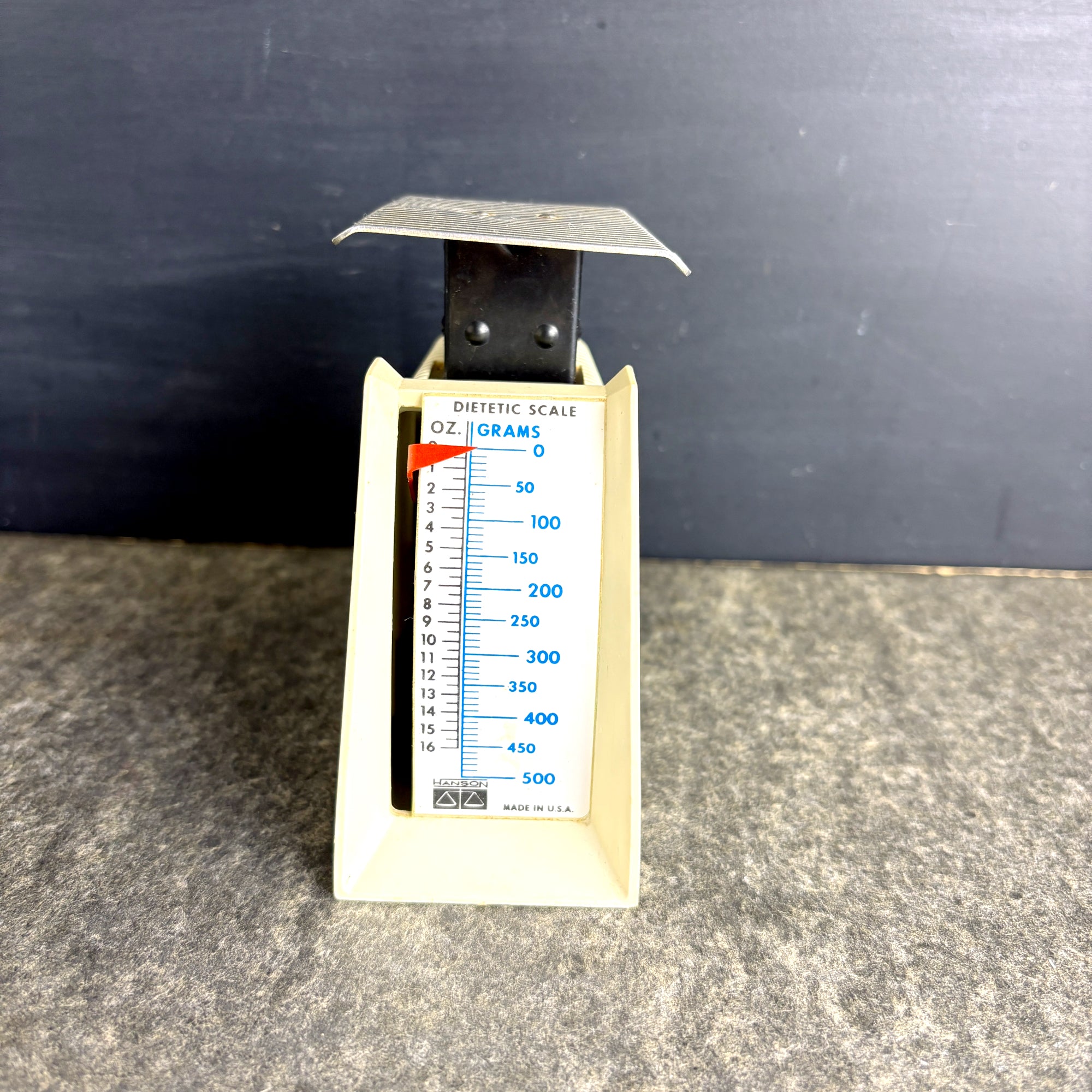 What mid-century weight-watching household didn't have one of these Hanson Dietetic Scales?  Weigh your food items up to 16 ounces or 500 grams. Adjustment knob to zero scale. Analog in the best way.