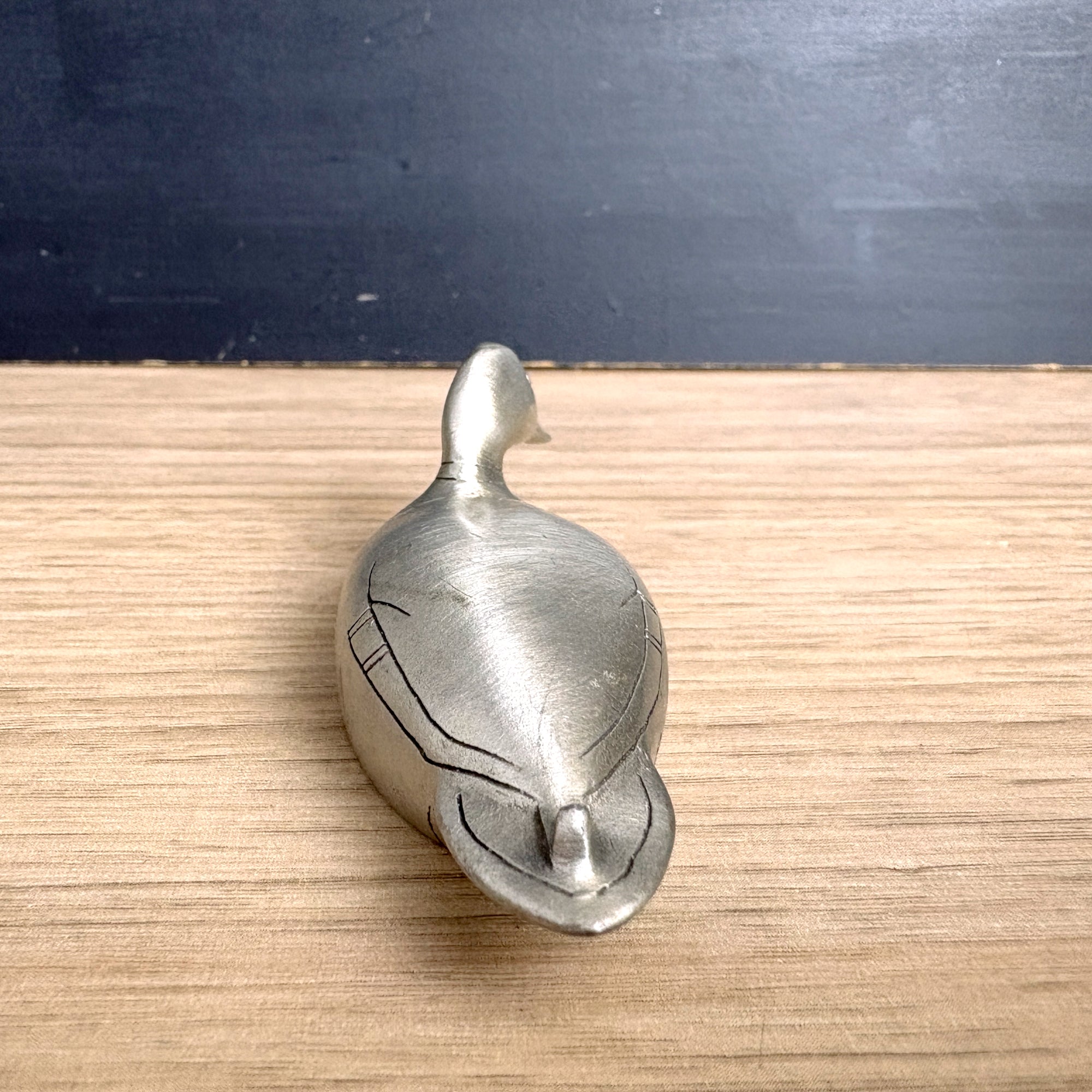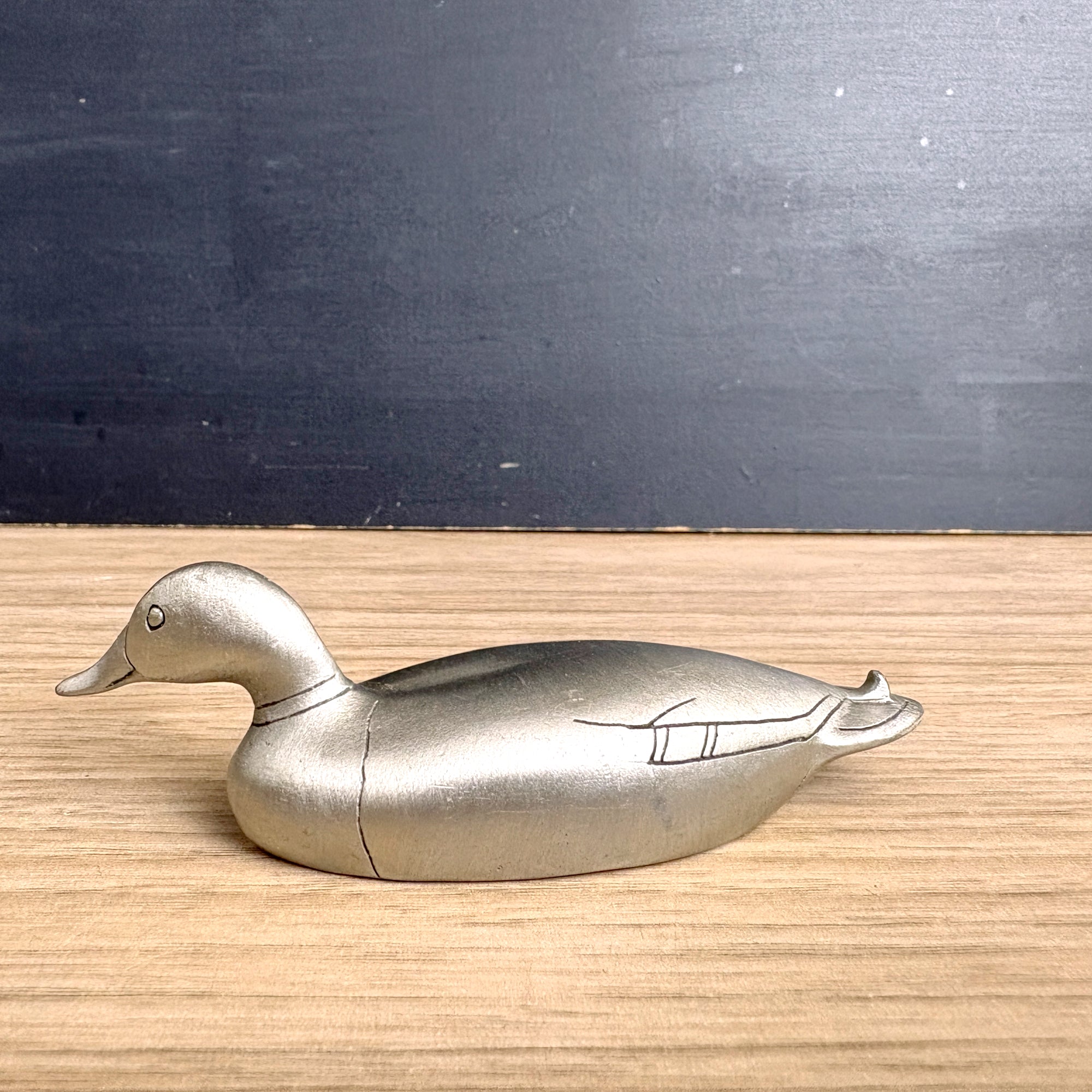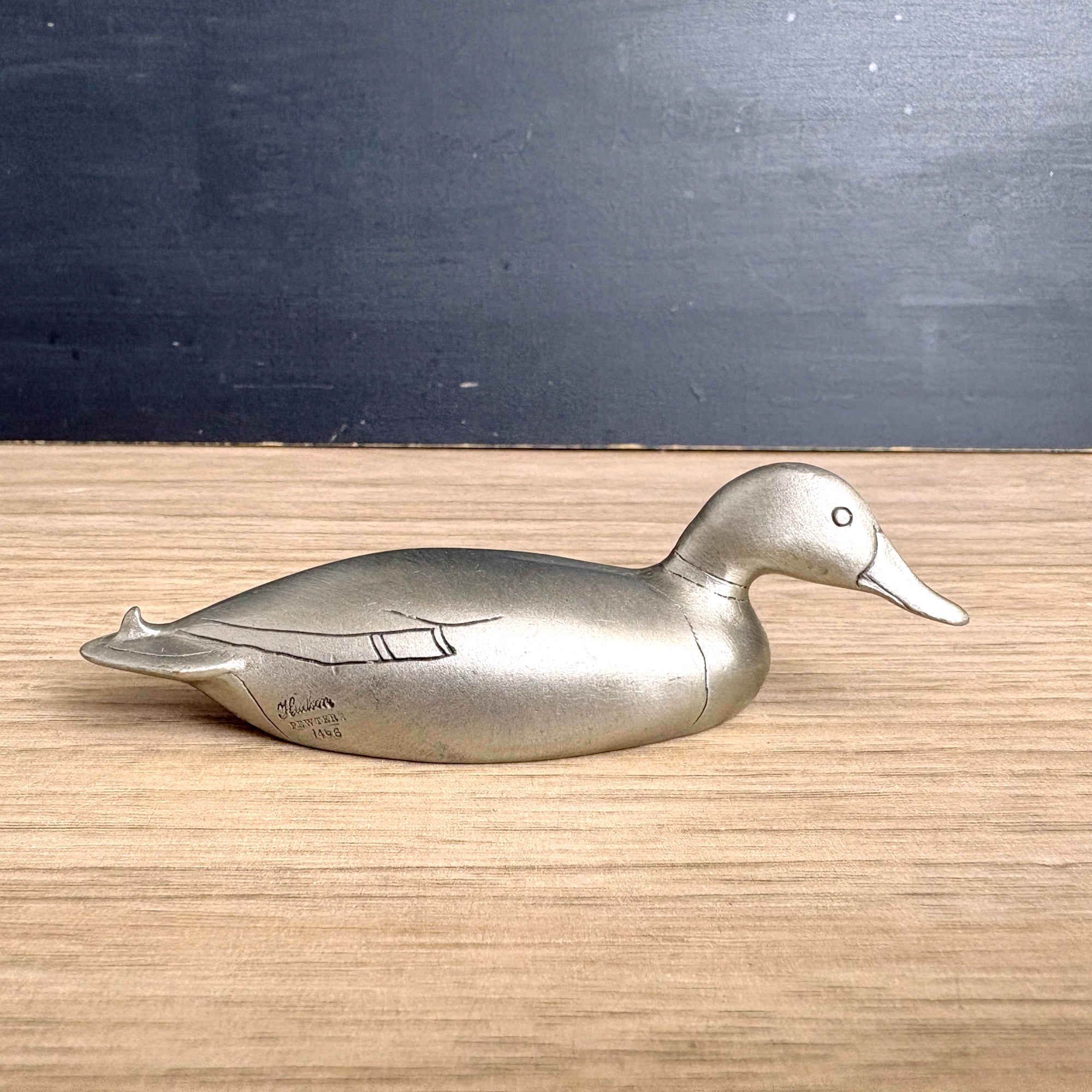 Vintage petite pewter duck figurine is very sleek, with only a few lines of detail. Marked on his side "U.S.A. Hudson Pewter 1466." Inside he is marked :