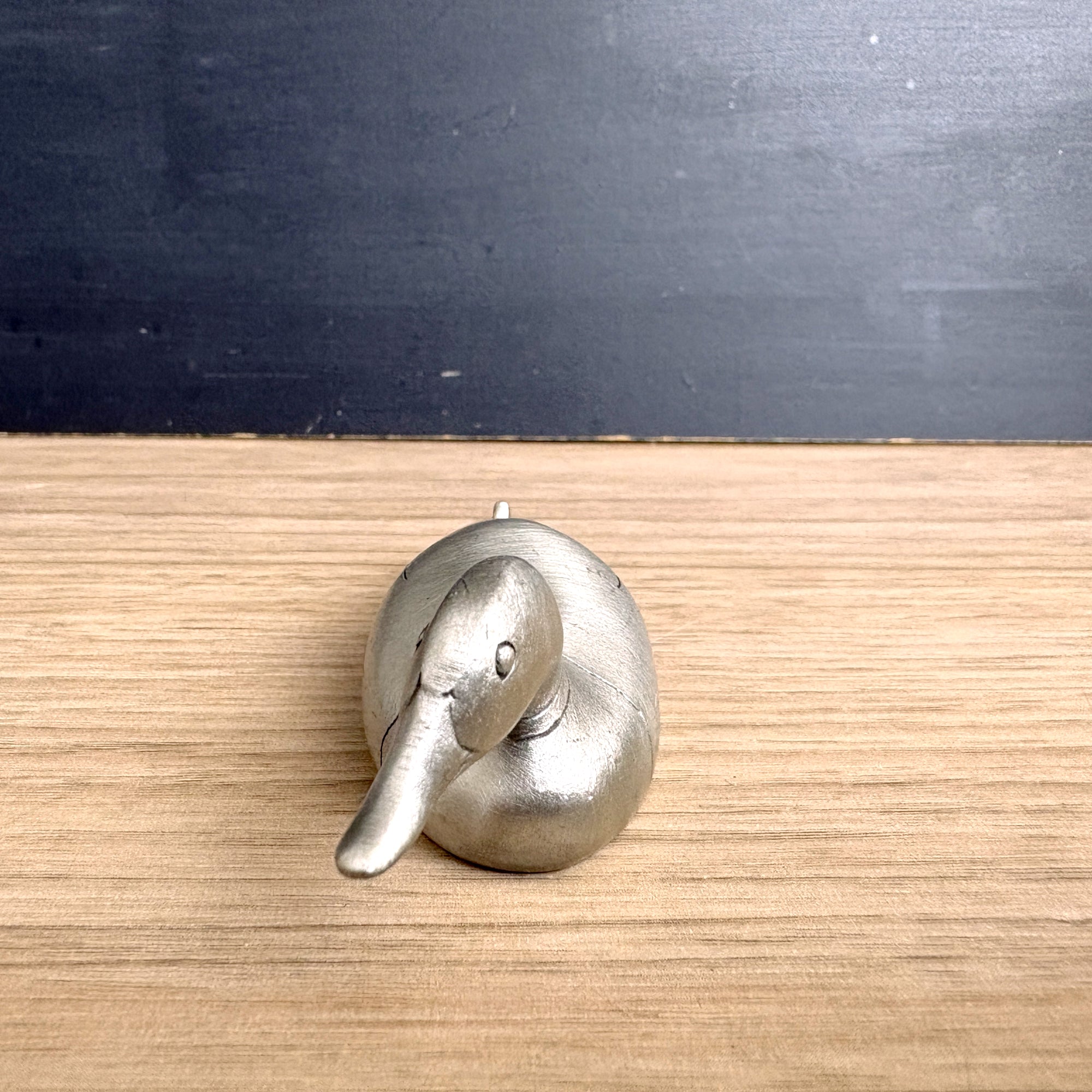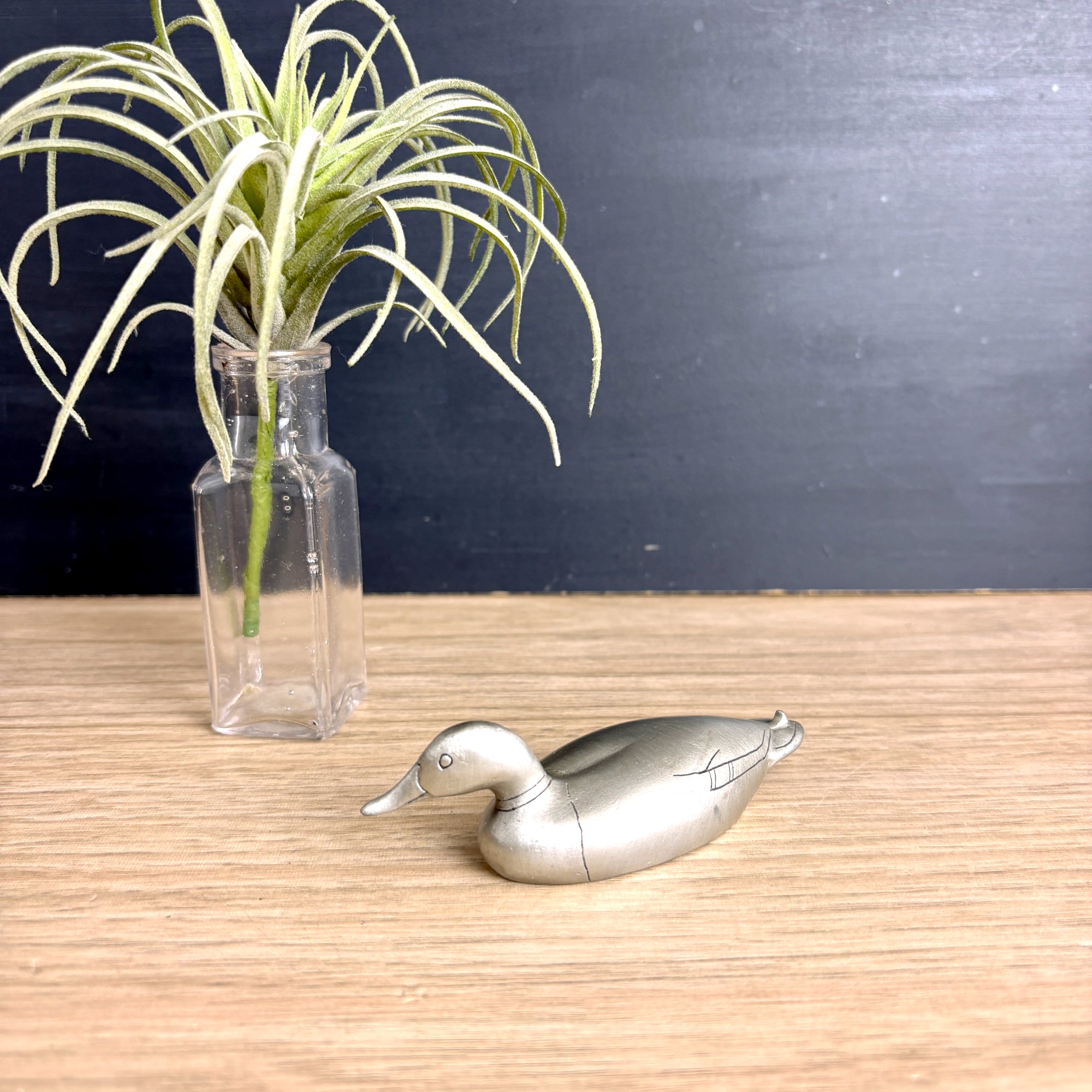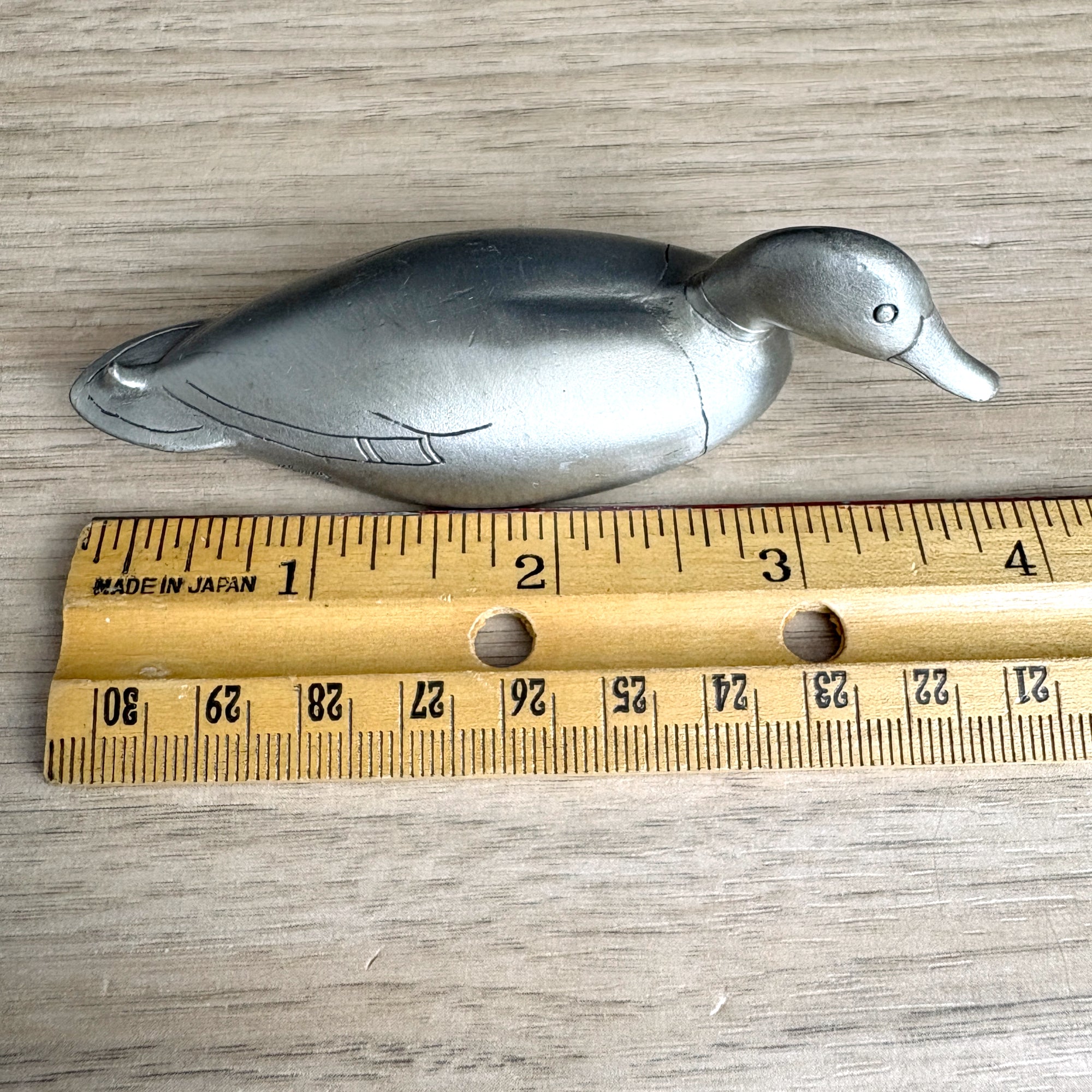 Vintage petite pewter duck figurine is very sleek, with only a few lines of detail. Marked on his side "U.S.A. Hudson Pewter 1466." Inside he is marked :