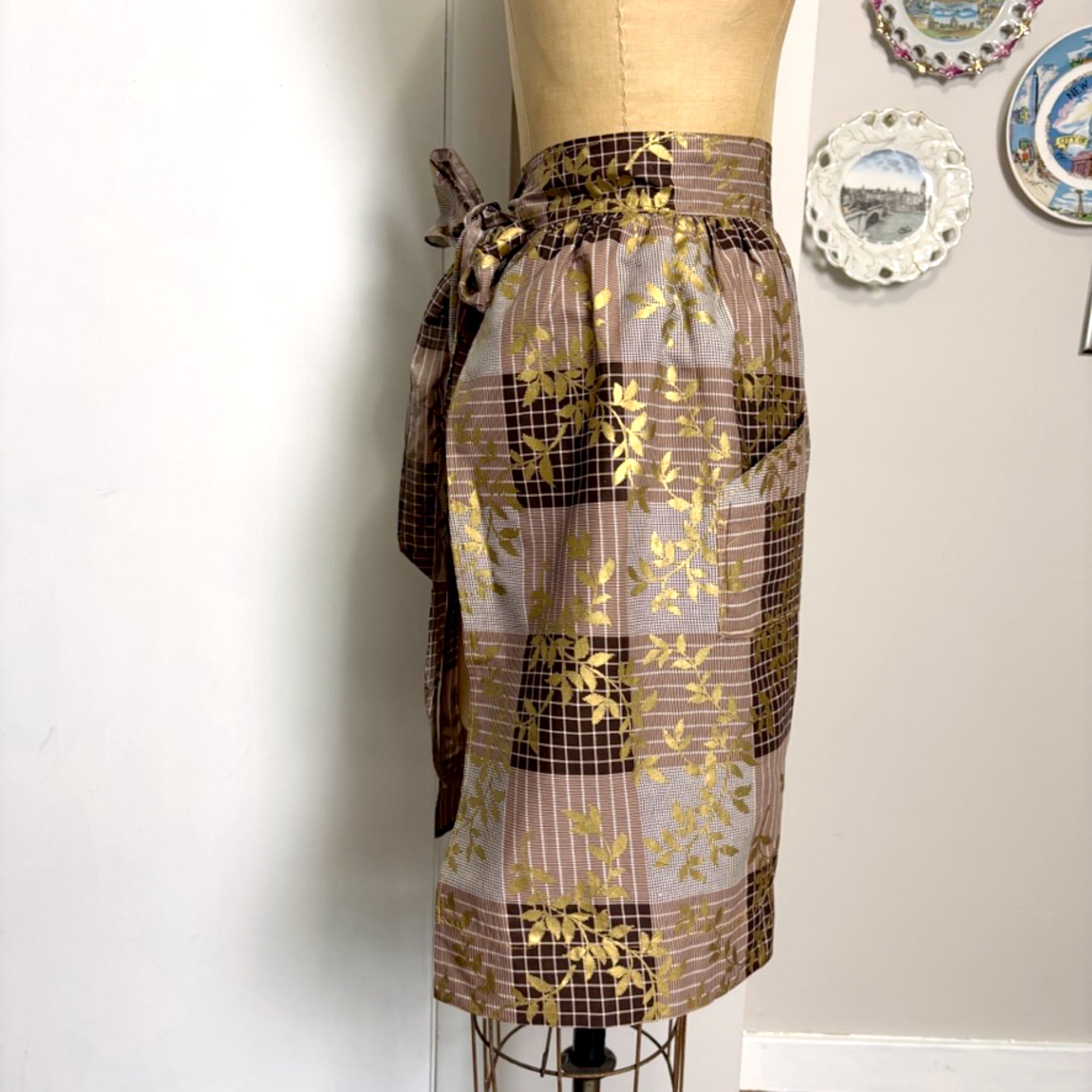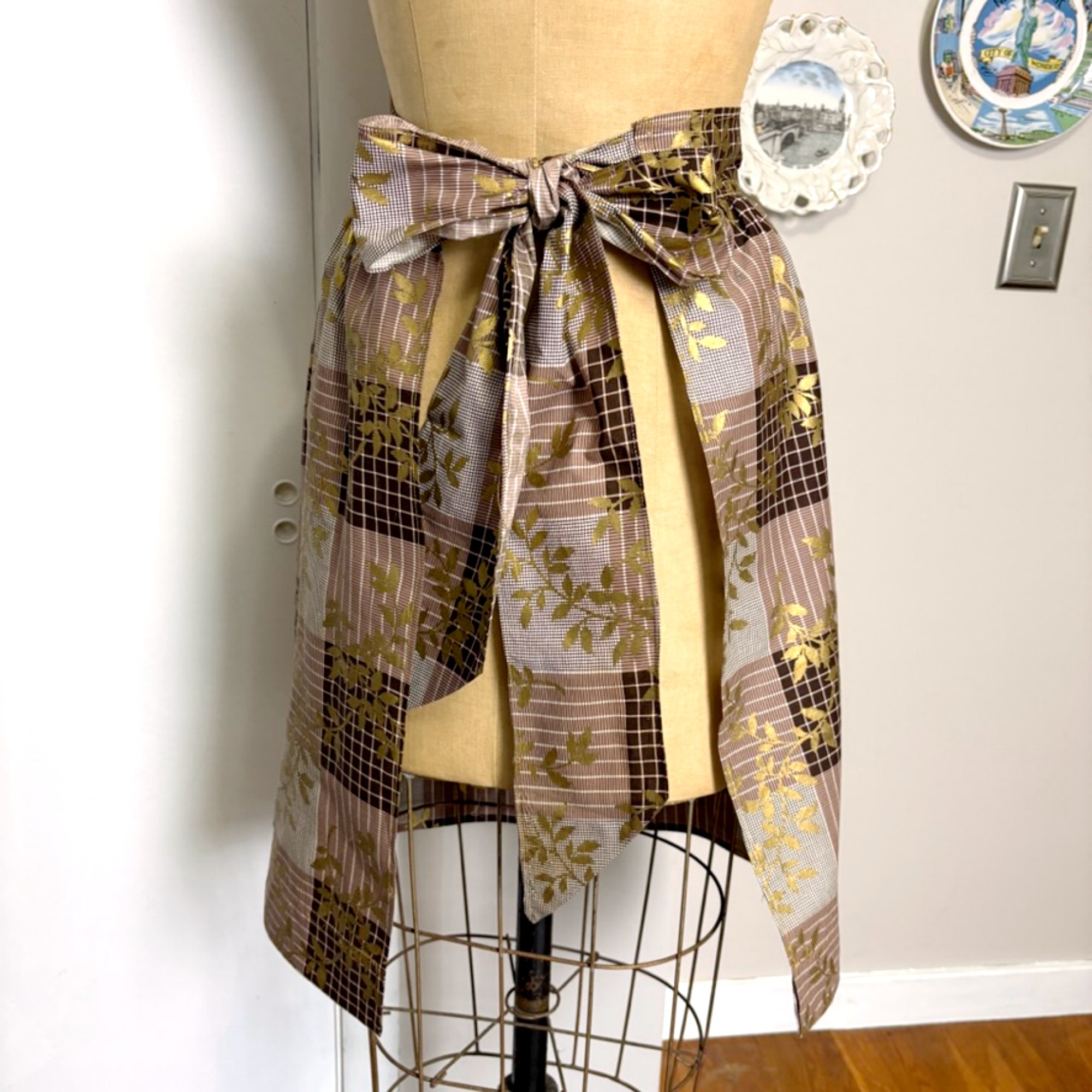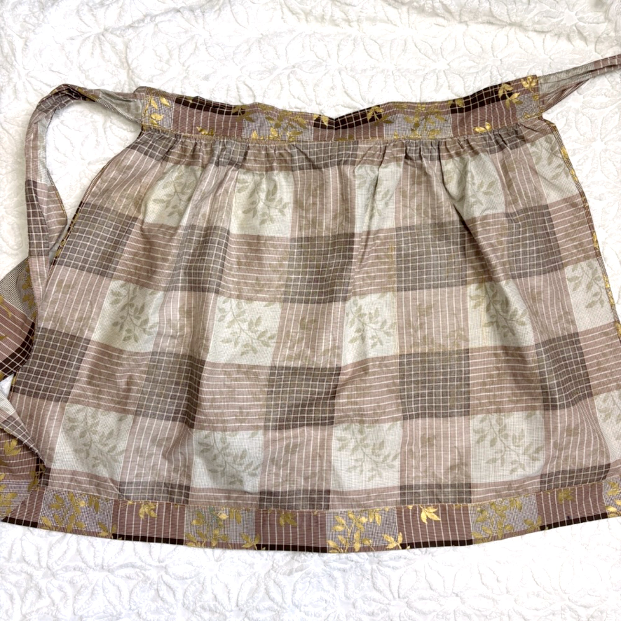 This beauty of a half-apron is generously-sized and was handmade by a skilled sewist from brown plaid fabric with gold leaf print. Handy patch pocket. Perfect for autumn baking, hosting, or festive kitchen decor.