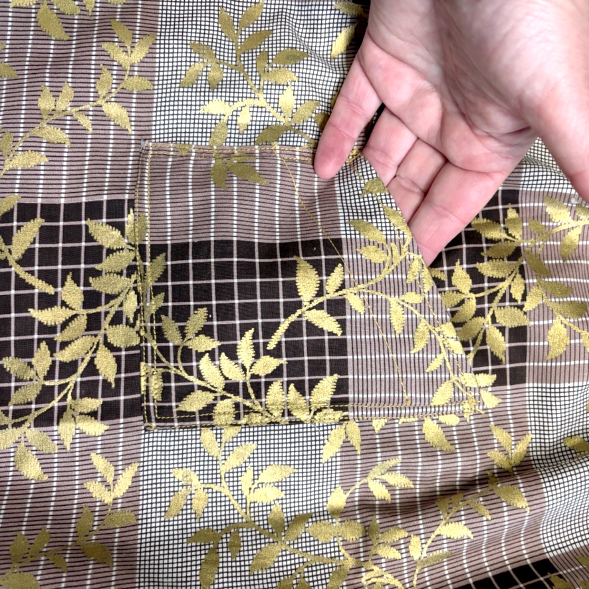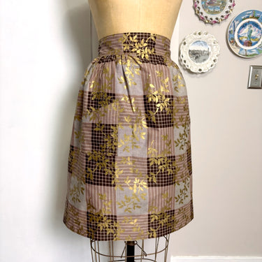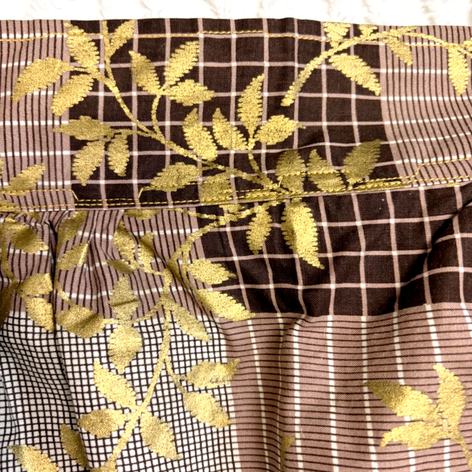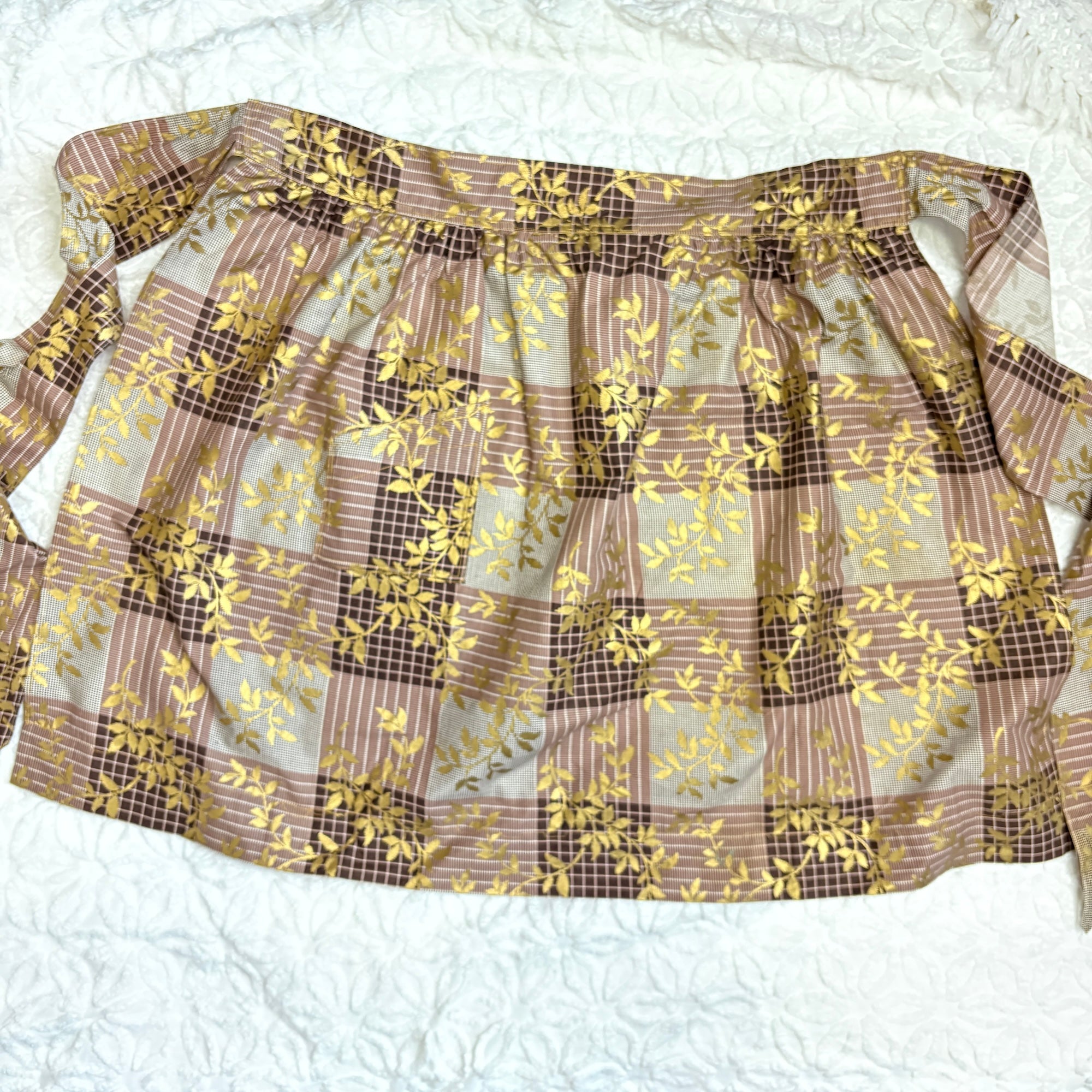This beauty of a half-apron is generously-sized and was handmade by a skilled sewist from brown plaid fabric with gold leaf print. Handy patch pocket. Perfect for autumn baking, hosting, or festive kitchen decor.