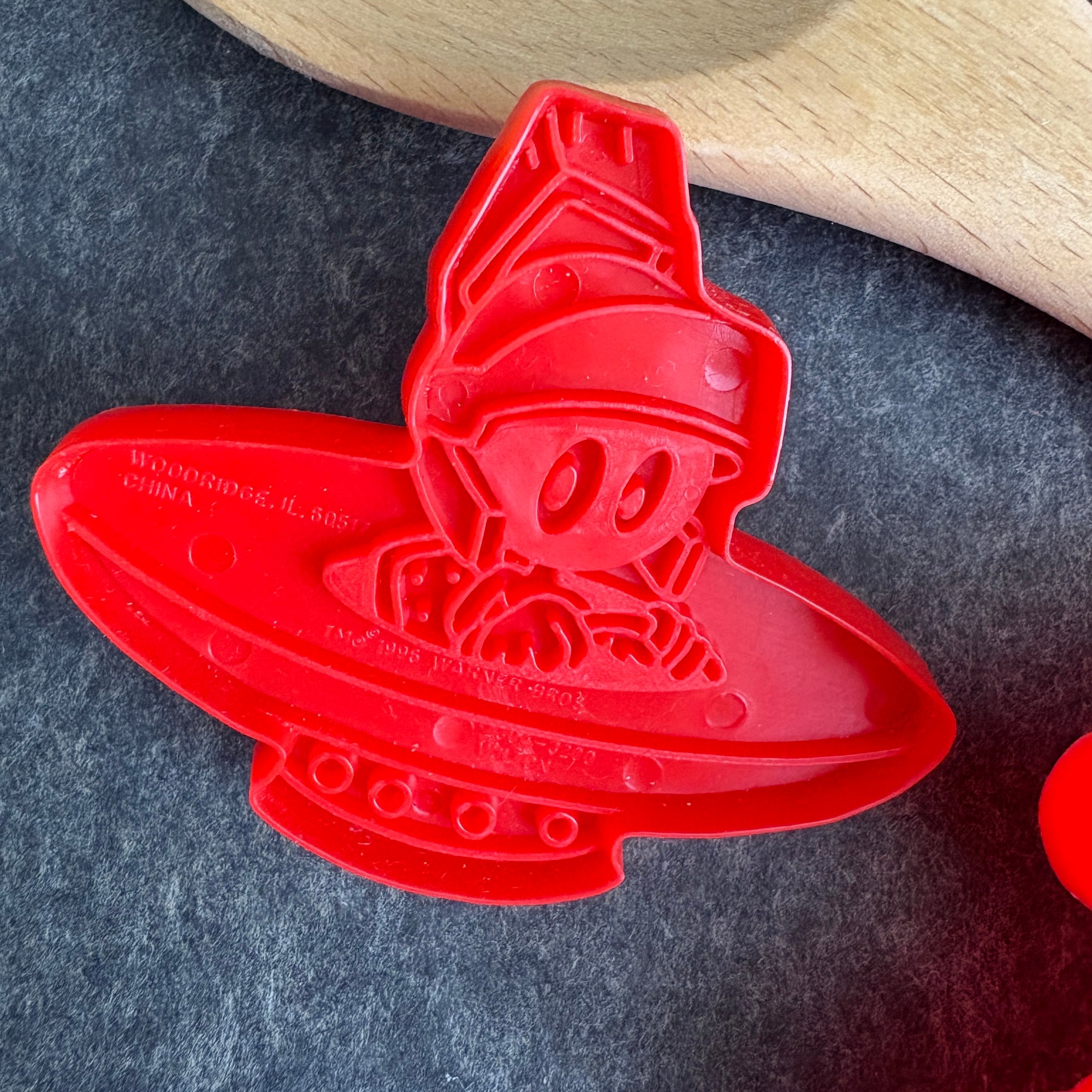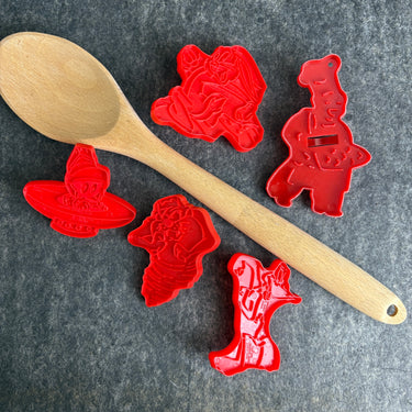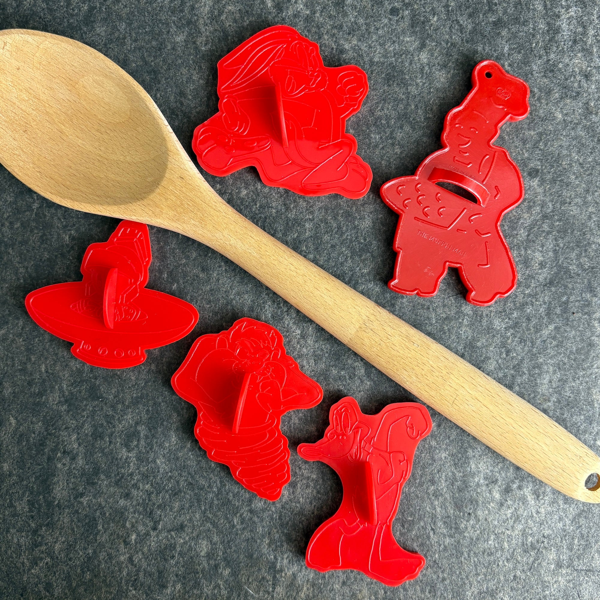 Bring some Saturday morning fun to your kitchen with this set of 5 vintage cookie cutters, featuring your favorite Looney Tunes characters. Made by Wilton in 1996, this red plastic set includes Bugs Bunny, Tasmanian Devil, Marvin the Martian, and Daffy Duck, plus a bonus undated HRM Muffin Man cutter.