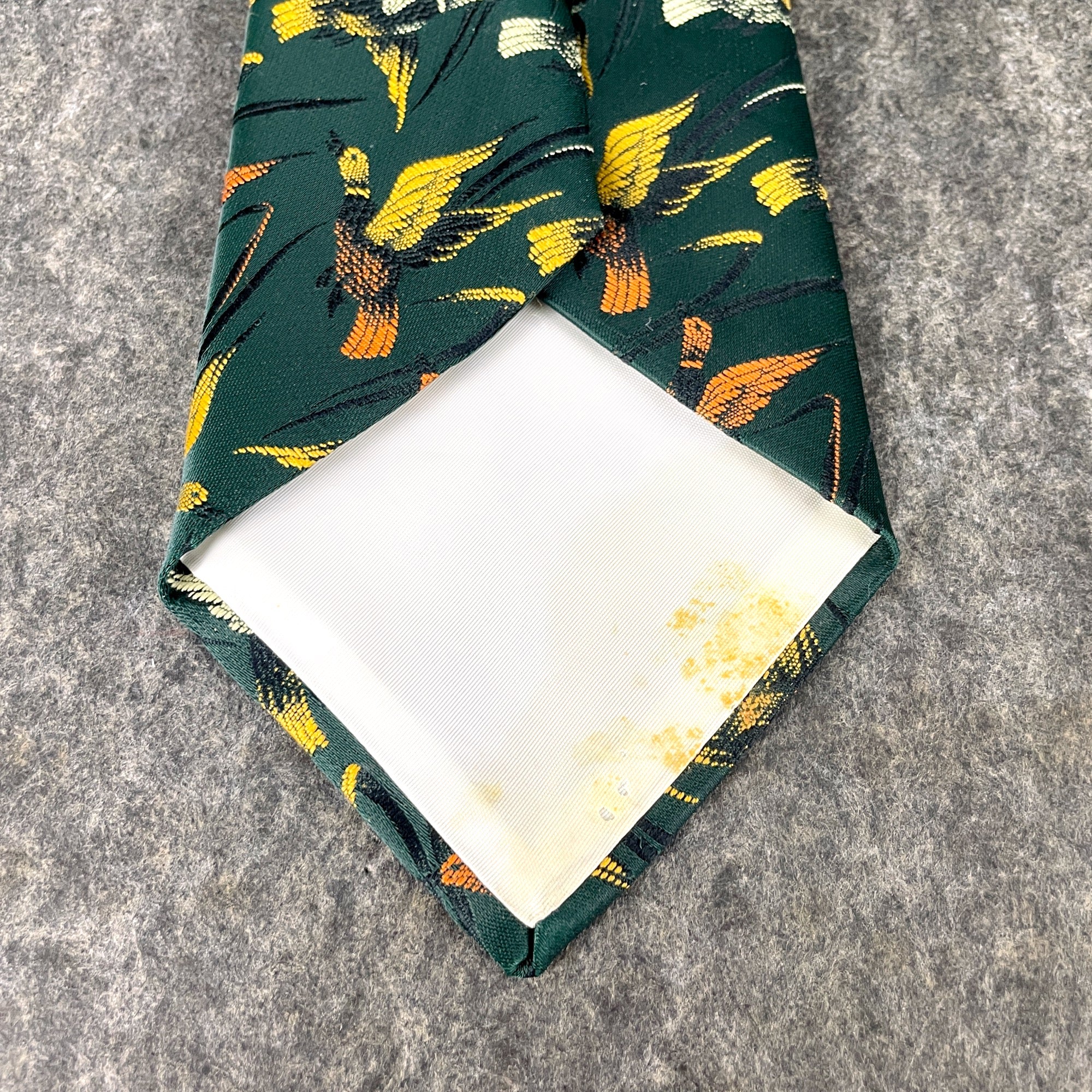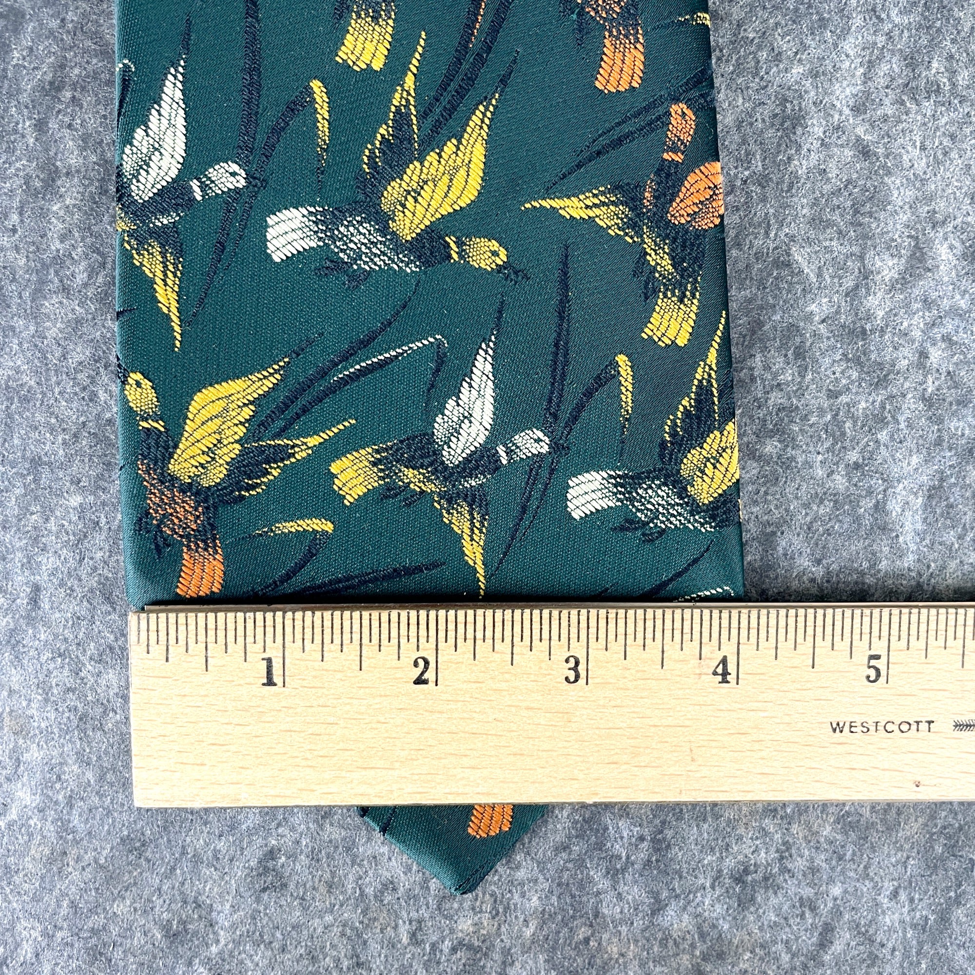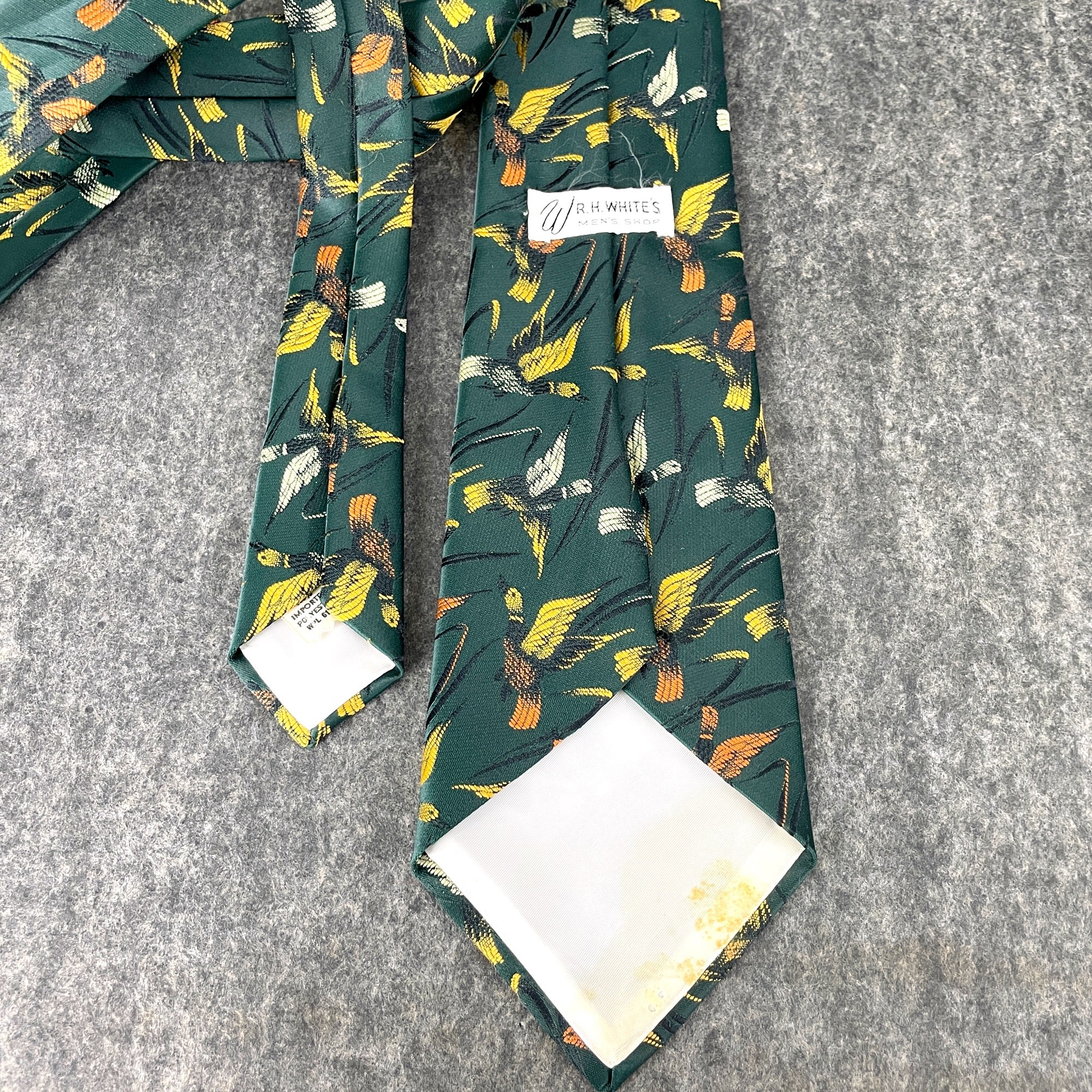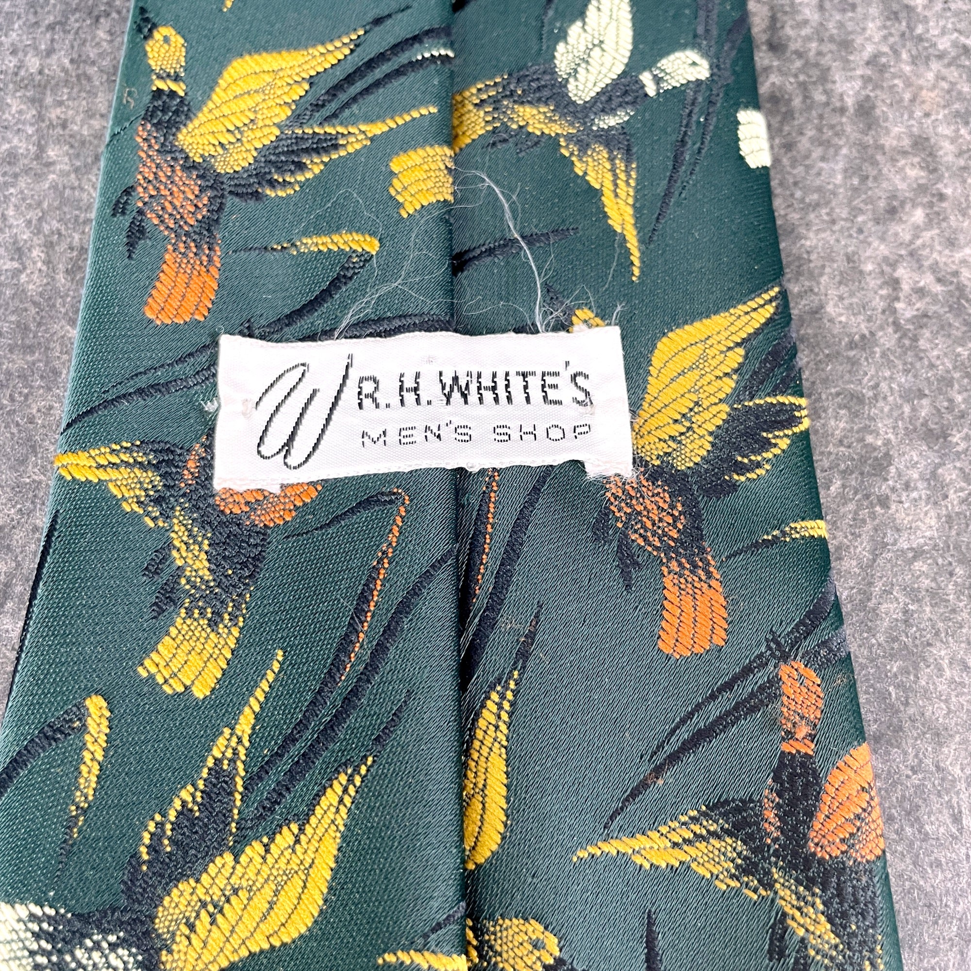 Vintage deep green kipper necktie with flying mallard ducks beige, gold, orange and black. Made for R.H. White's Men's Shop of Boston. This presents a conundrum on dating. R.H. White closed the Boston flagship in 1957. But the style of the tie is late 1960s. The actual date is less important than the fact it has ducks all over it.