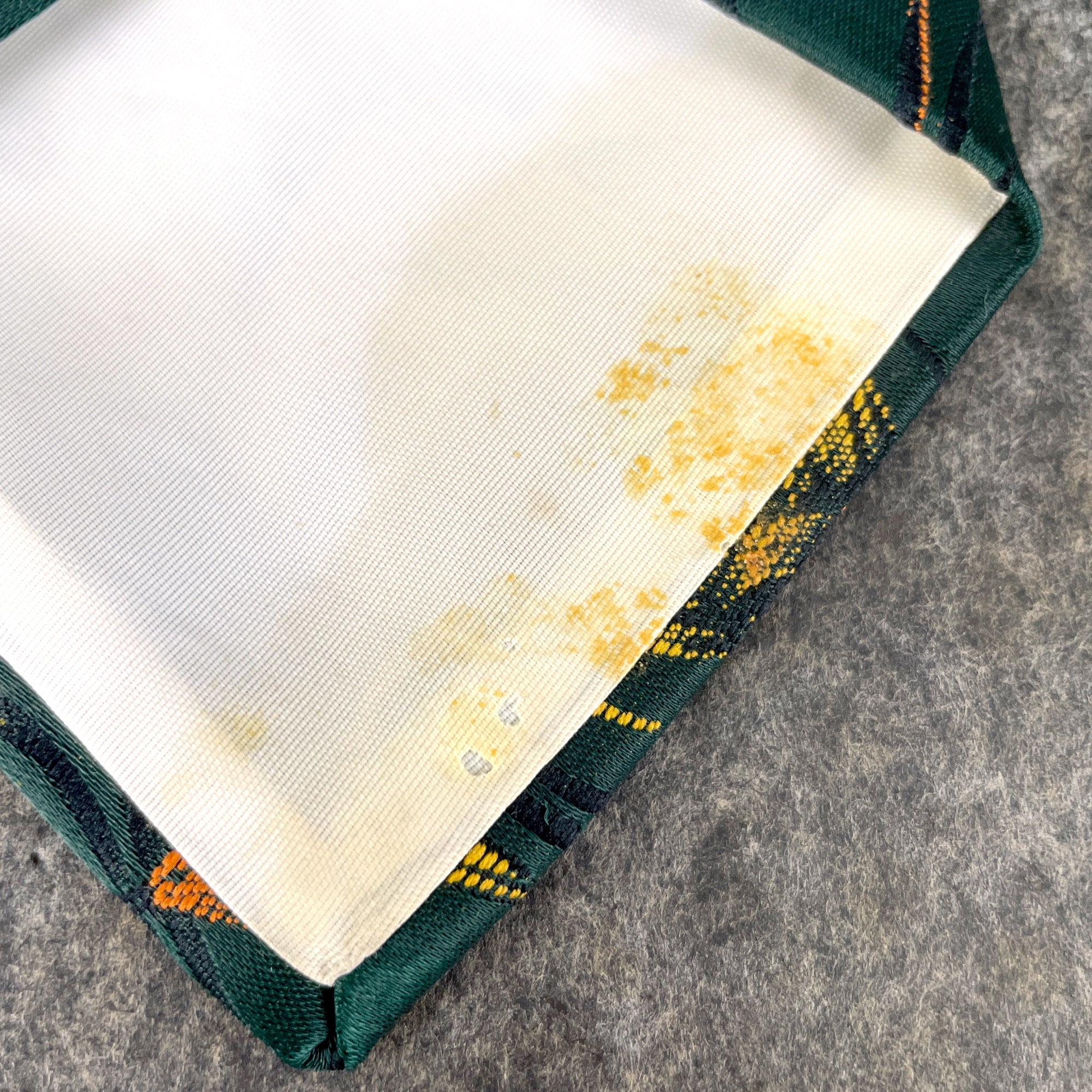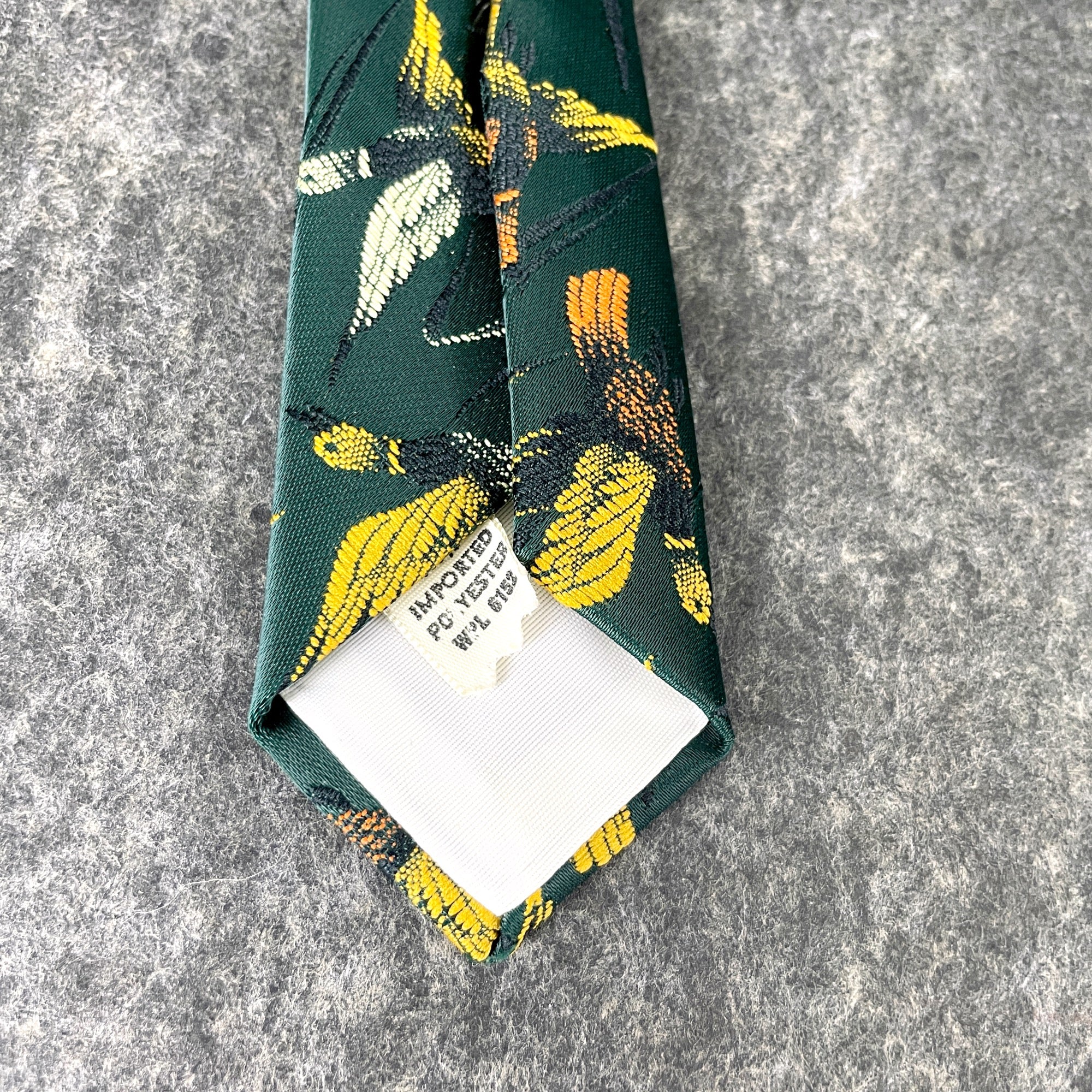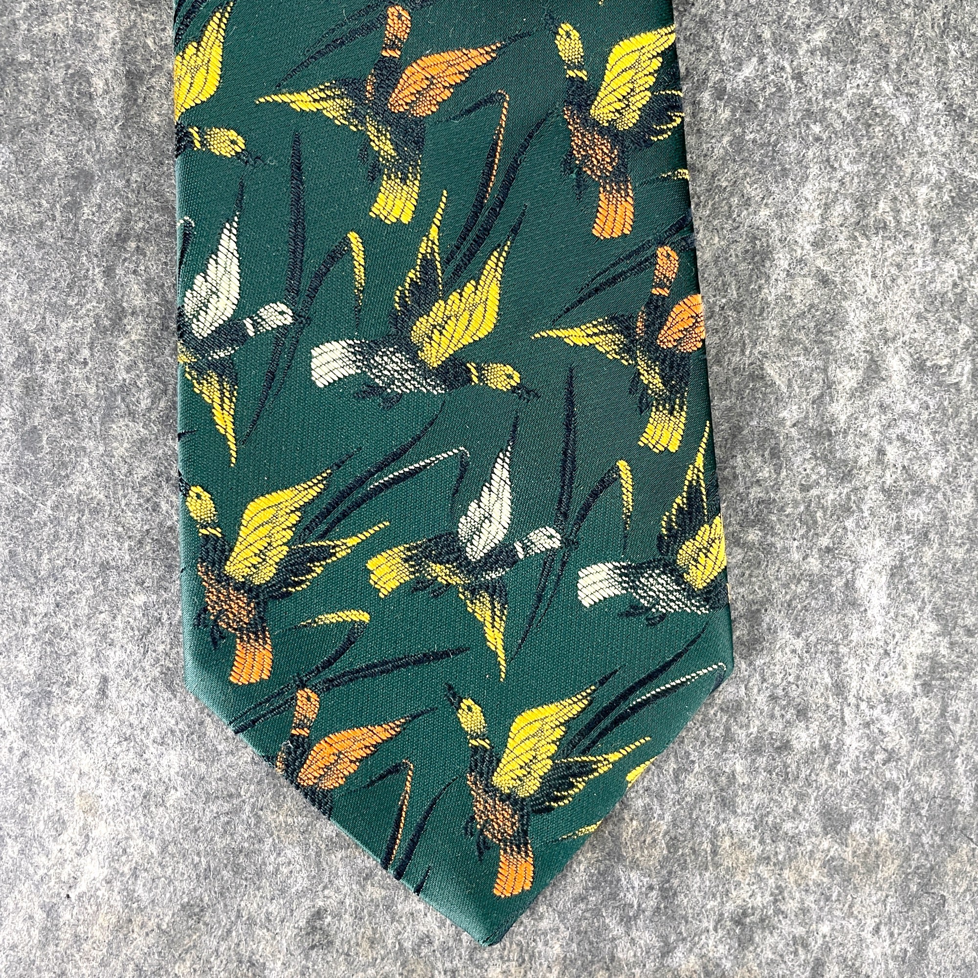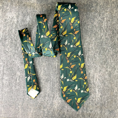 Vintage deep green kipper necktie with flying mallard ducks beige, gold, orange and black. Made for R.H. White's Men's Shop of Boston. This presents a conundrum on dating. R.H. White closed the Boston flagship in 1957. But the style of the tie is late 1960s. The actual date is less important than the fact it has ducks all over it.