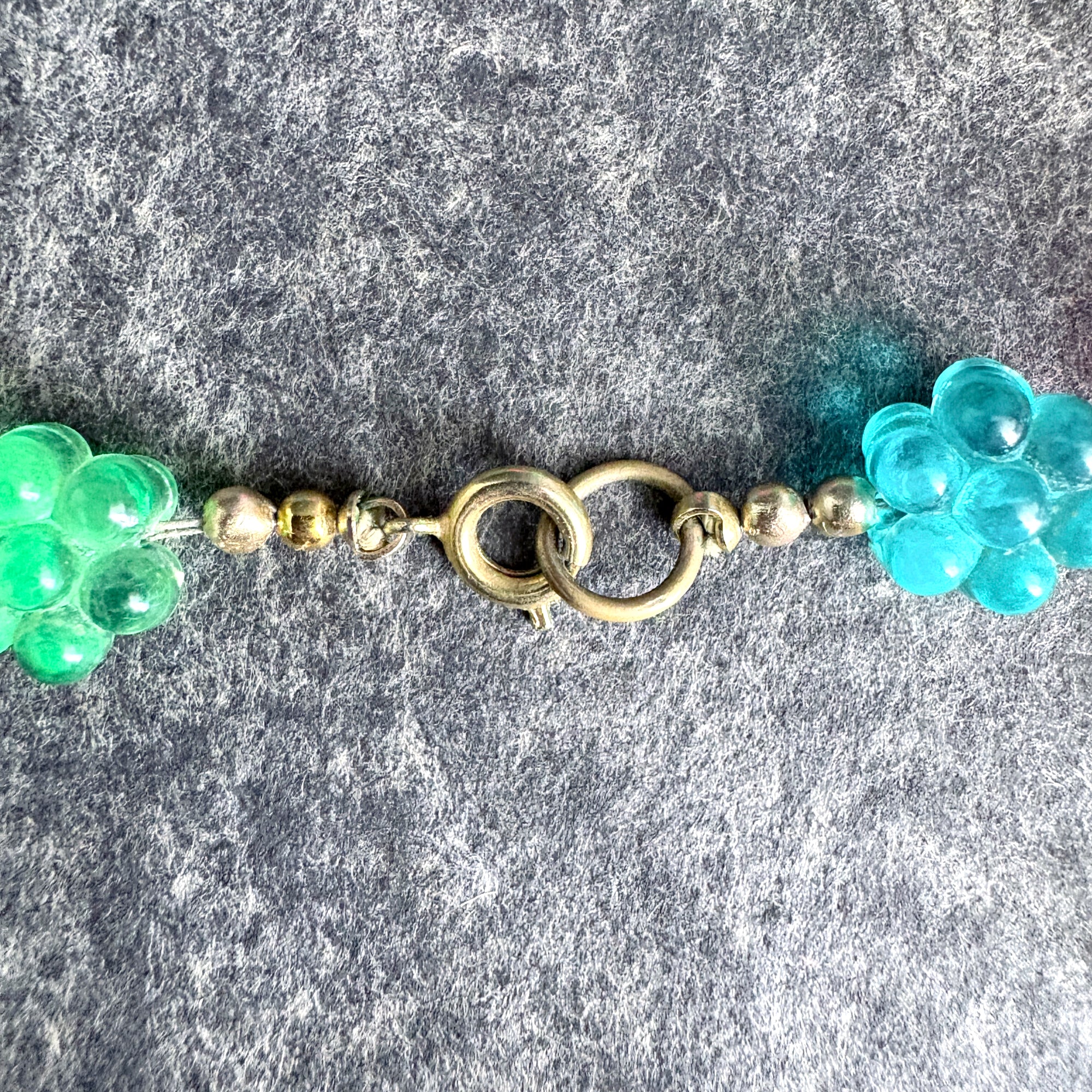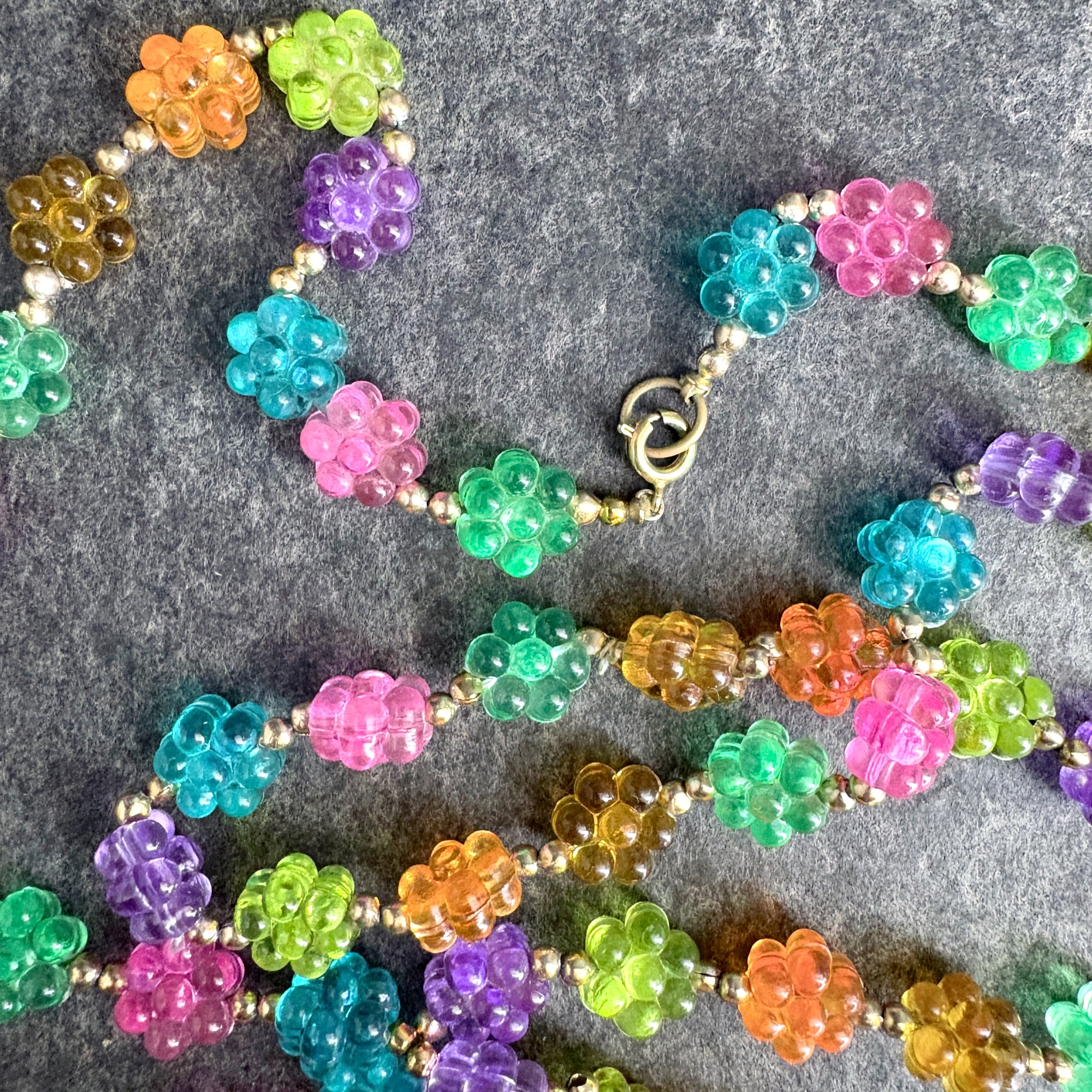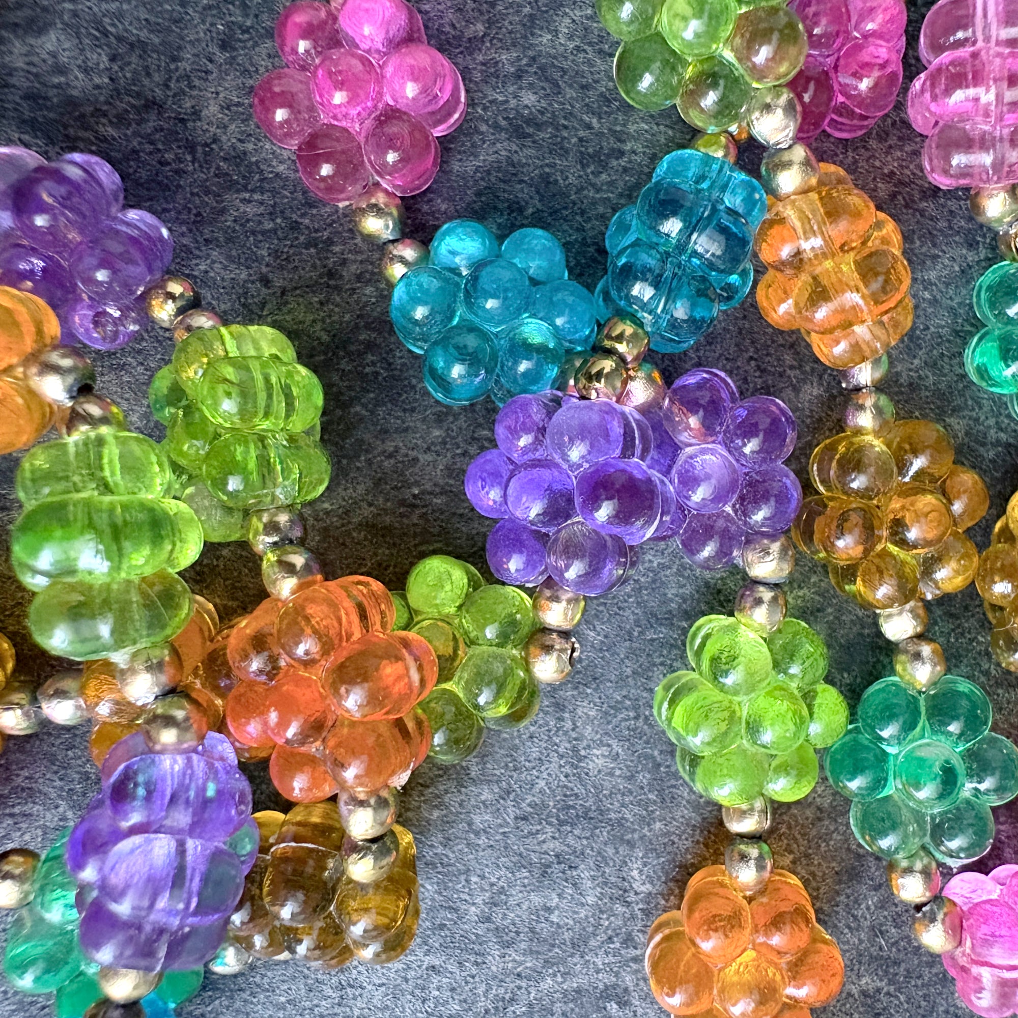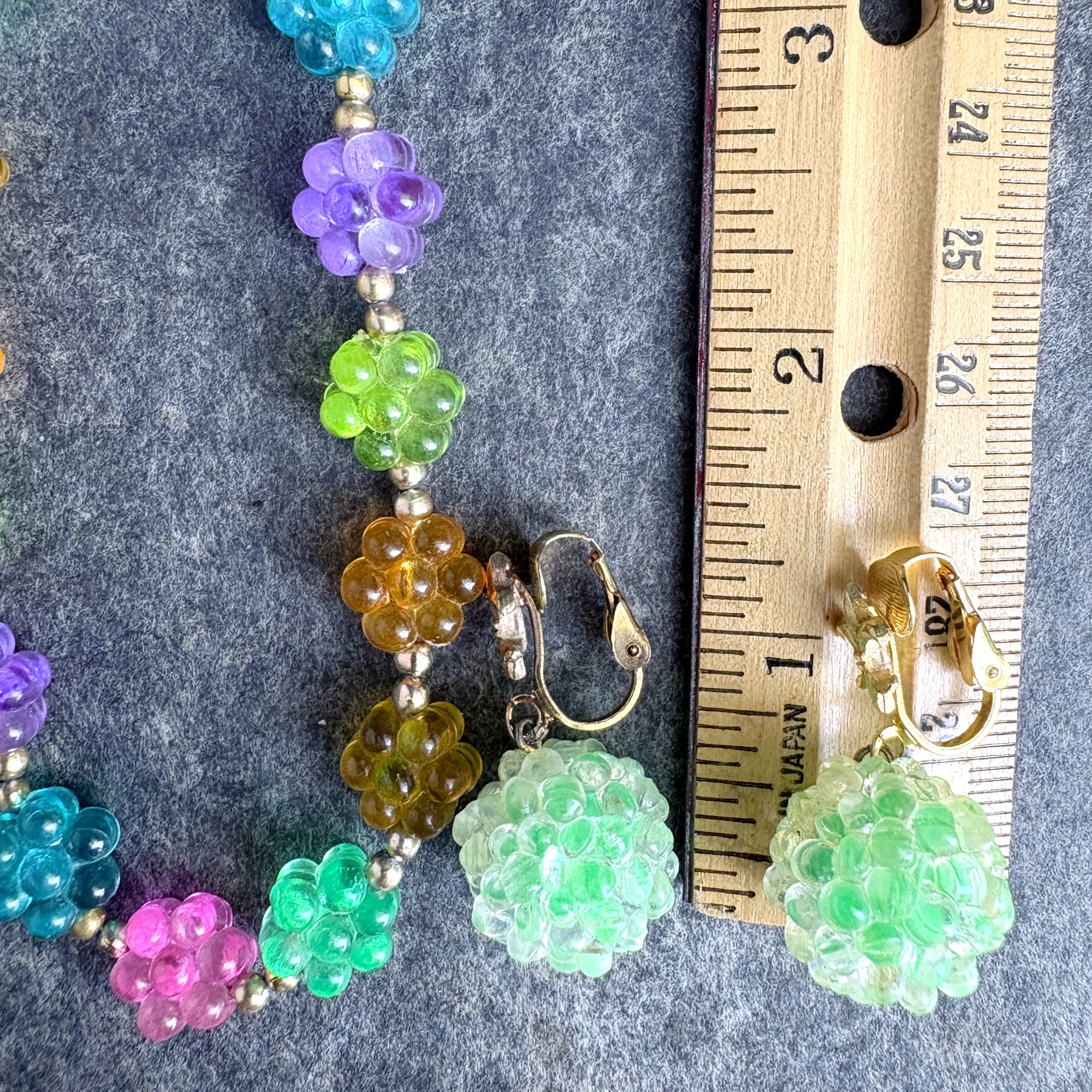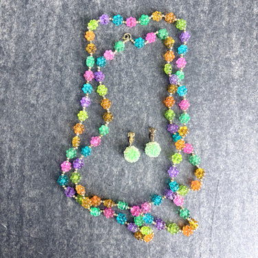Candy colored flower beads rope necklace and clip-on earrings set – 1960s-70s mod retro