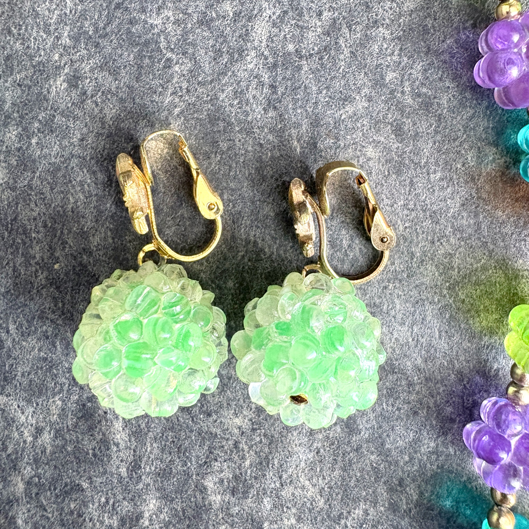 The set also includes a pair of coordinating clip-on earrings featuring small clear round beads surrounding a green center and a fleur-de-lis on the clip.