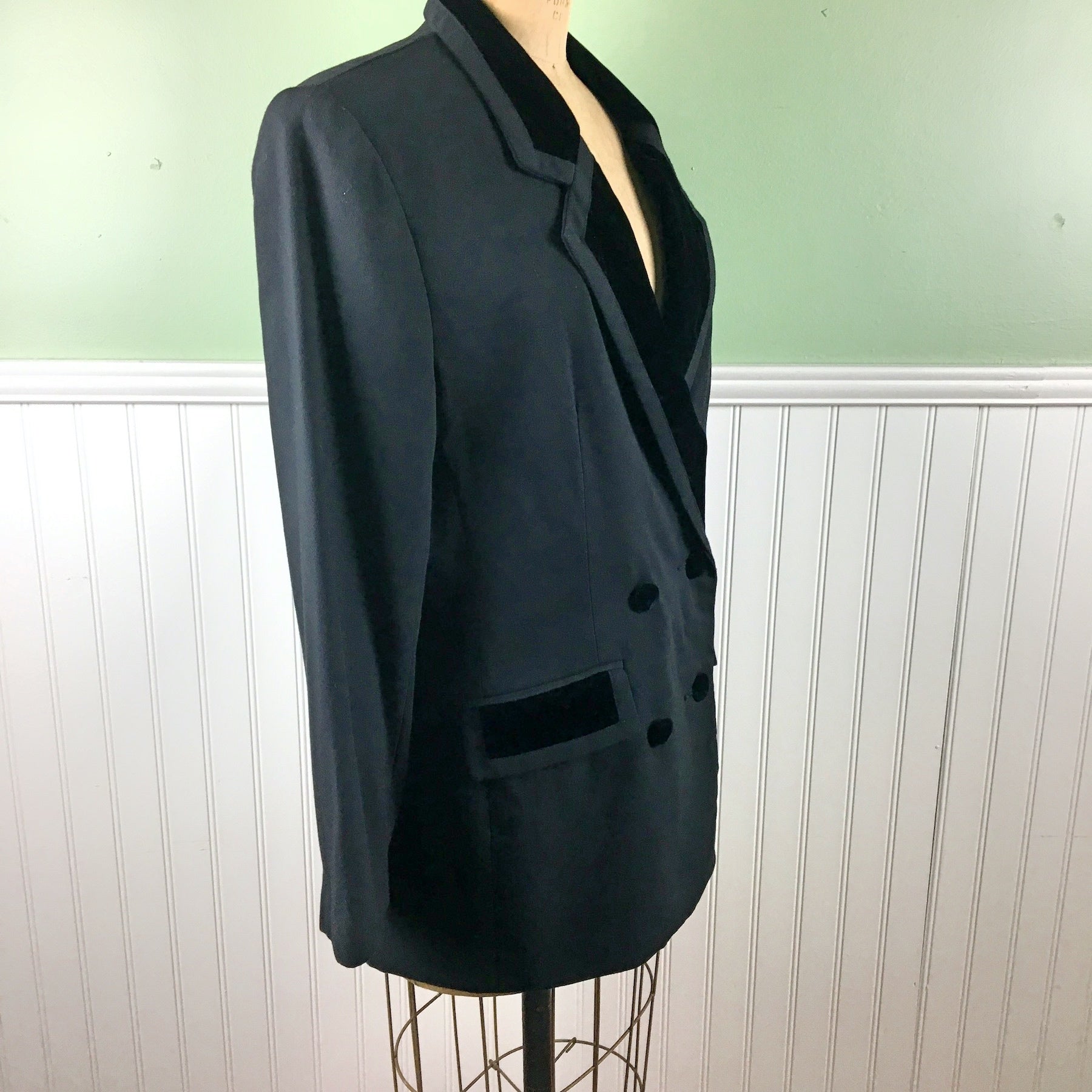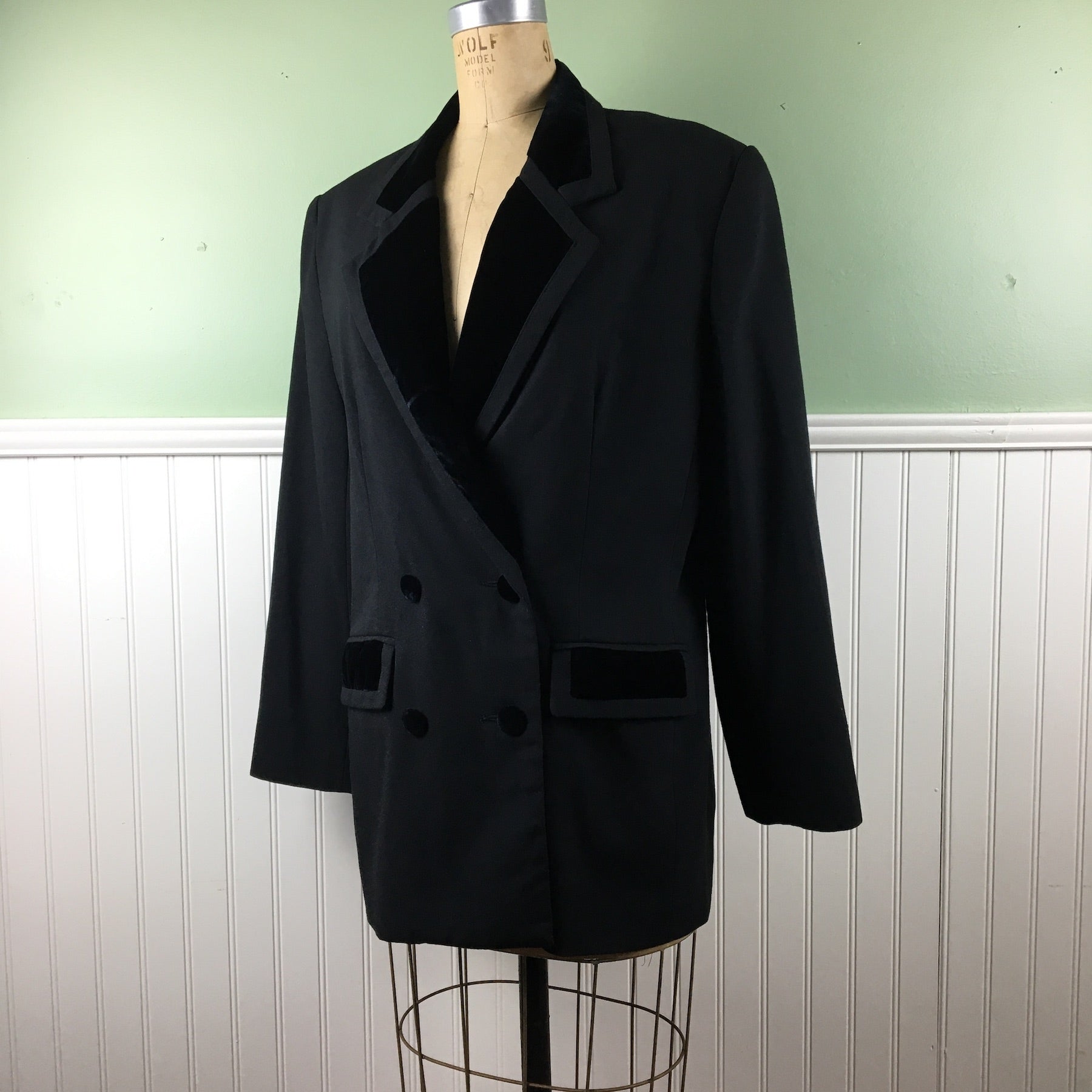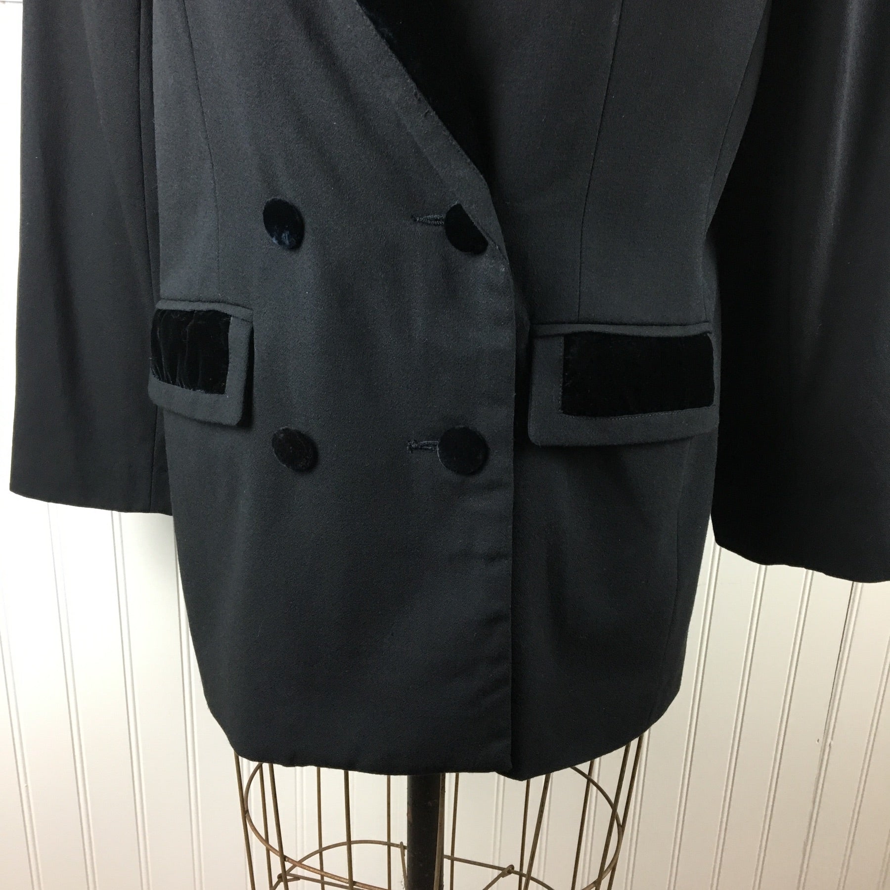 Vintage 1980s vintage women's double-breasted tuxedo jacket by S.K. & Company. Matte crepe with velvet lapels, buttons and trim. Boxy shape with shoulder pads, the better to lean in with. Long darts for shaping. Faux pockets. Made in China.