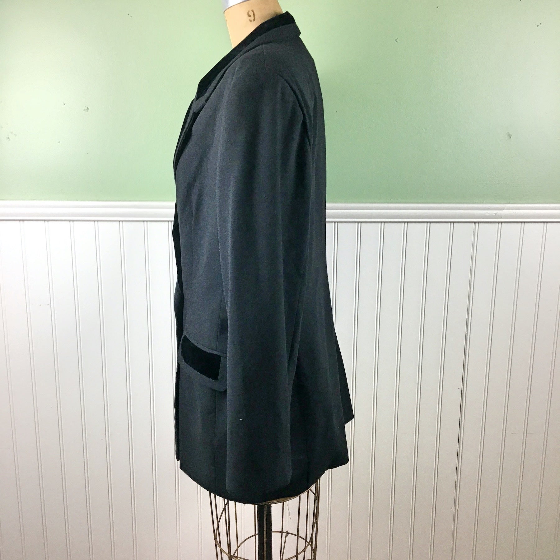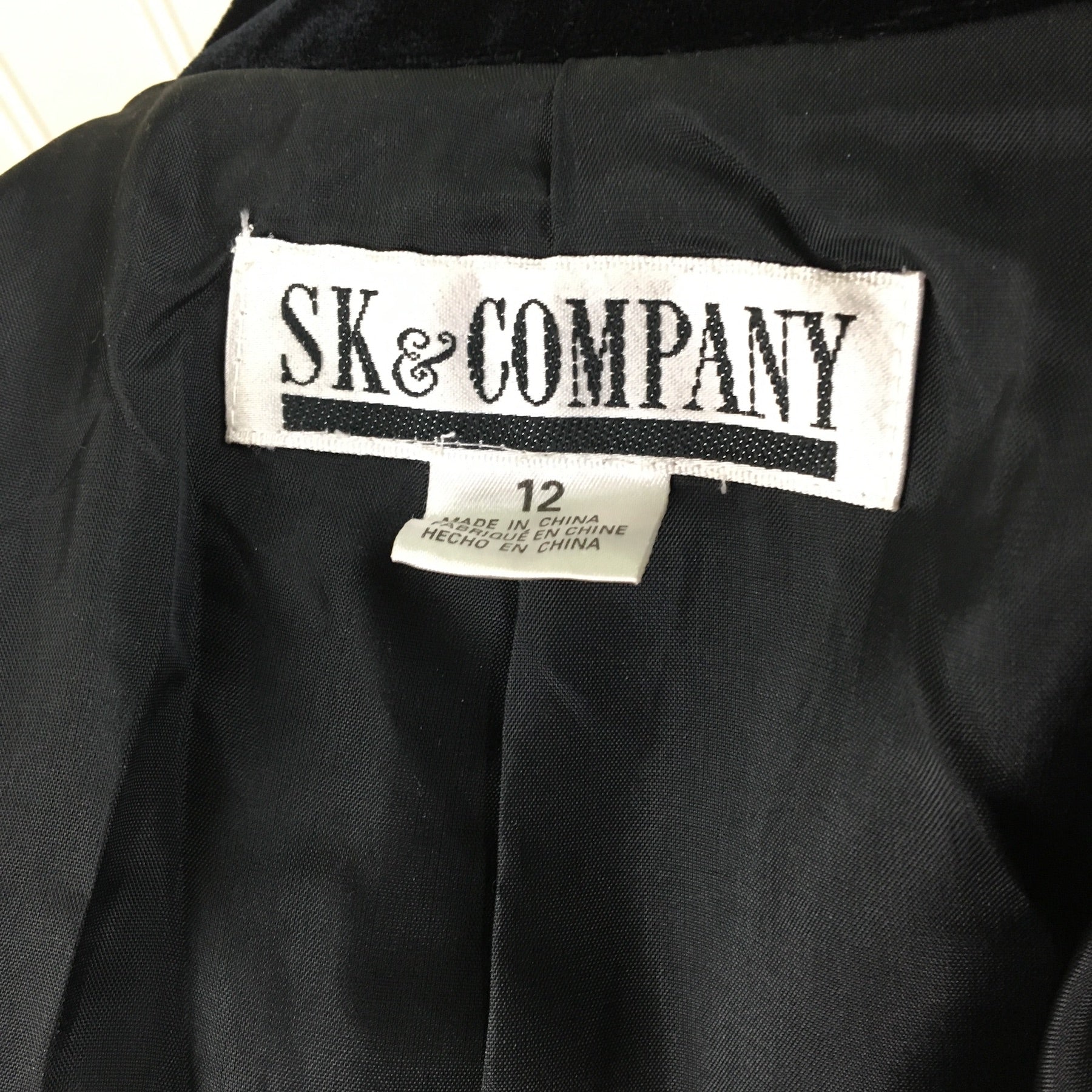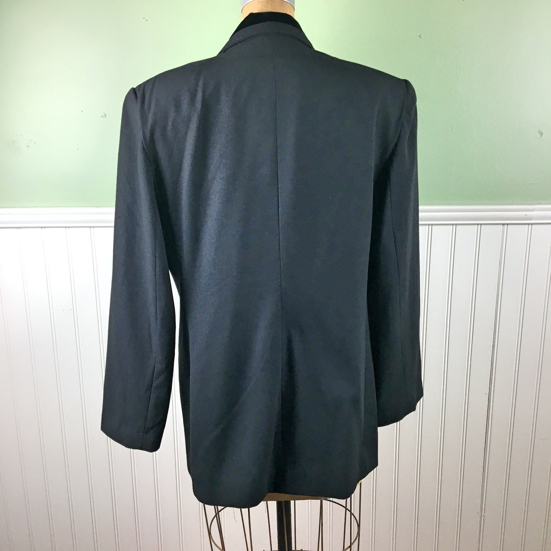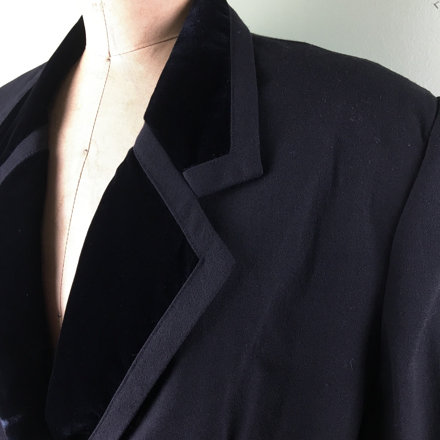 Vintage 1980s vintage women's double-breasted tuxedo jacket by S.K. & Company. Matte crepe with velvet lapels, buttons and trim. Boxy shape with shoulder pads, the better to lean in with. Long darts for shaping. Faux pockets. Made in China.