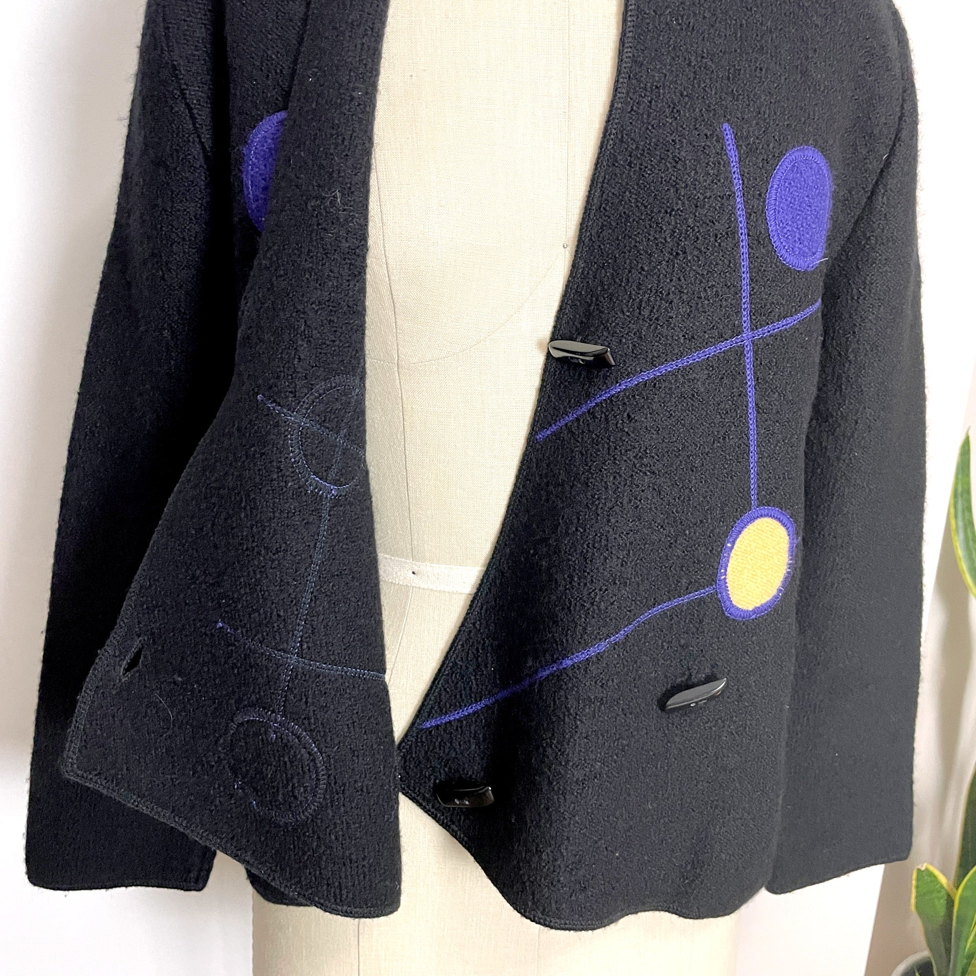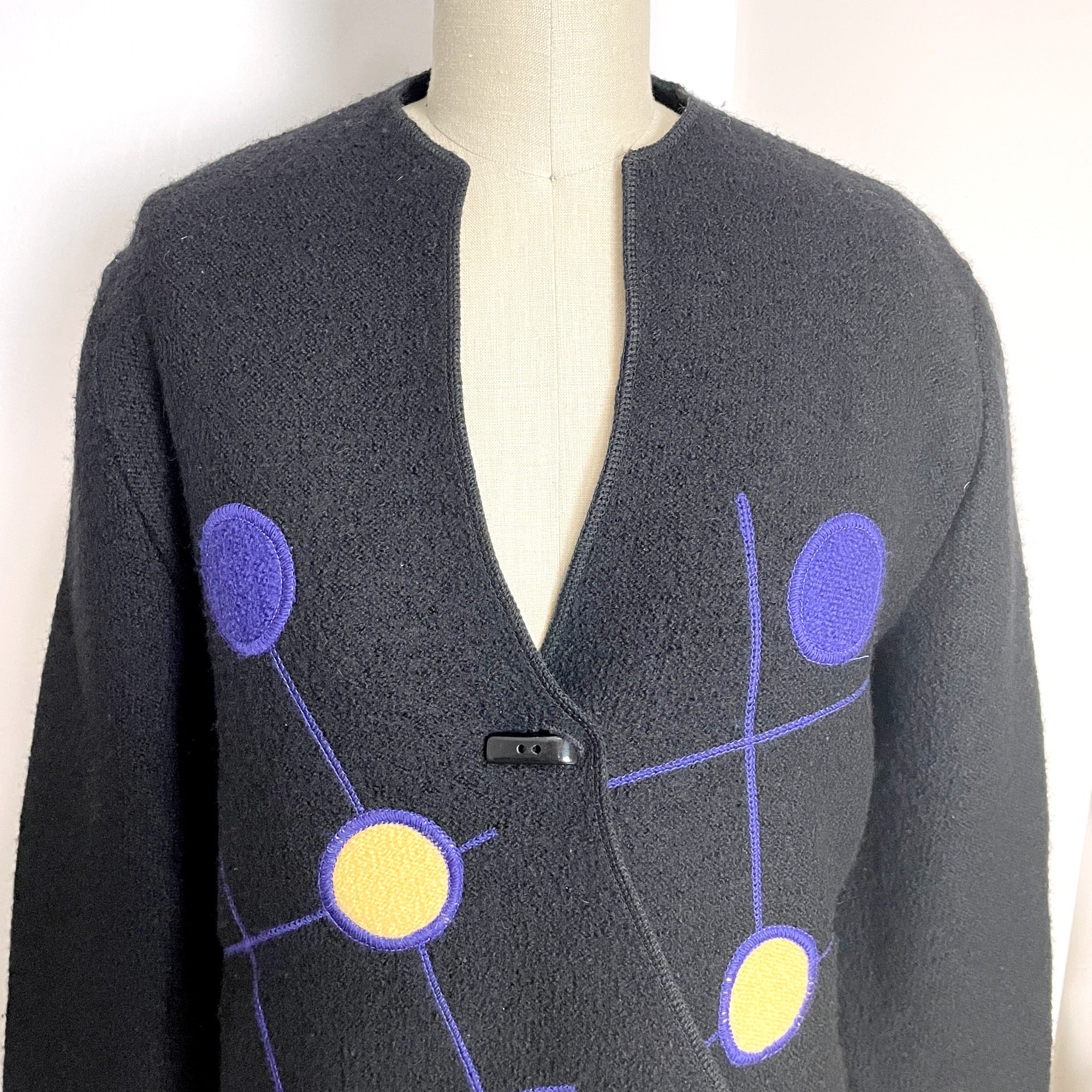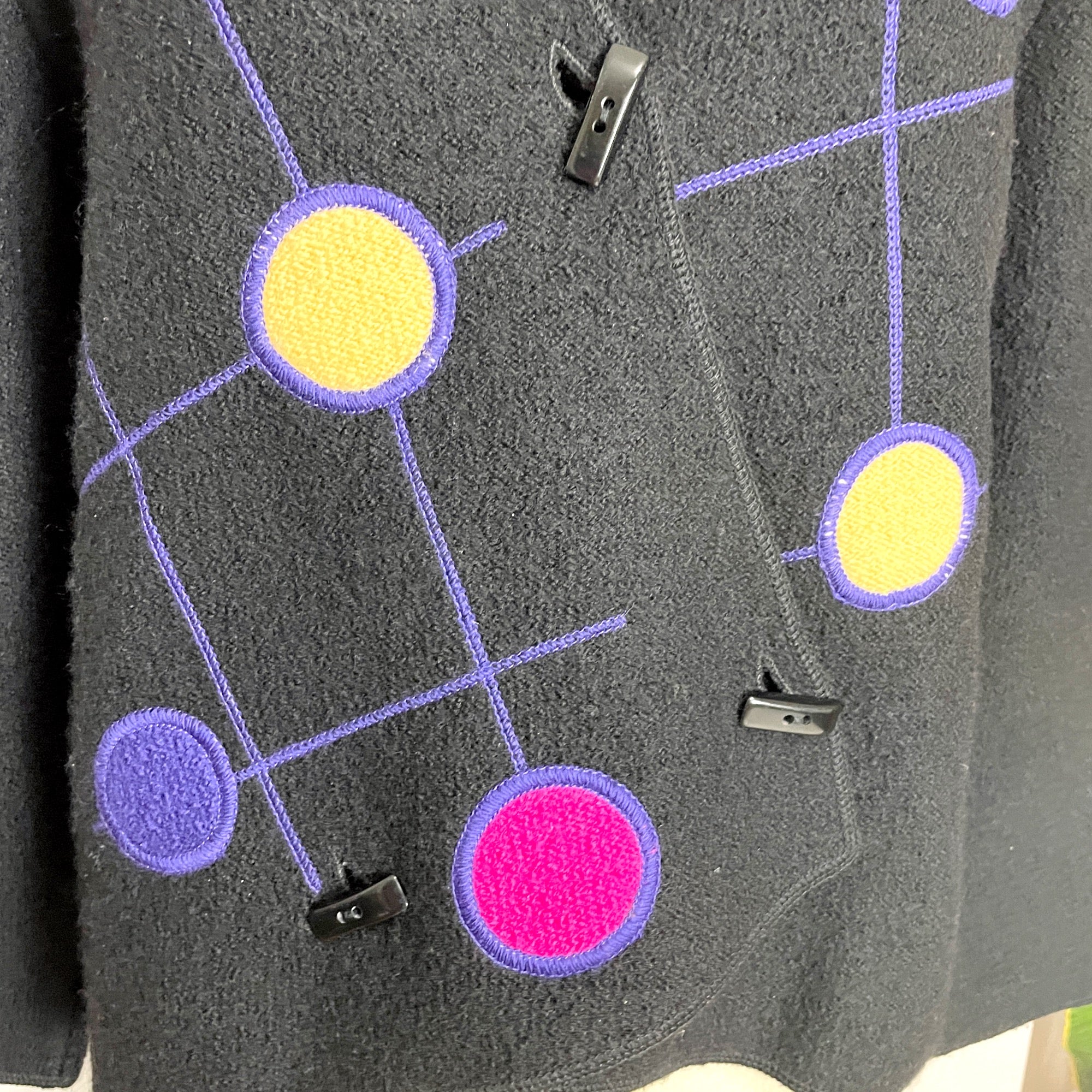 From South Wool, a black boiled wool jacket with bright colored modernist design on the wrap front. Toggle buttons. High low hem. V-neck. Made in Uruguay. Warmth without weight.