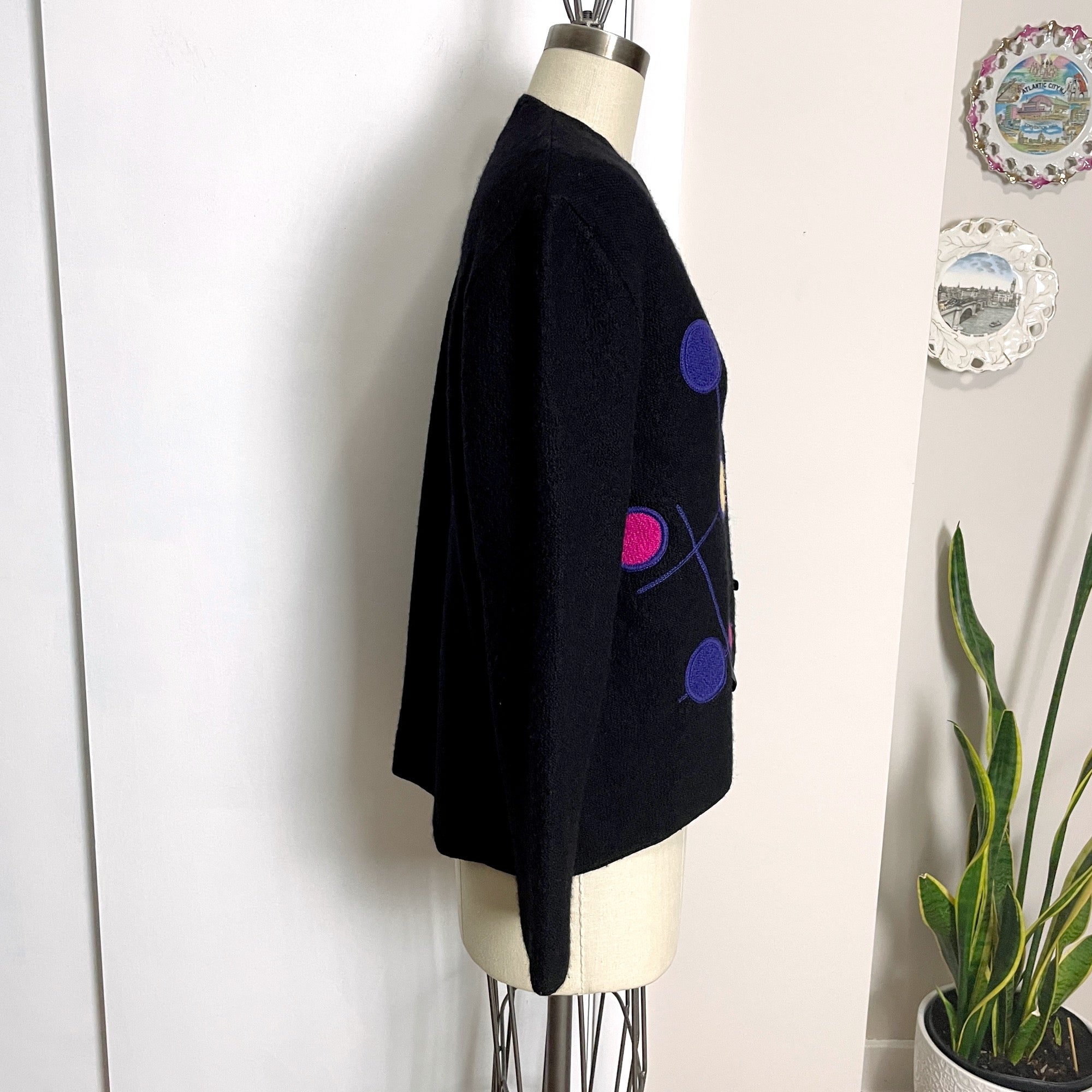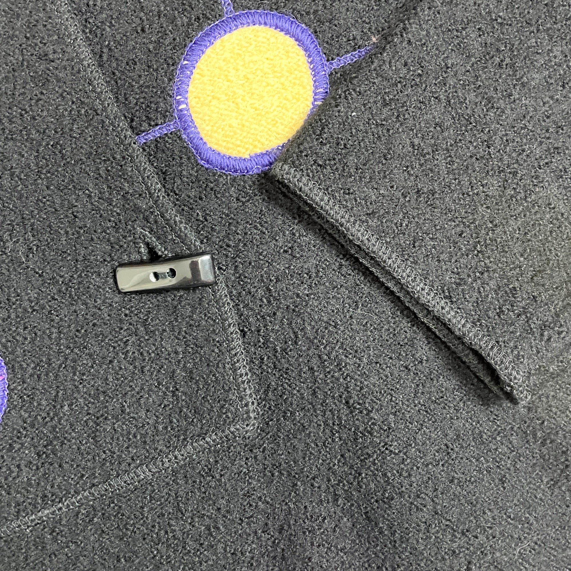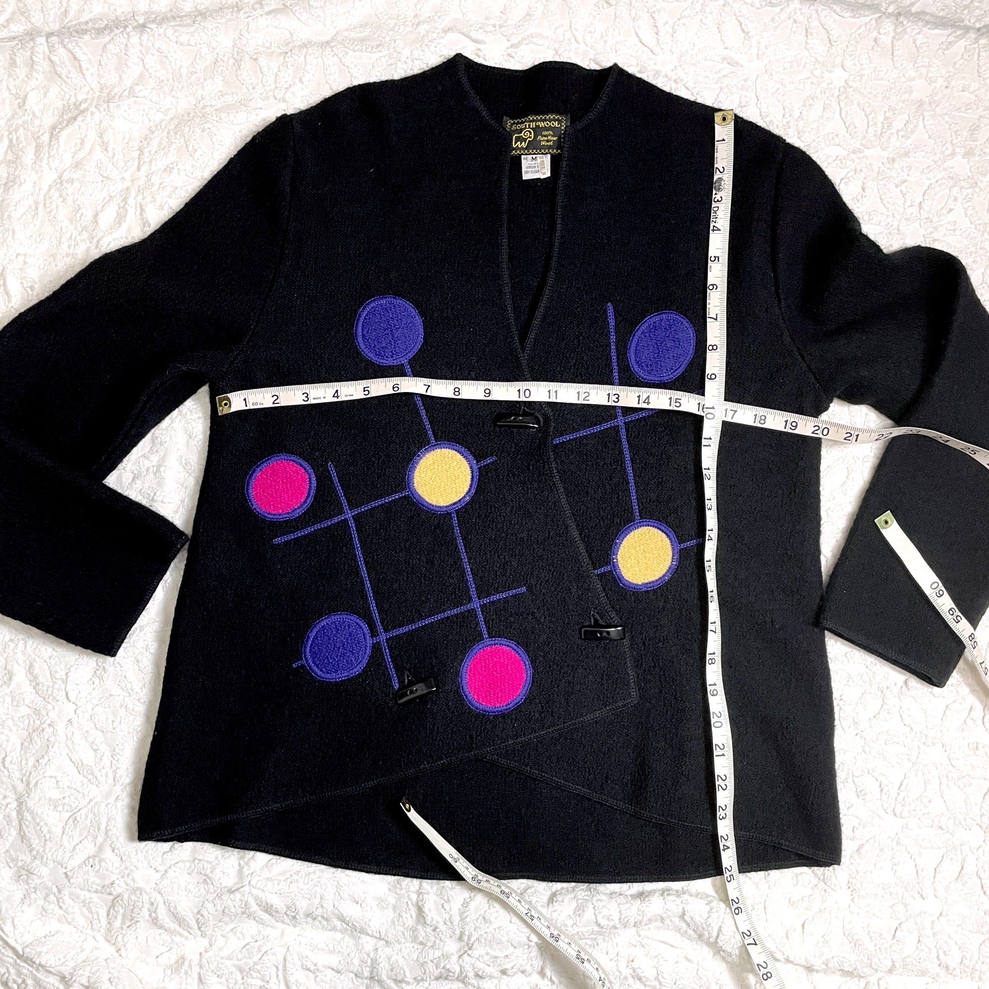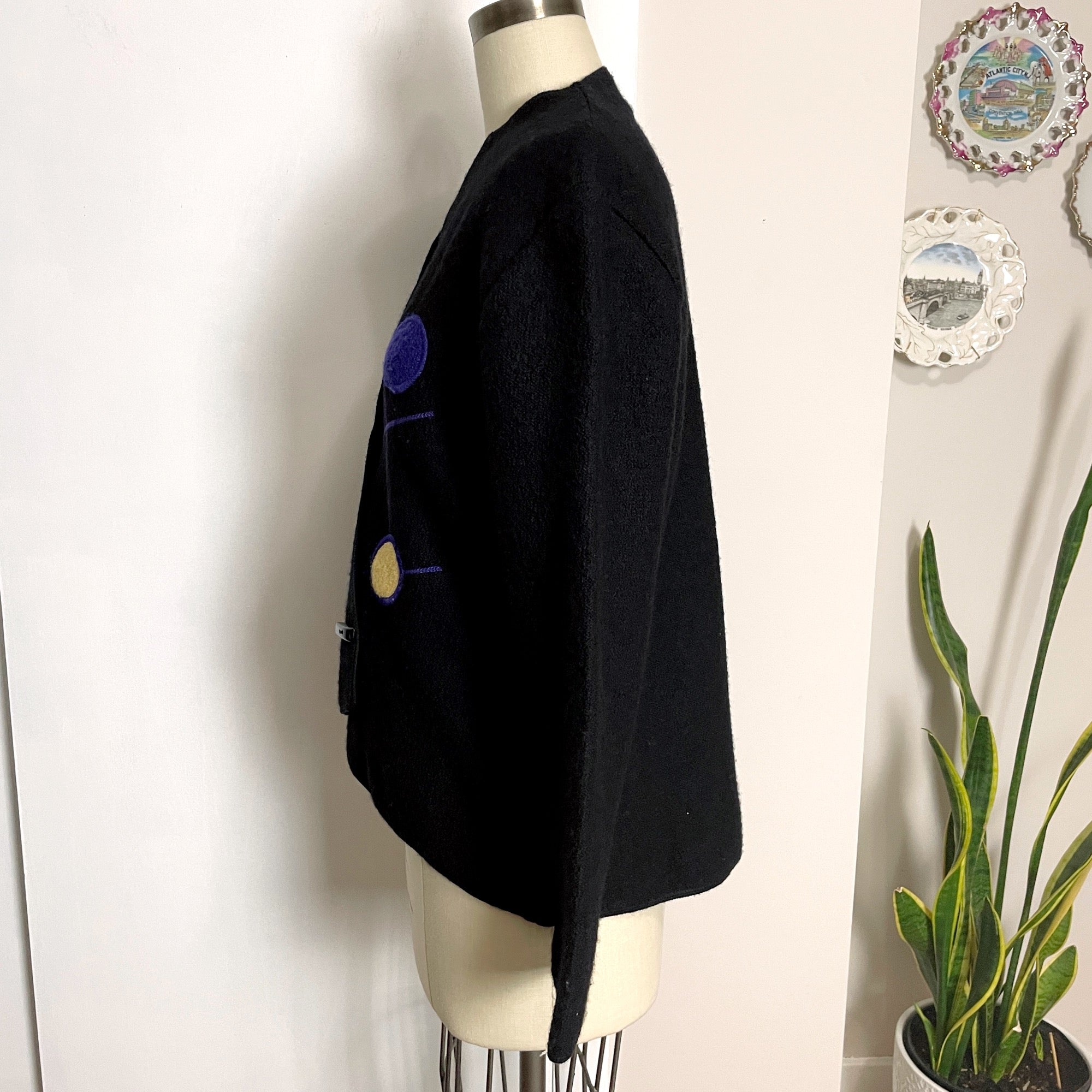 From South Wool, a black boiled wool jacket with bright colored modernist design on the wrap front. Toggle buttons. High low hem. V-neck. Made in Uruguay. Warmth without weight.