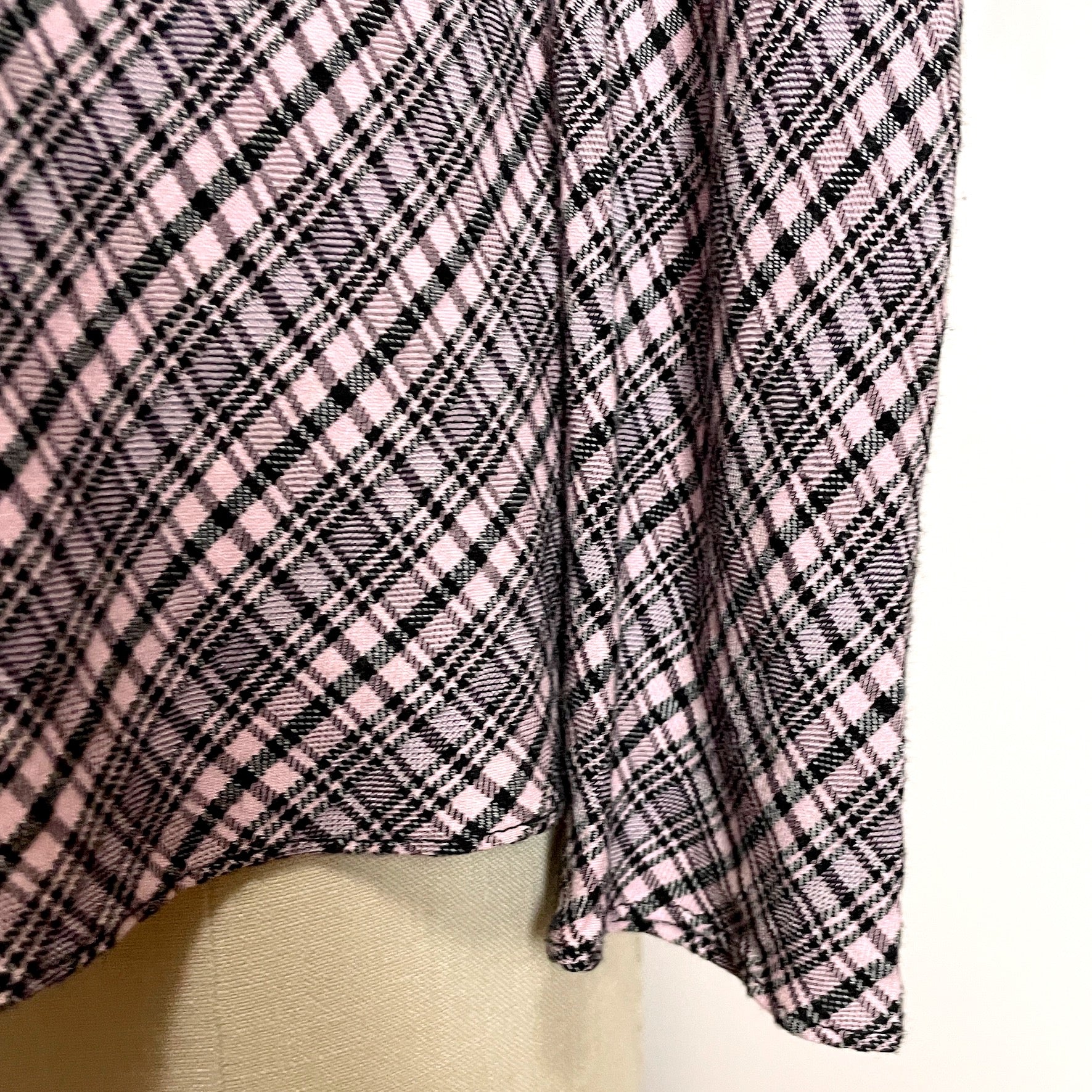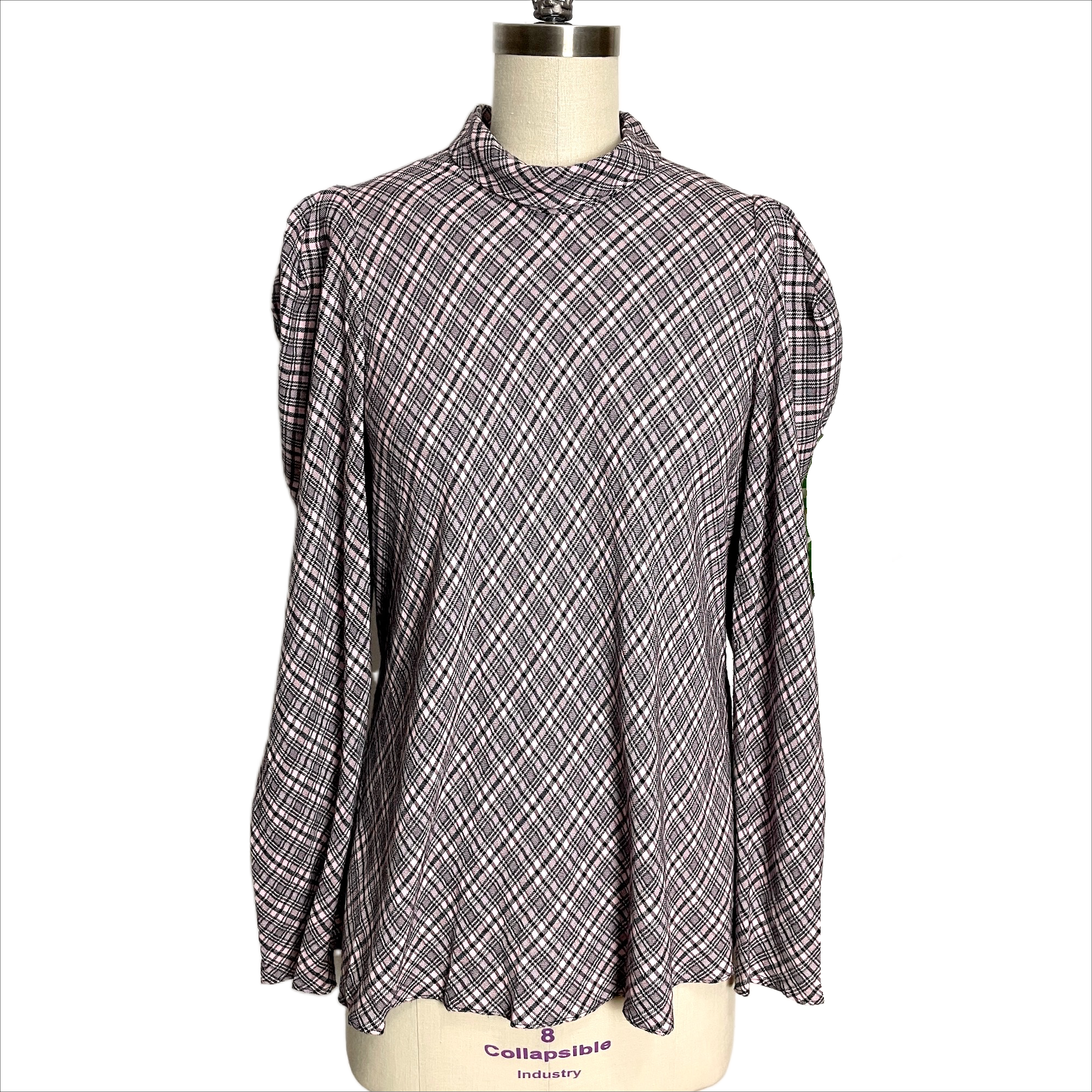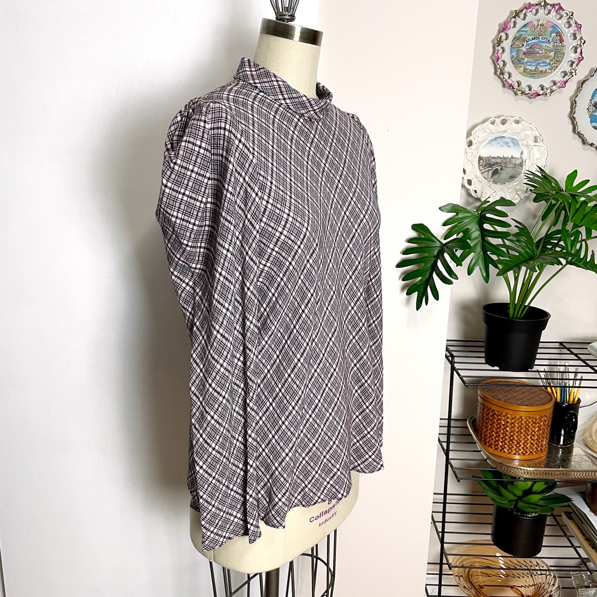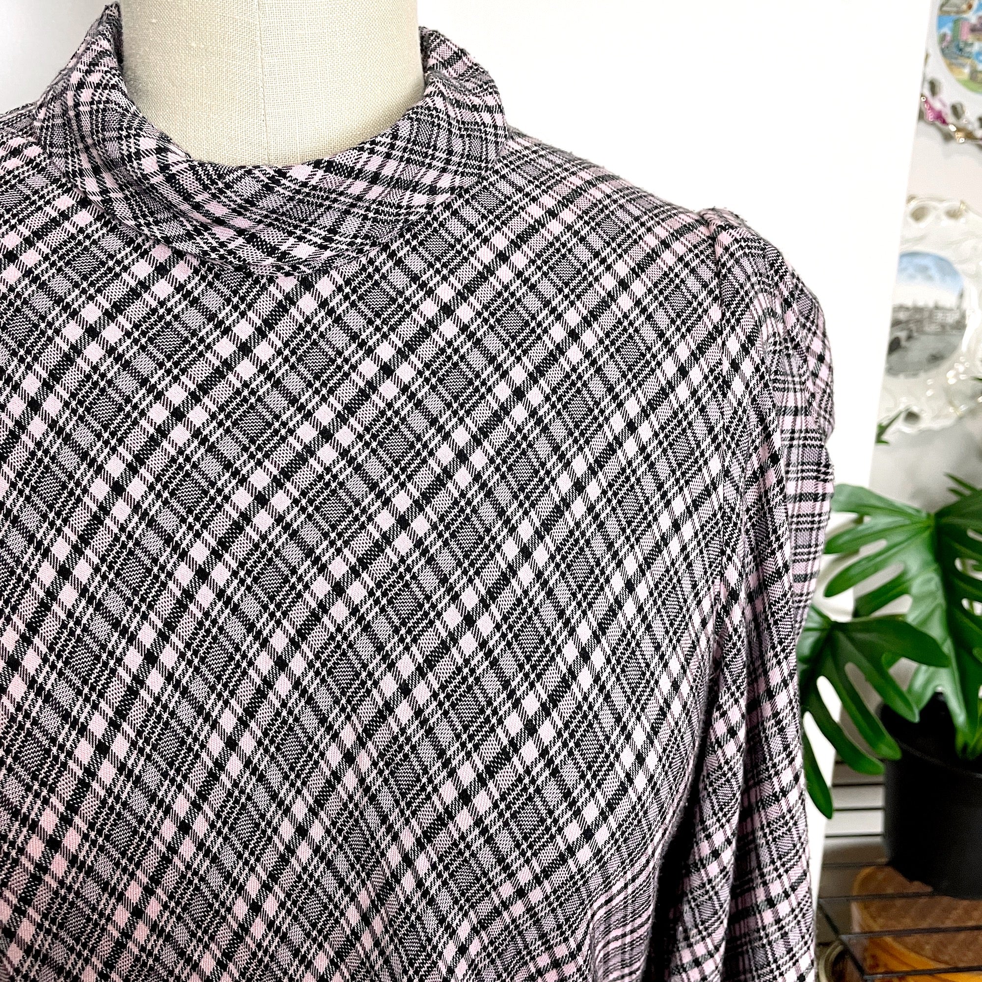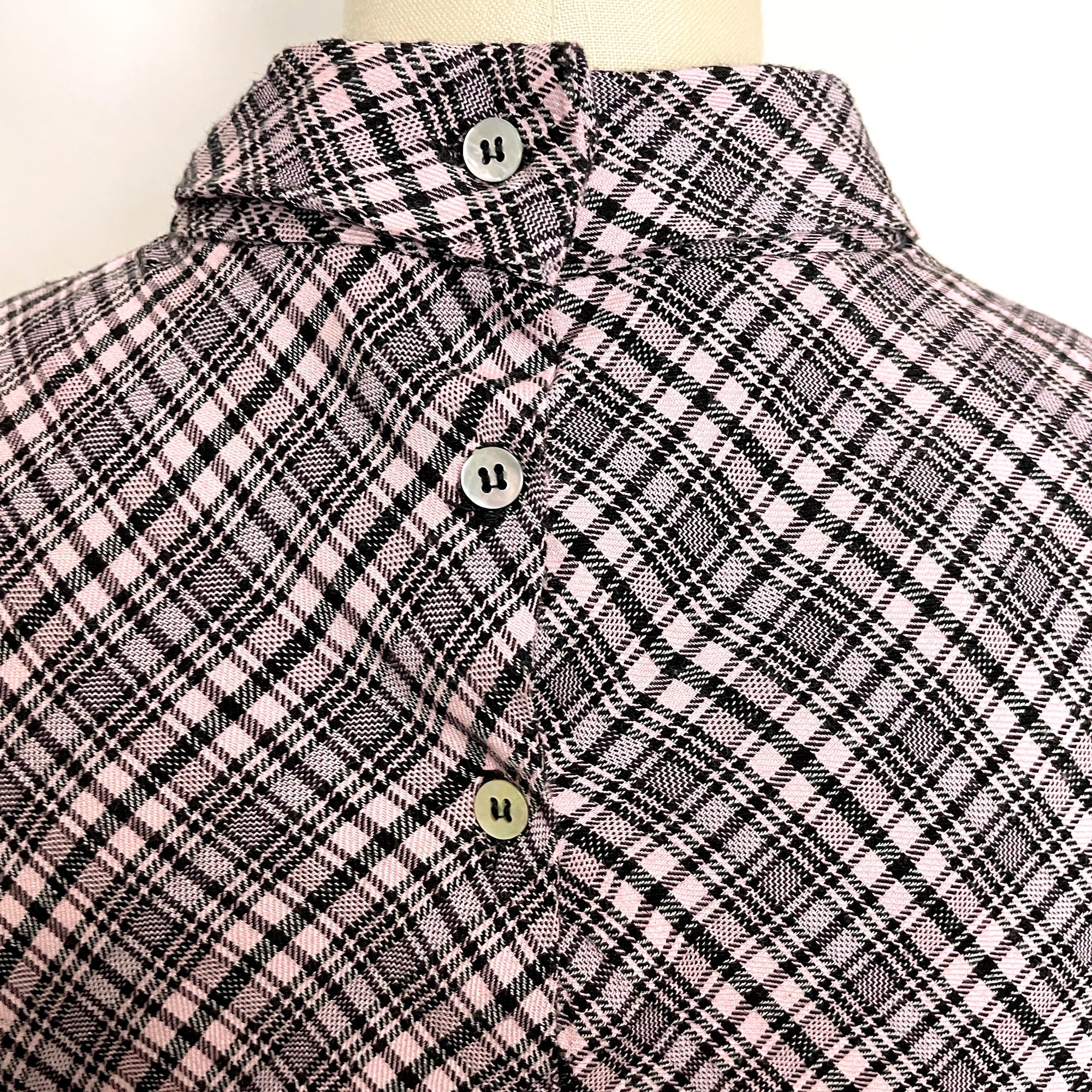 Pink and black plaid blouse with leg of mutton sleeves and high collar. Three back buttons at the neck. Plaid is set at a bias angle. The dress form doesn't do this one justice.