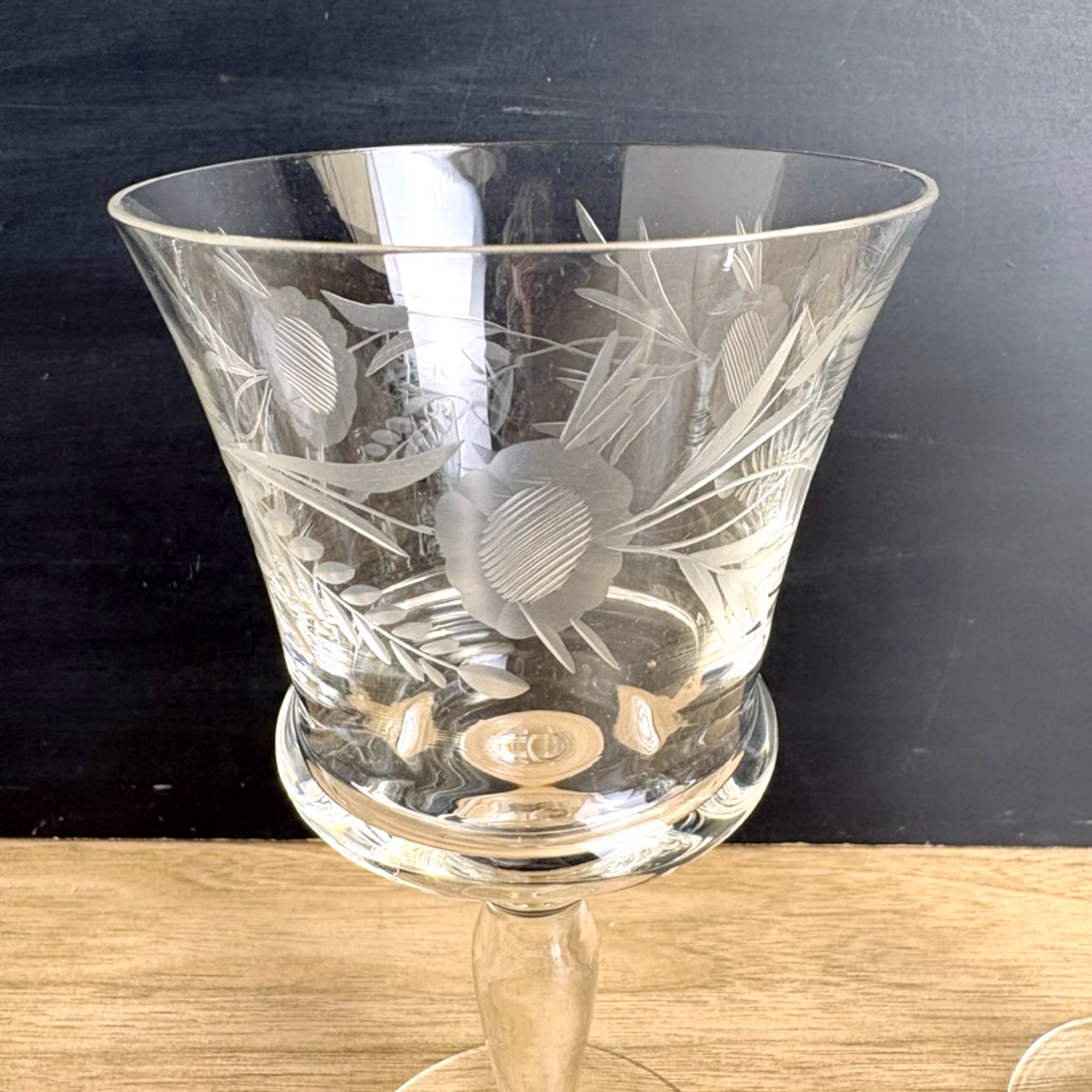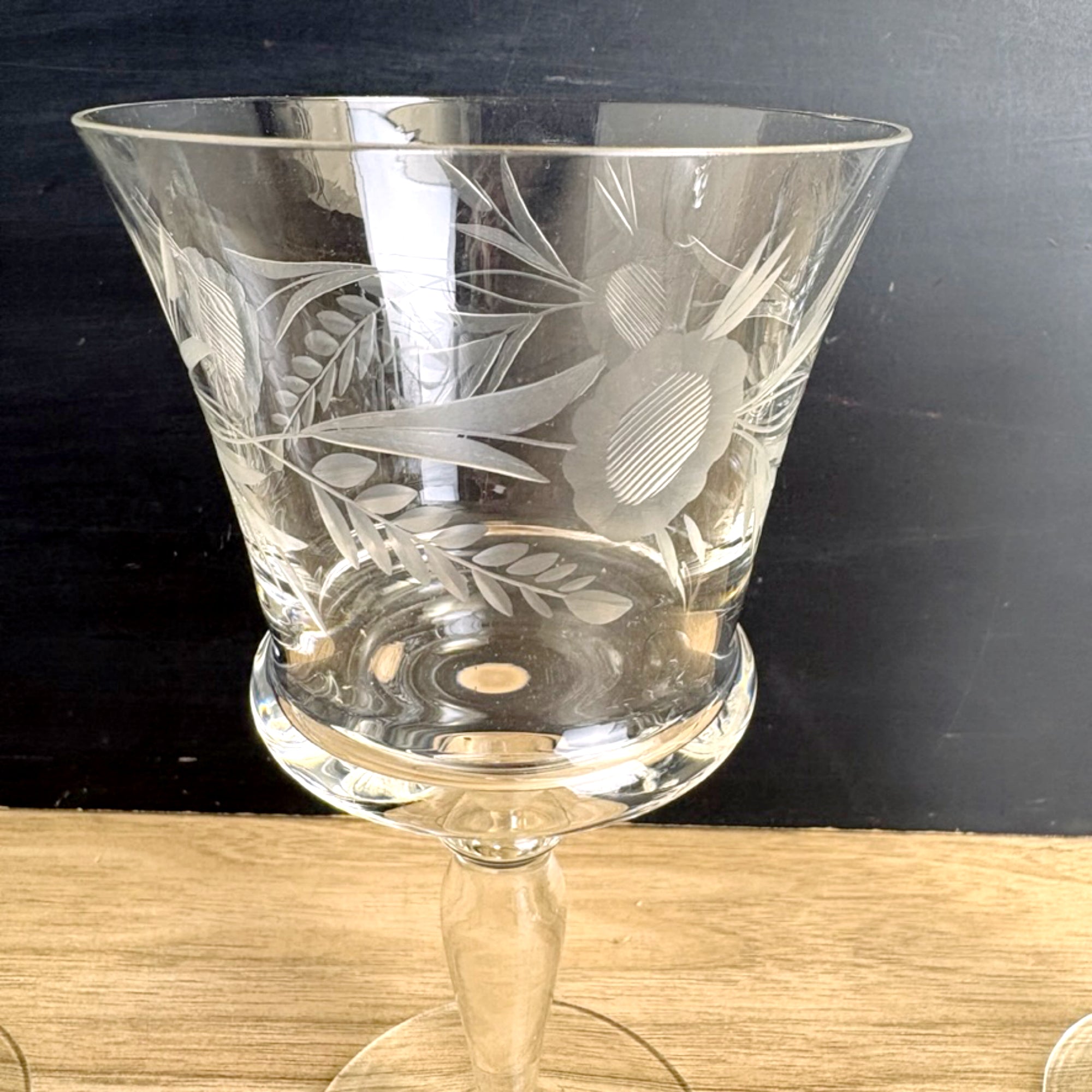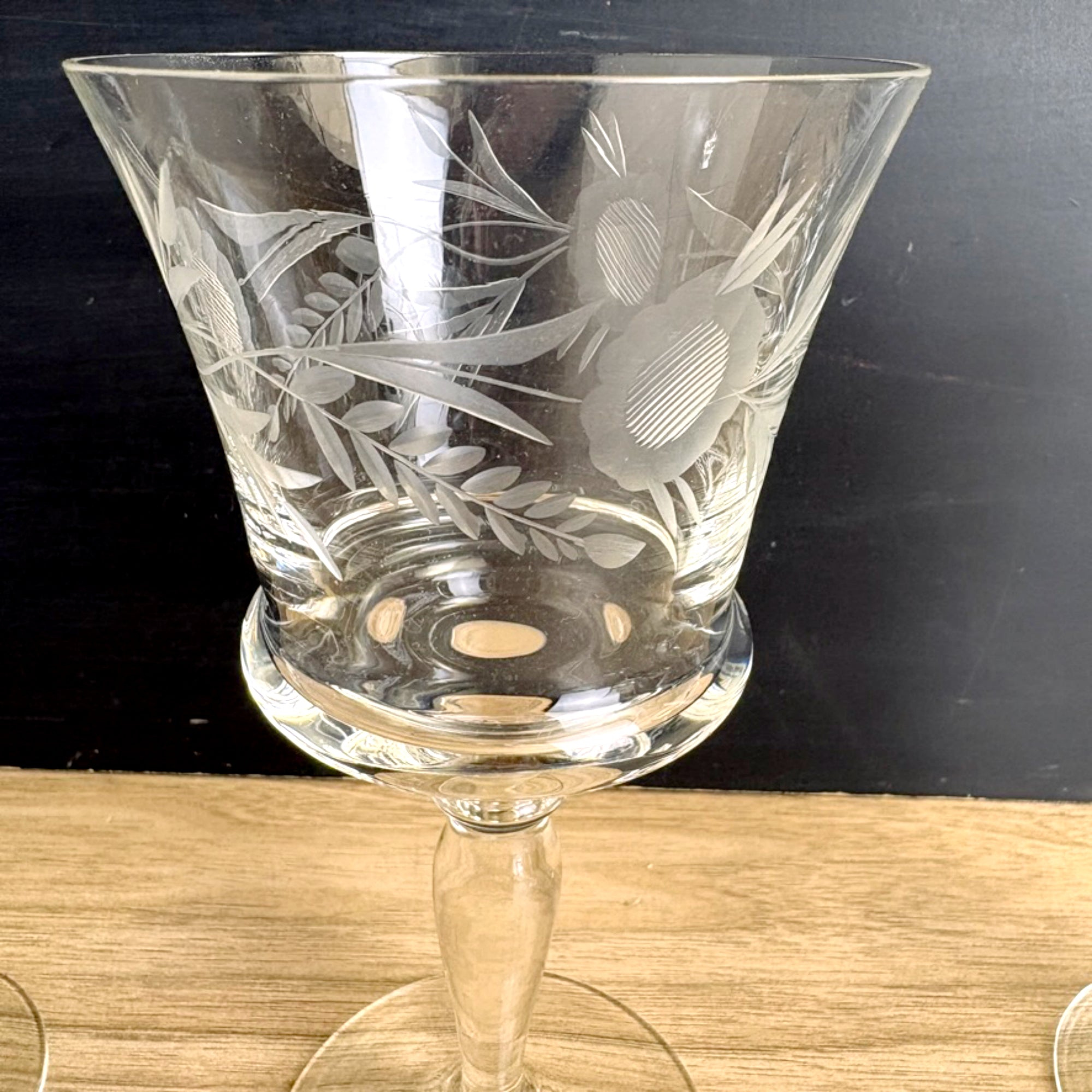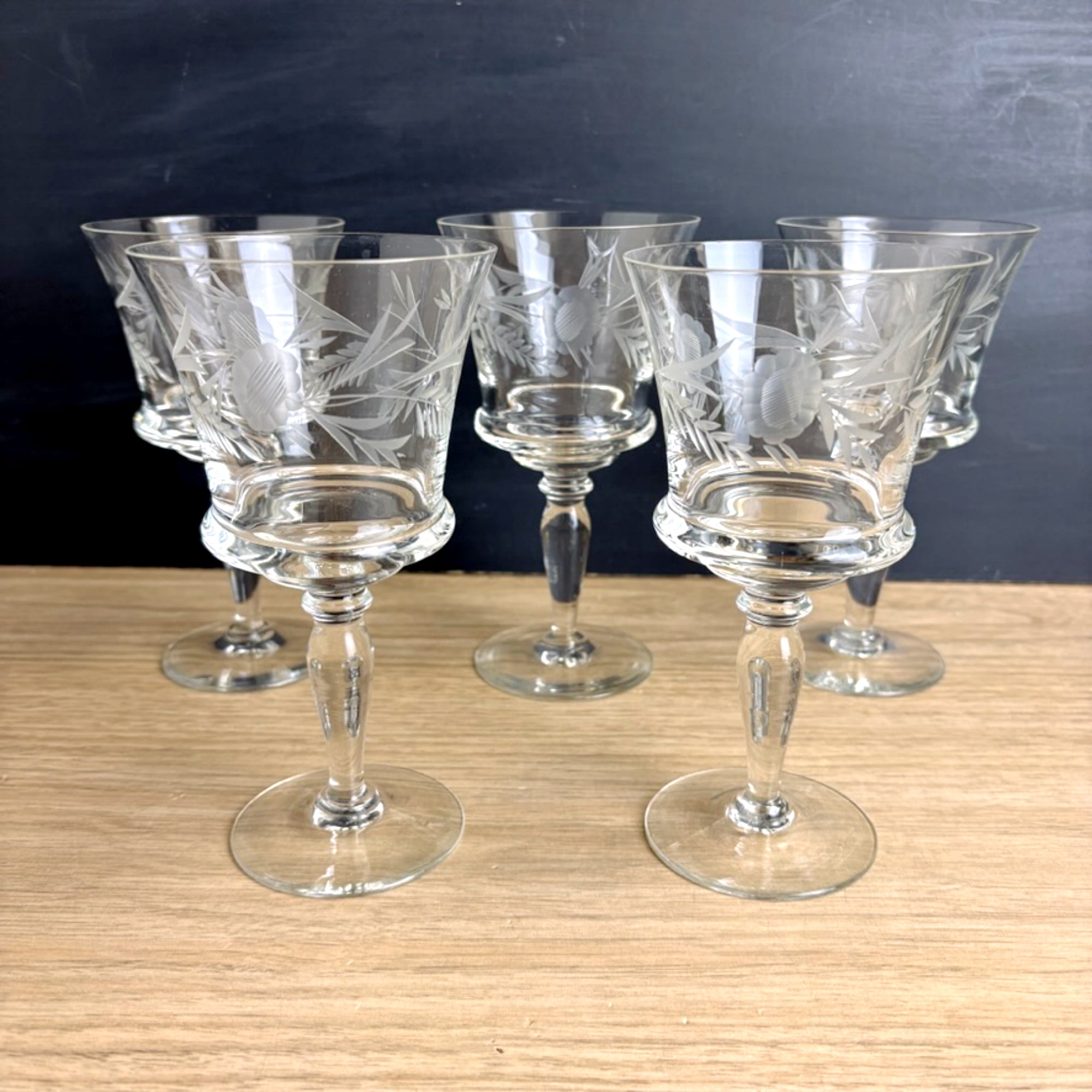 Set of five mid century vintage wine glasses. Each stem features a cut and needle-etched floral pattern on a distinctively flared bowl, a wafer stem, and a satisfyingly heavy base—an elegant, balanced silhouette that feels great in hand. Similar in profile to Arcadia stems (floral design does not match), these beauties mix effortlessly with modern and vintage tablescapes.