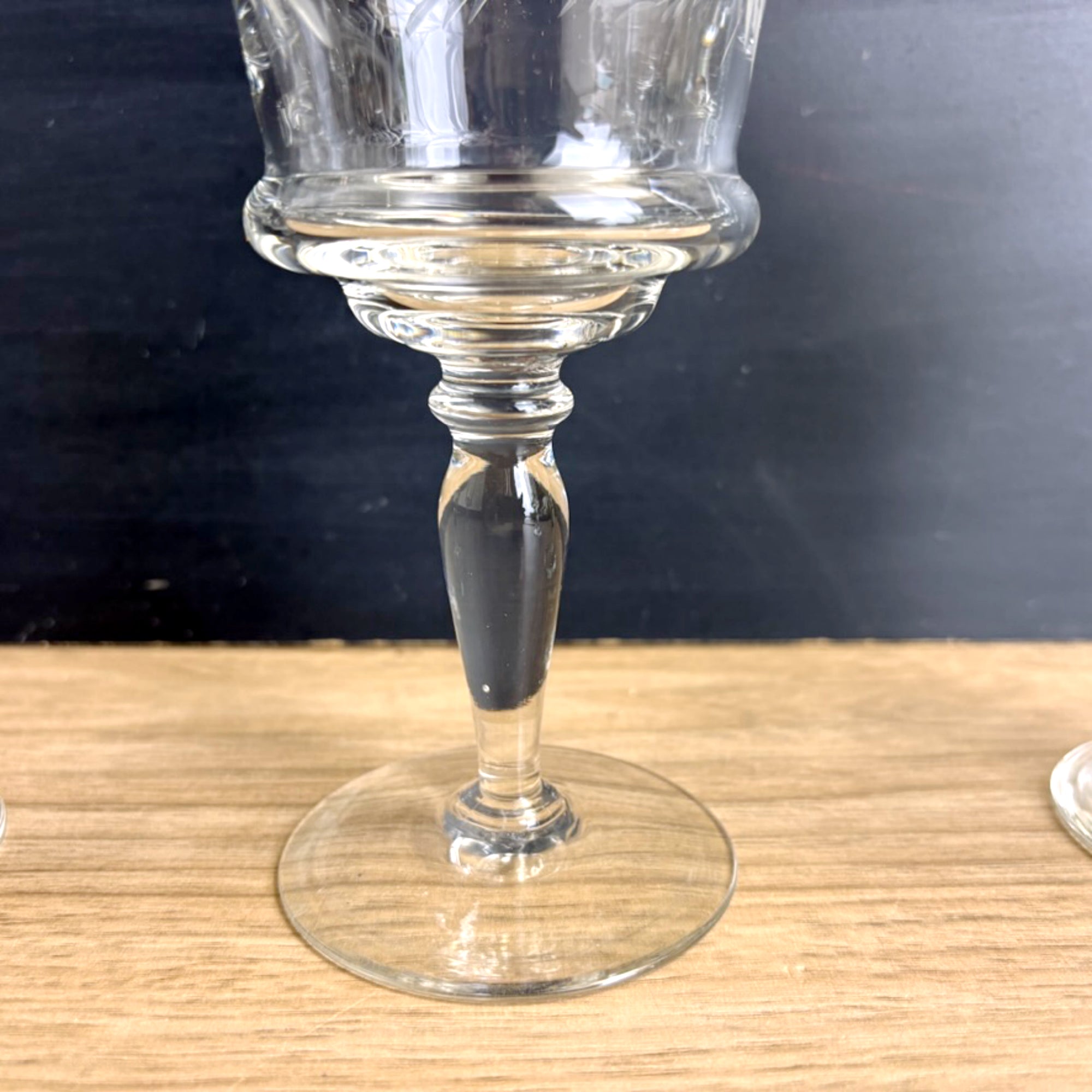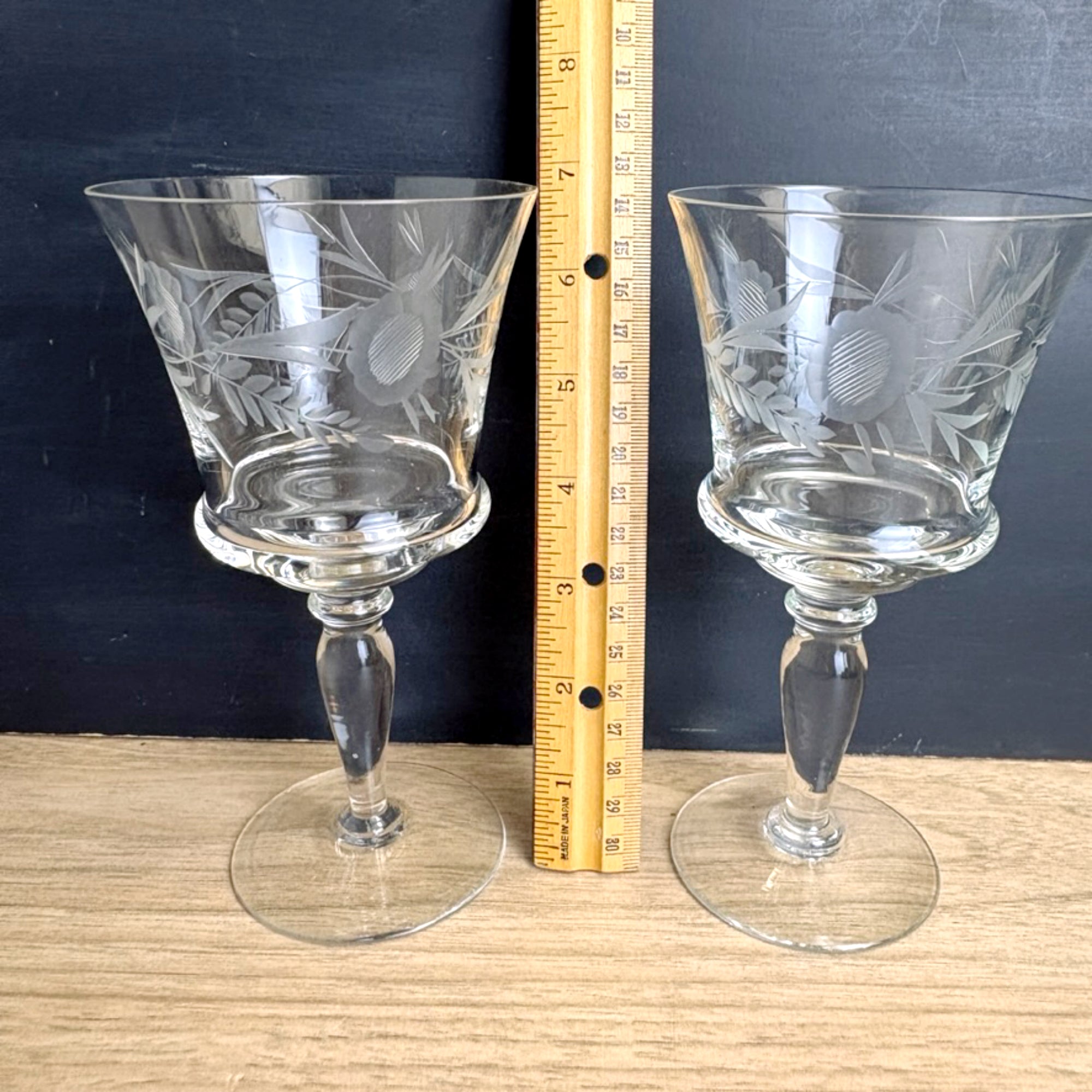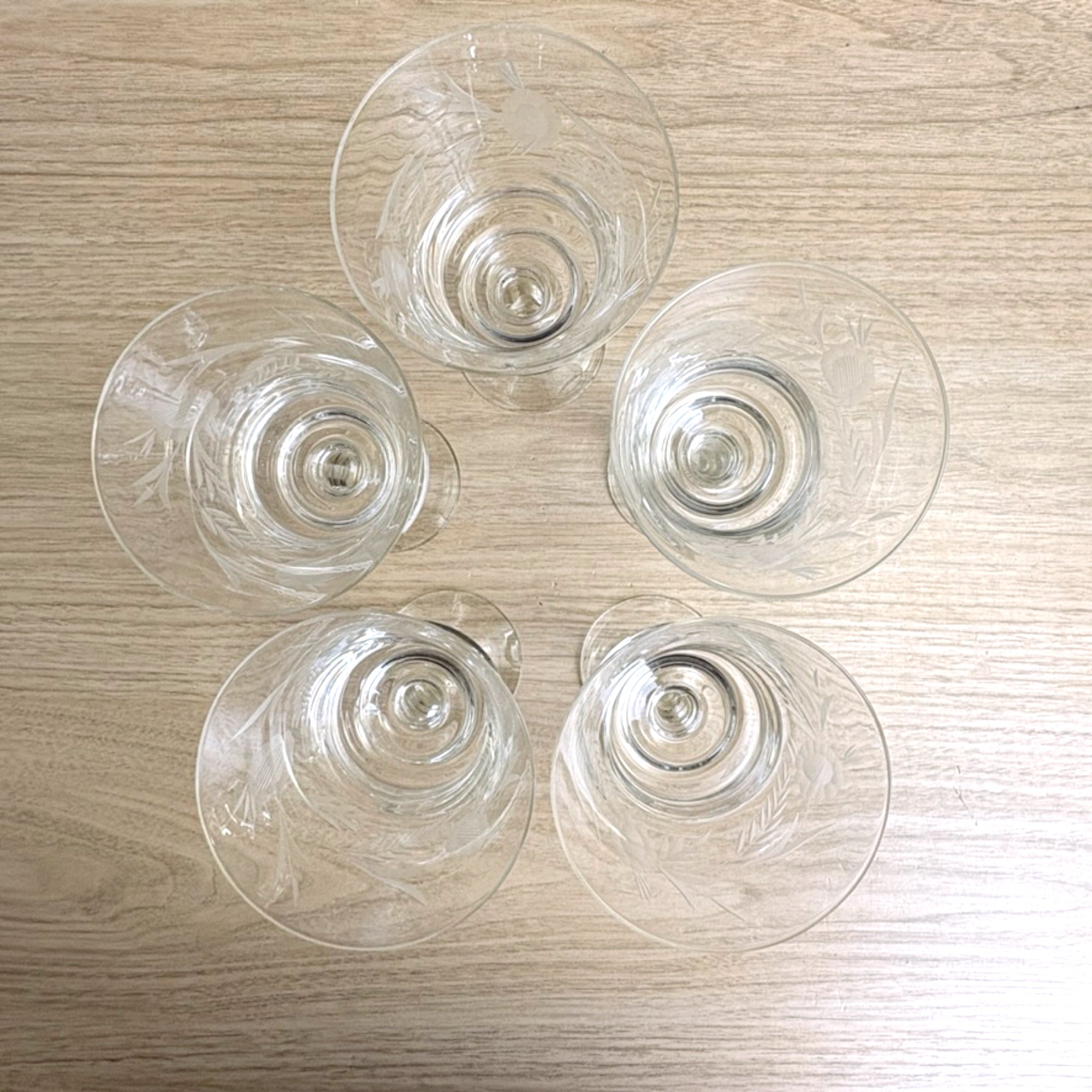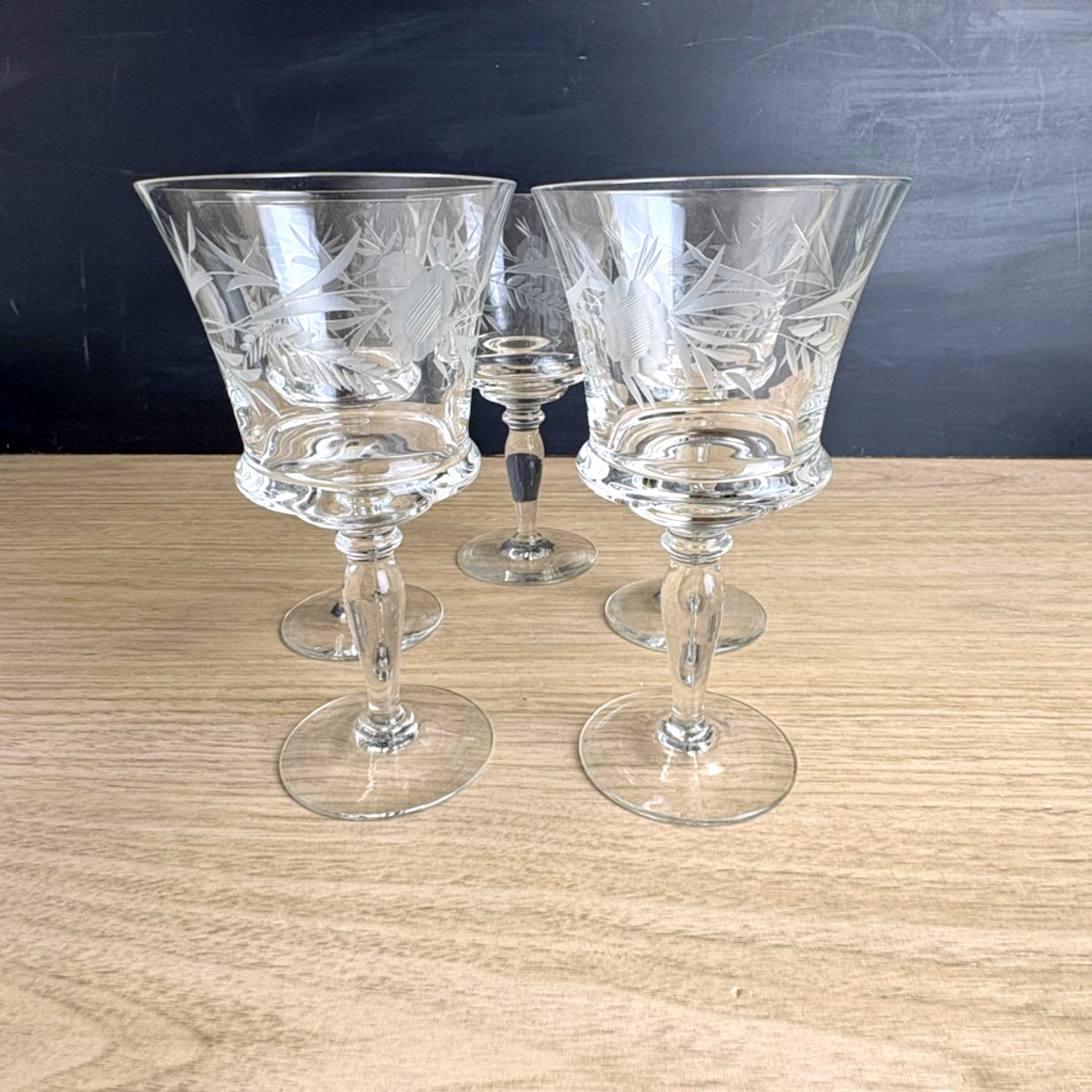 Set of five mid century vintage wine glasses. Each stem features a cut and needle-etched floral pattern on a distinctively flared bowl, a wafer stem, and a satisfyingly heavy base—an elegant, balanced silhouette that feels great in hand. Similar in profile to Arcadia stems (floral design does not match), these beauties mix effortlessly with modern and vintage tablescapes.