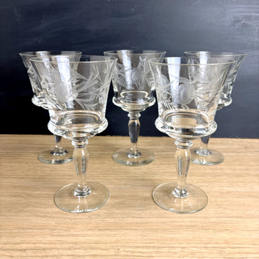 Mid century floral cut wine glasses - set of 5 - vintage barware